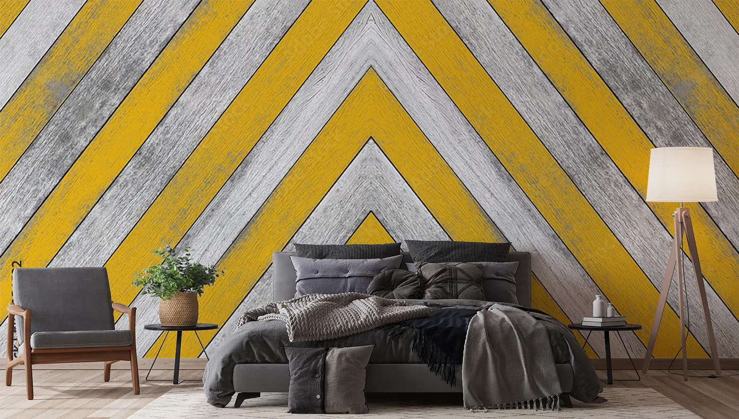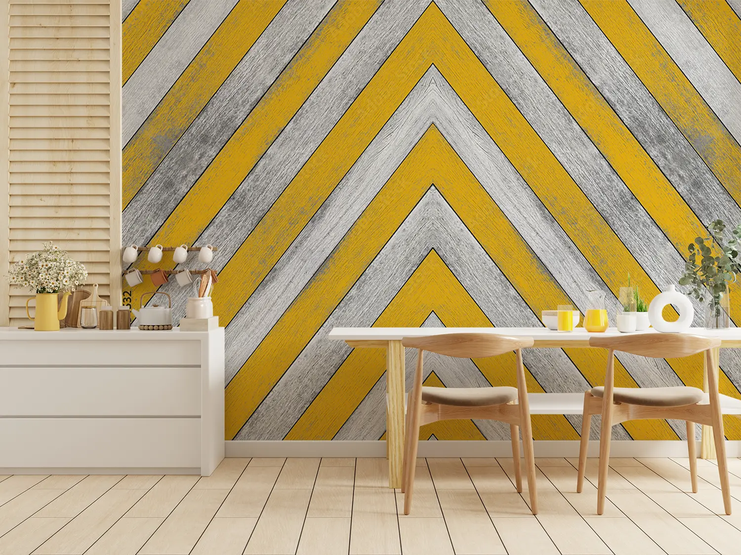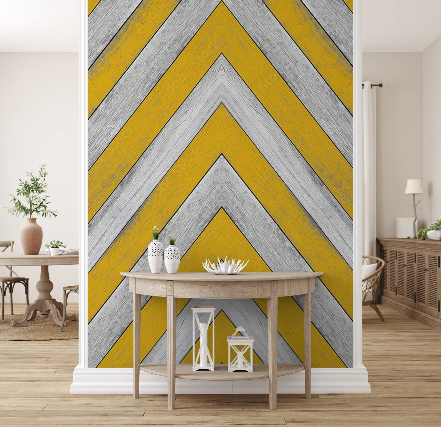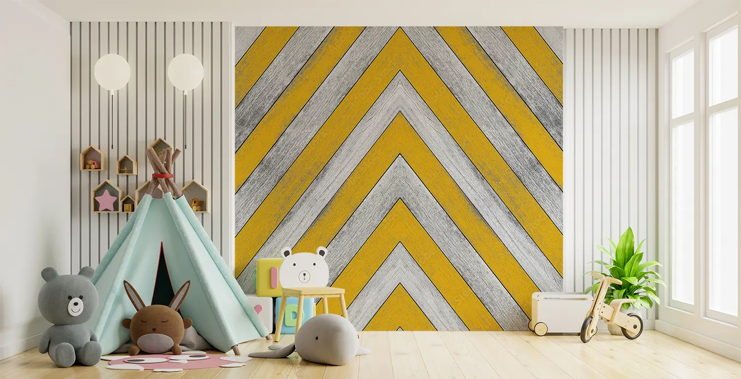 Elevate your space with this stunning yellow and white chevron pattern with a stylish gray stripe. This eye-catching design adds a modern touch to any room, perfect for home decor enthusiasts seeking a trendy aesthetic. Complementary colors to consider include soft gray, mustard yellow, and crisp white for a cohesive and inviting atmosphere.