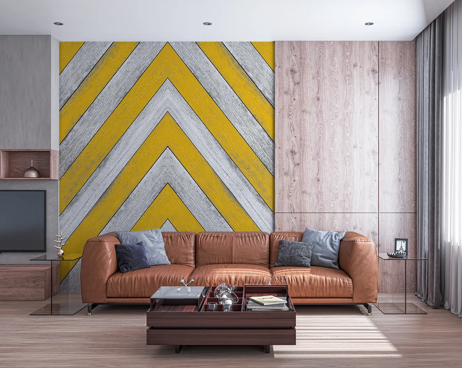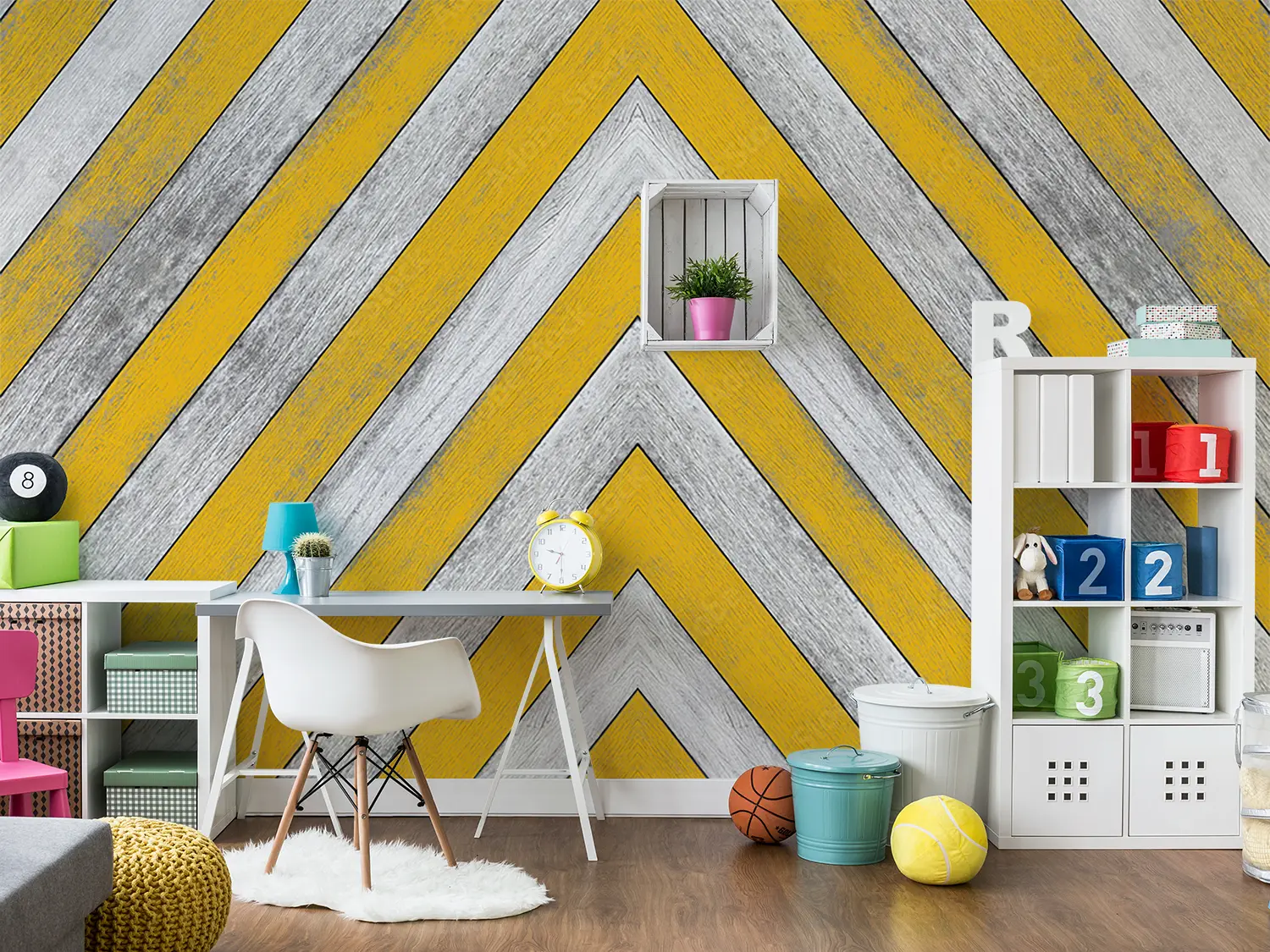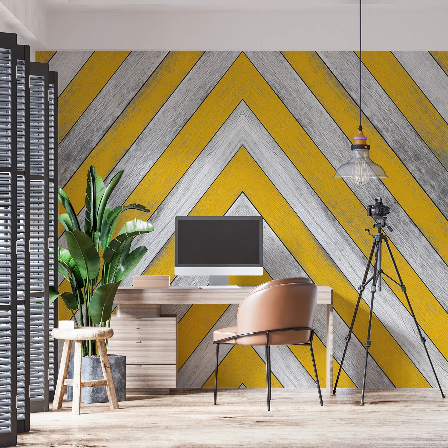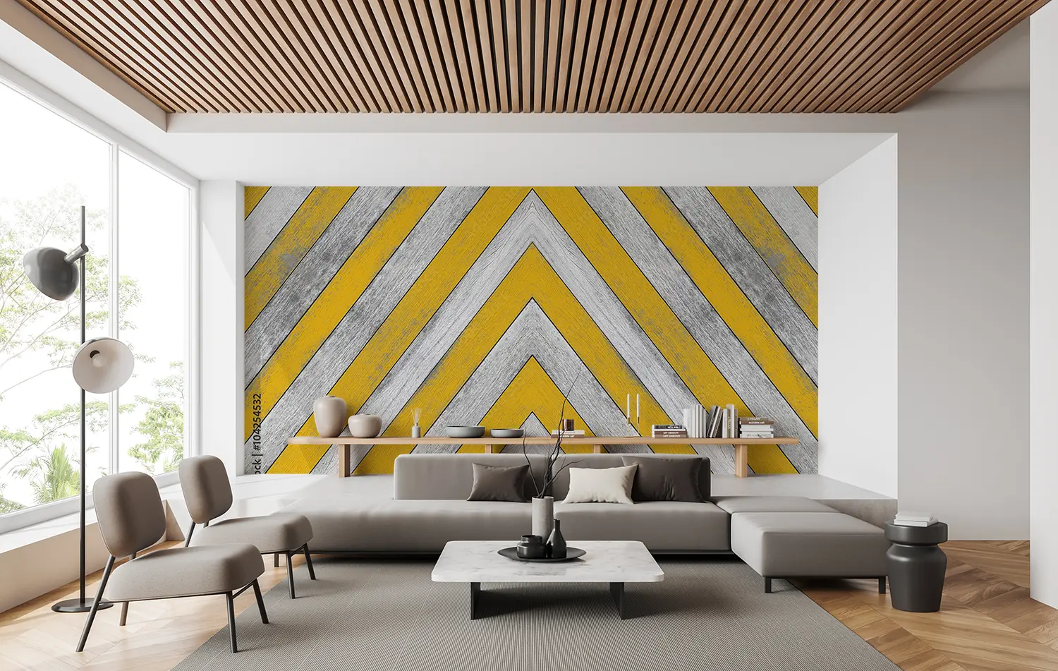 Elevate your space with this stunning yellow and white chevron pattern with a stylish gray stripe. This eye-catching design adds a modern touch to any room, perfect for home decor enthusiasts seeking a trendy aesthetic. Complementary colors to consider include soft gray, mustard yellow, and crisp white for a cohesive and inviting atmosphere.