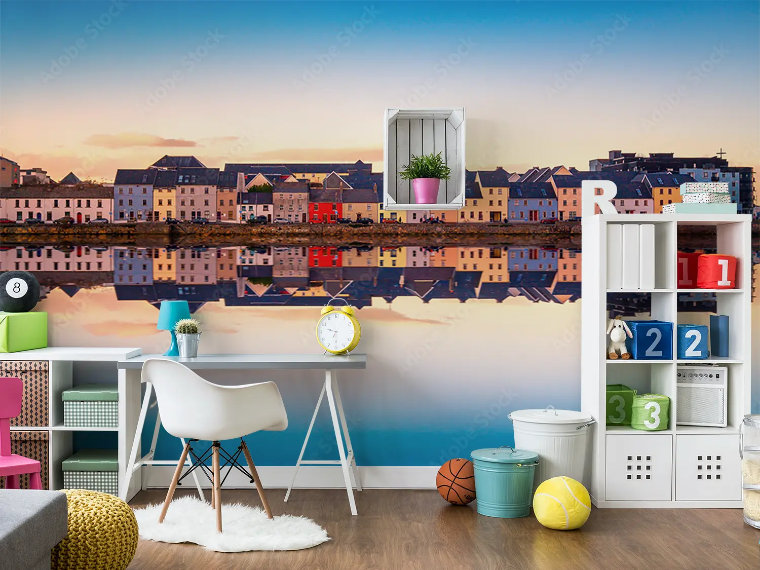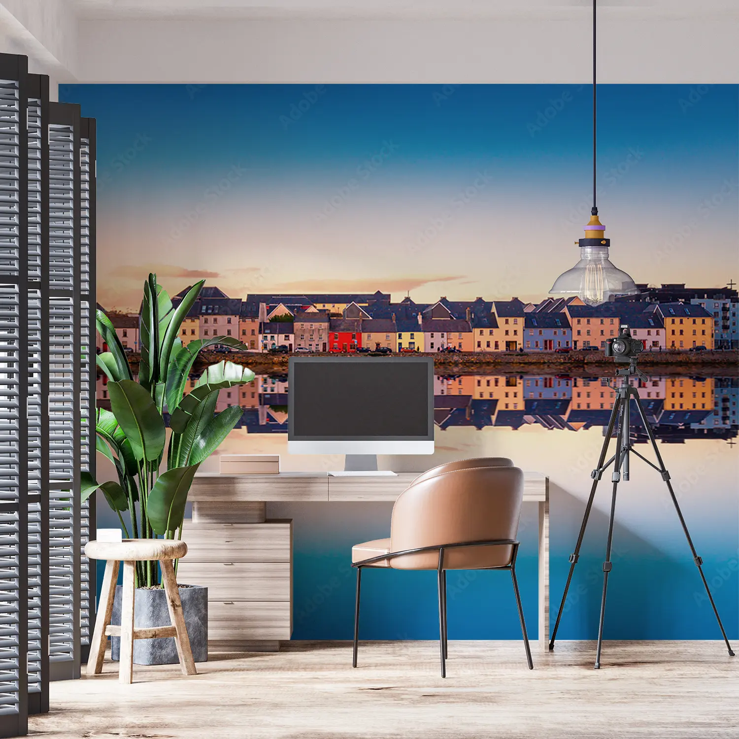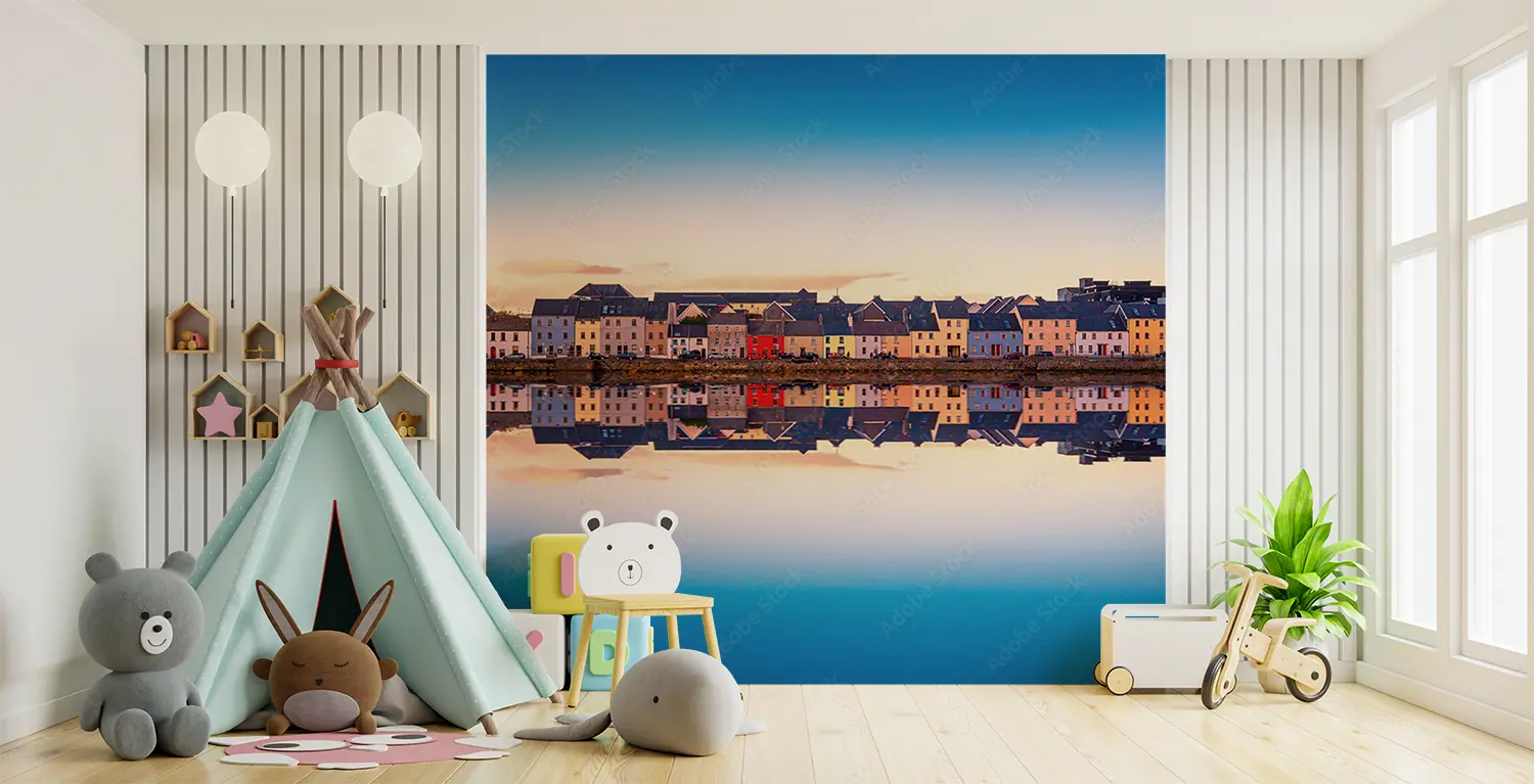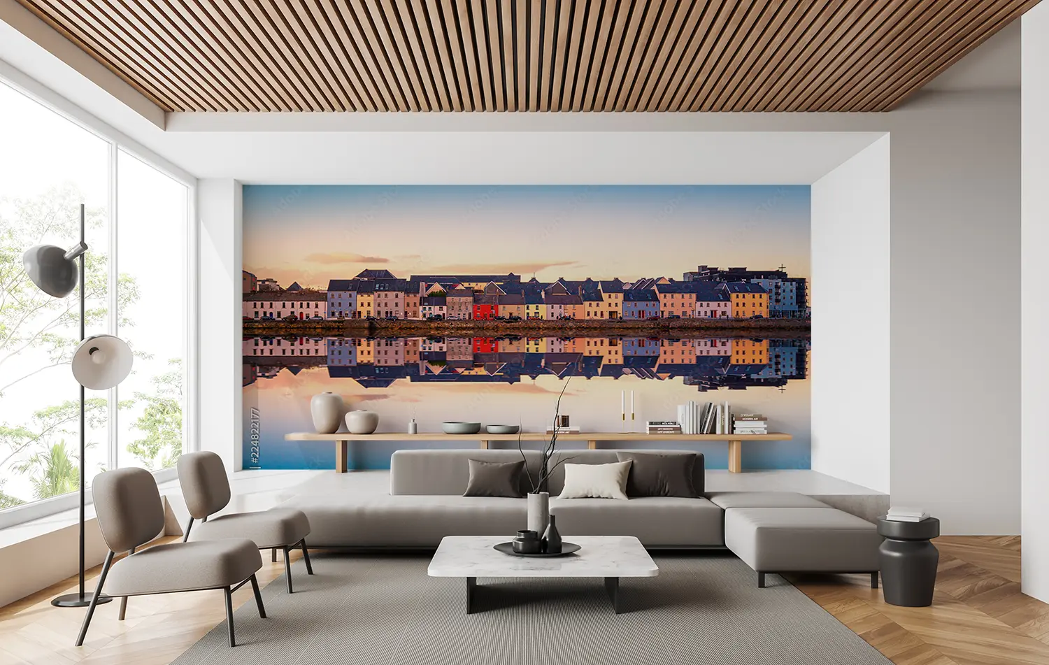 Transform your space with this captivating cityscape wall art featuring a serene lake and charming buildings. The reflective water adds depth and tranquility to any room, making it a perfect addition to your home decor. Complementary colors include soft blues, earthy browns, and warm neutrals to enhance the calming ambiance of this beautiful scene.