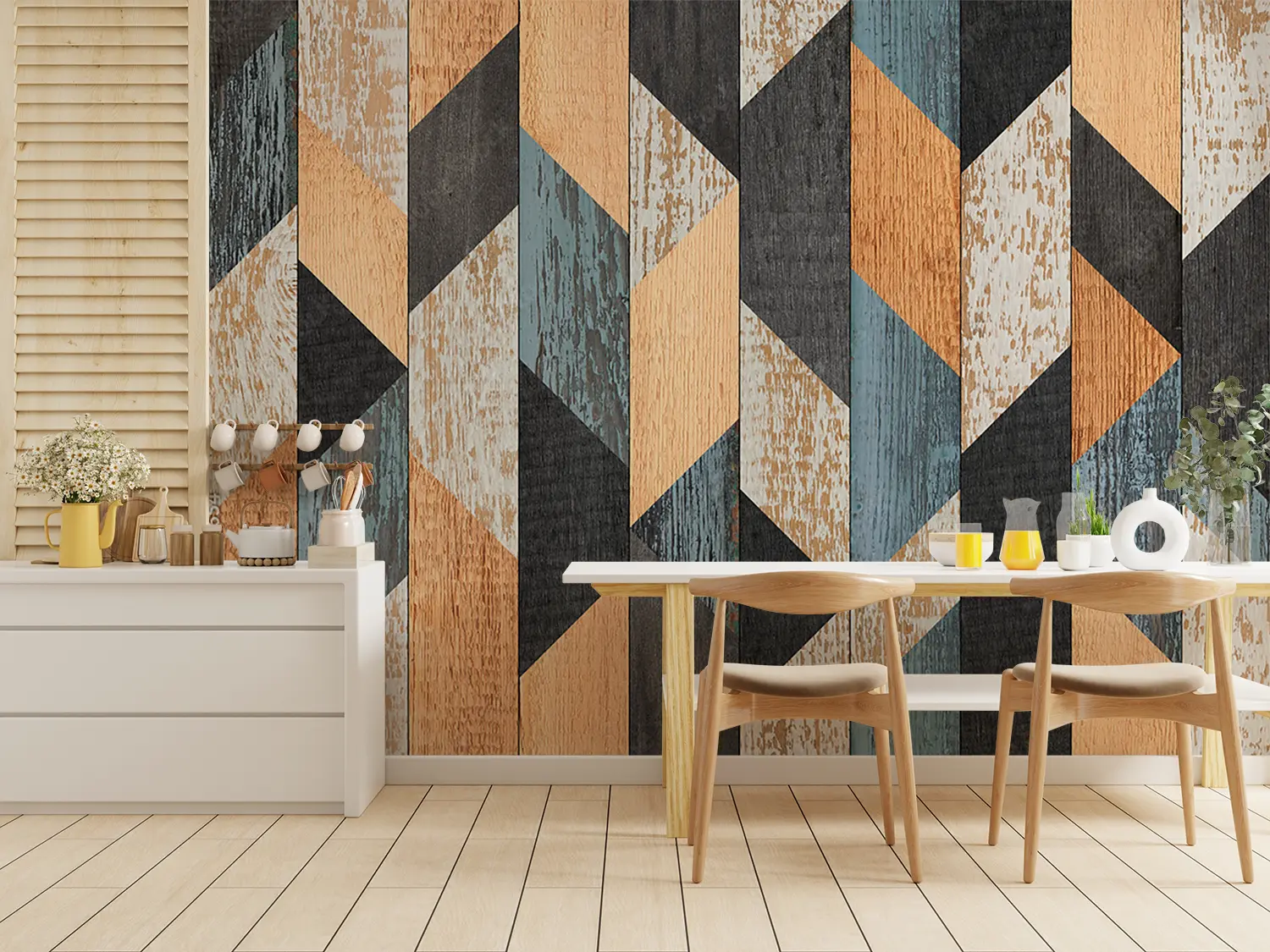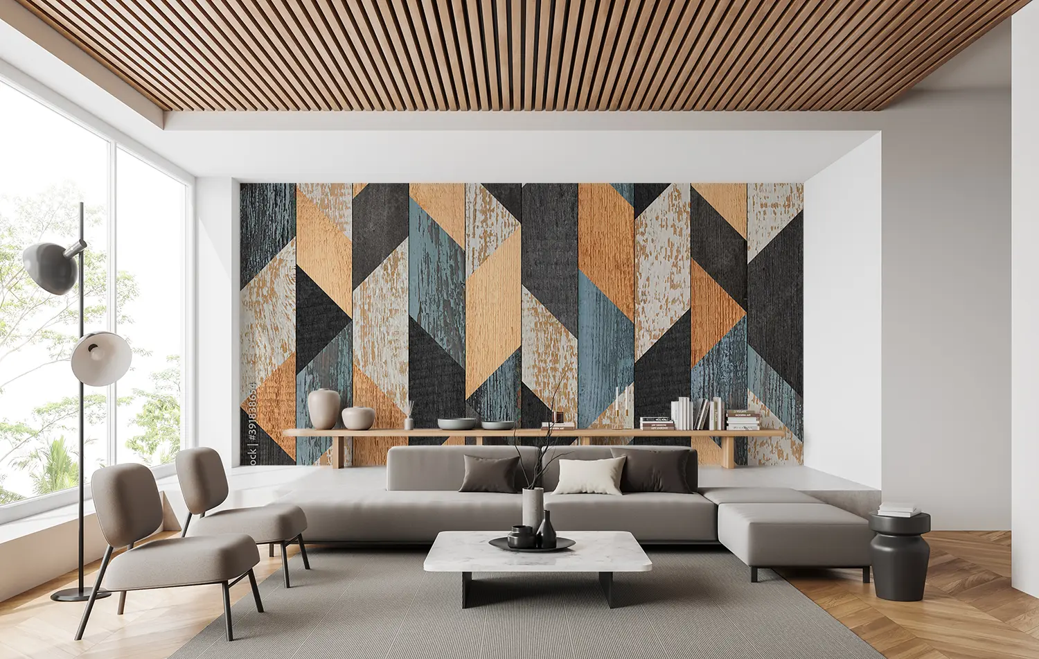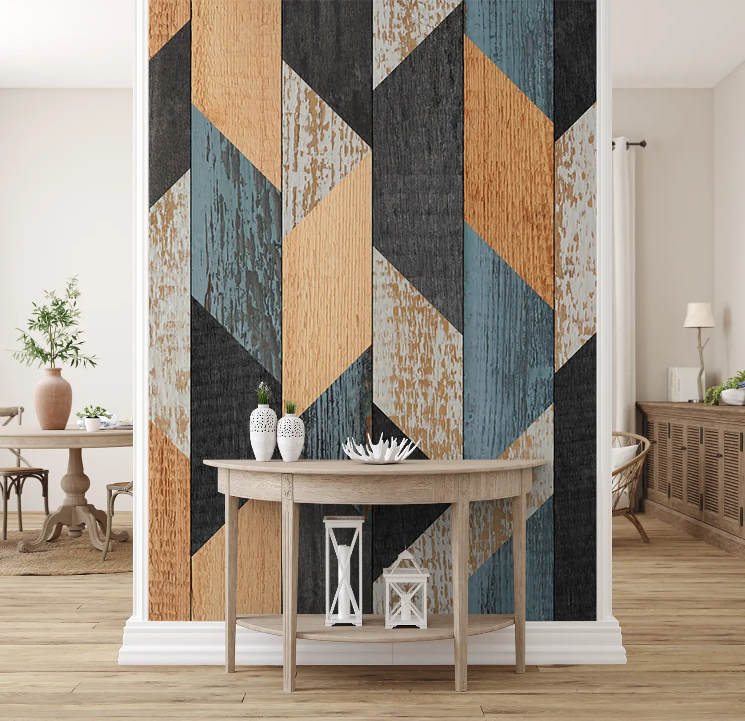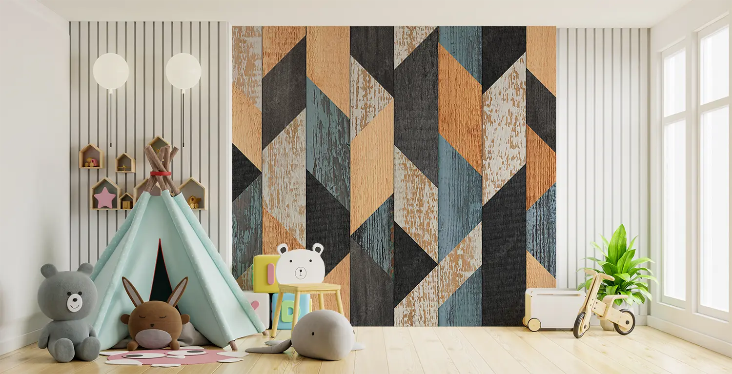 Enhance your home decor with this stunning wood panel wall featuring a vibrant geometric pattern of blue, orange, and brown hues. The intricate design adds a touch of modern elegance to any room. Complement the look with accent colors like black, beige, and earthy tones for a harmonious and stylish living space.