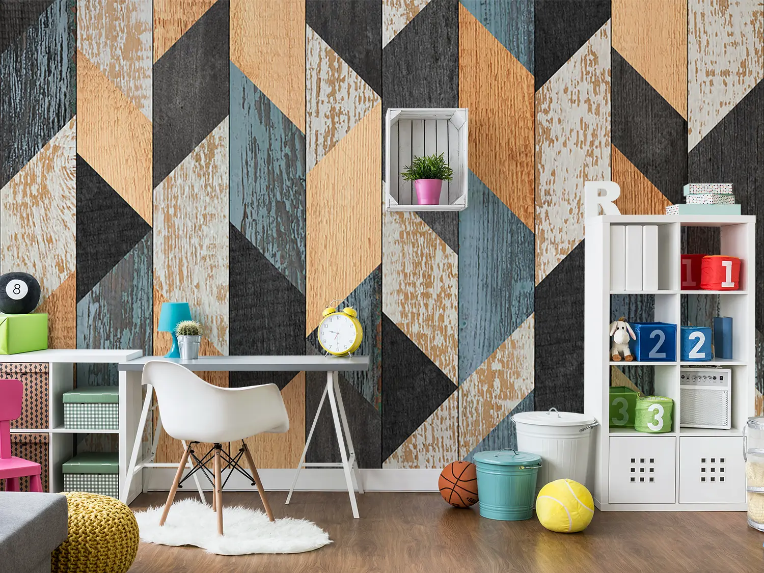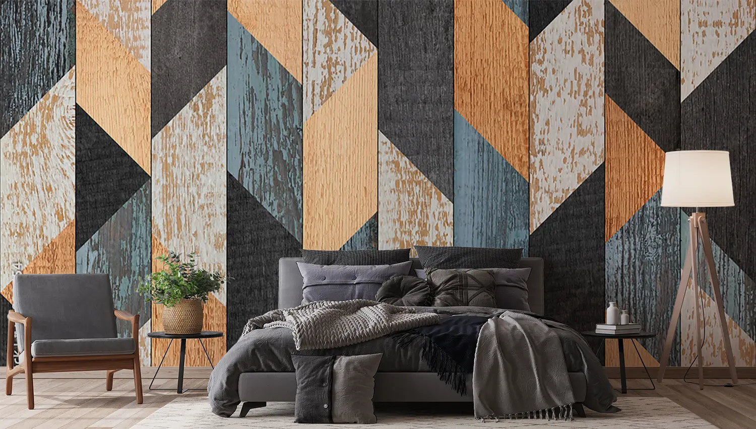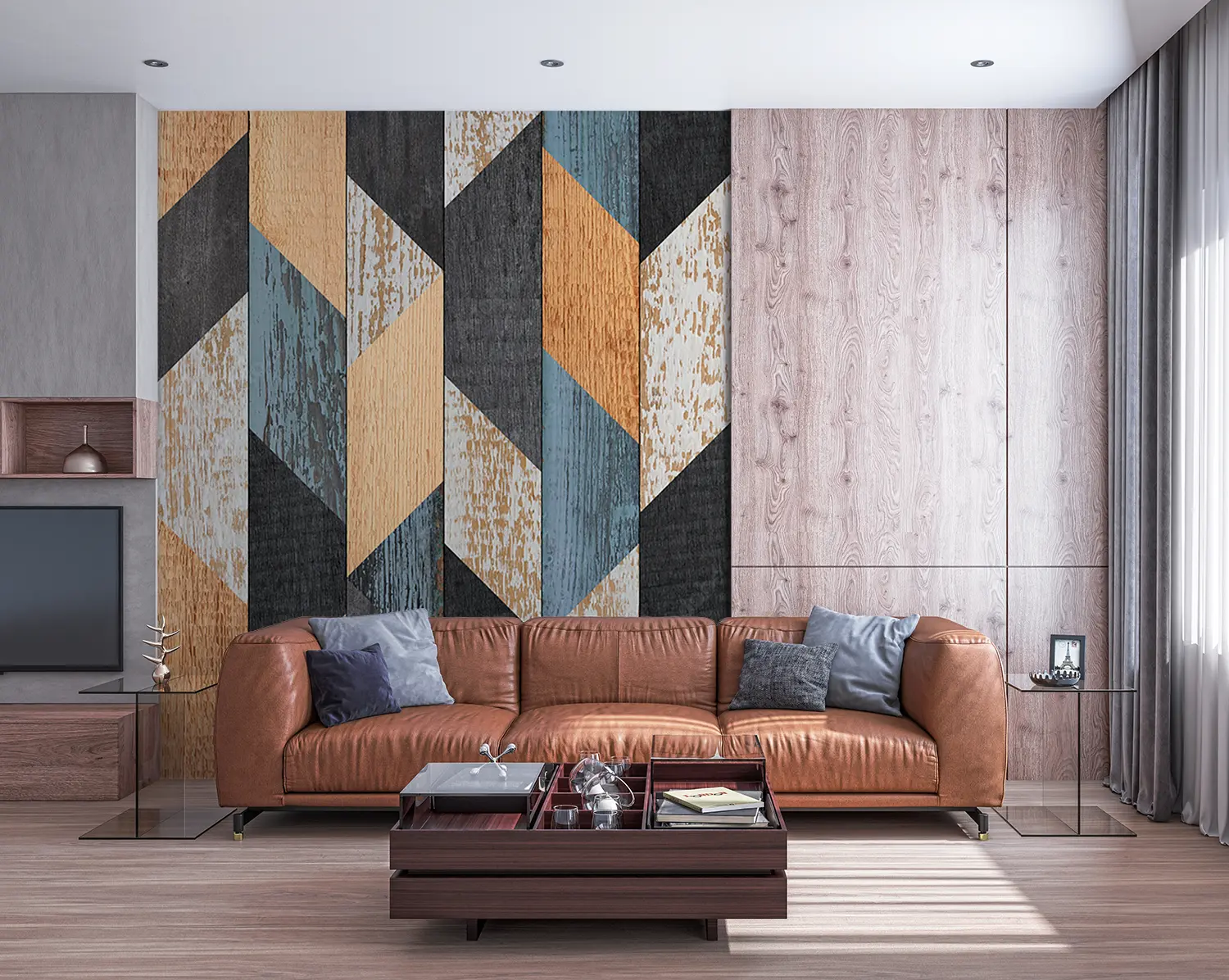 Enhance your home decor with this stunning wood panel wall featuring a vibrant geometric pattern of blue, orange, and brown hues. The intricate design adds a touch of modern elegance to any room. Complement the look with accent colors like black, beige, and earthy tones for a harmonious and stylish living space.