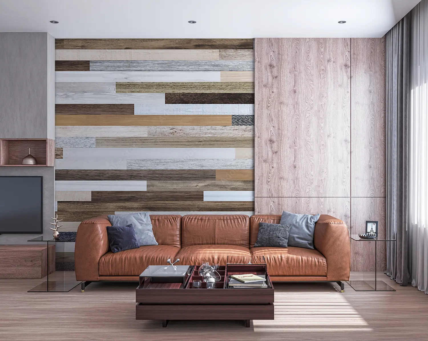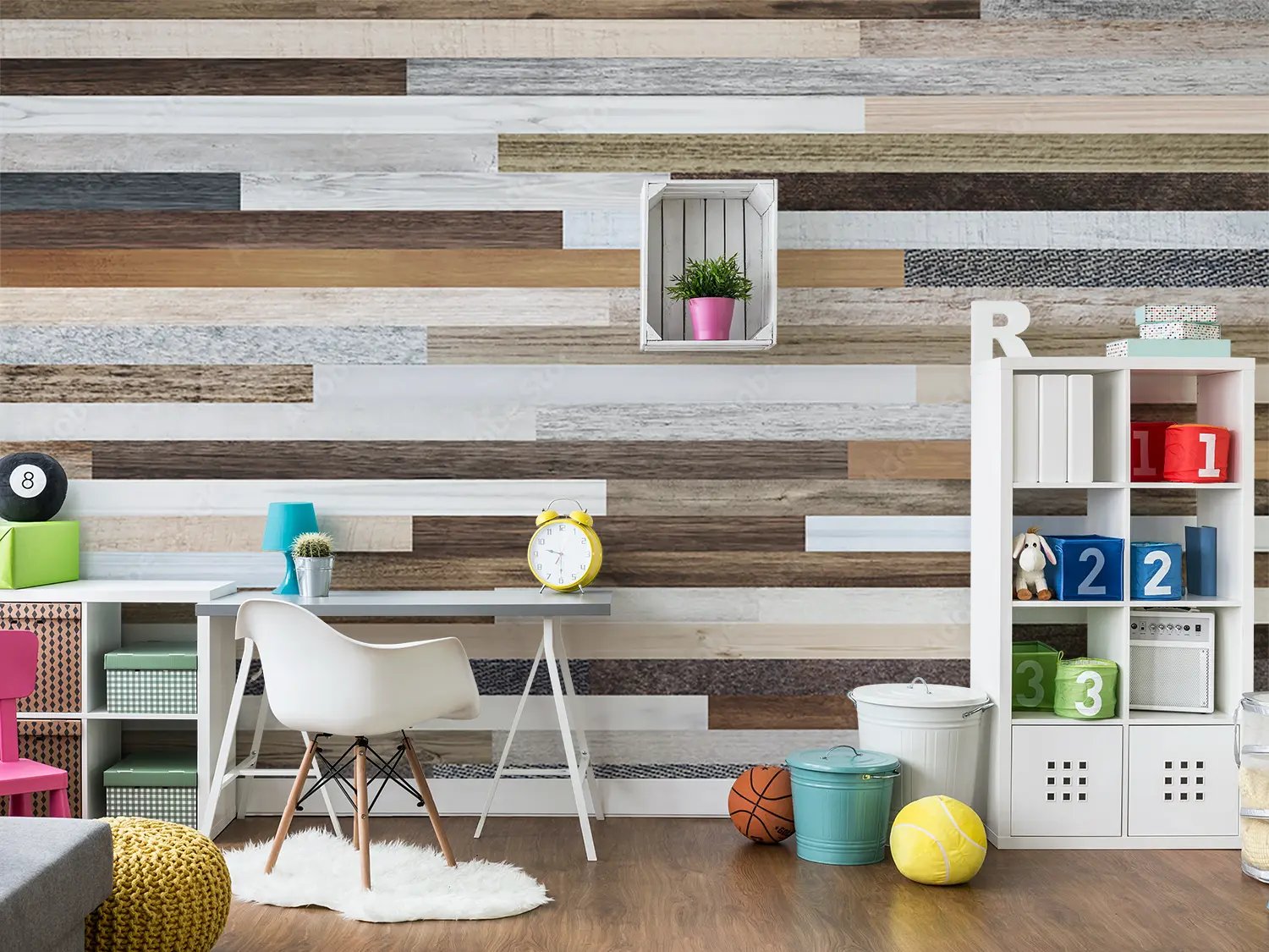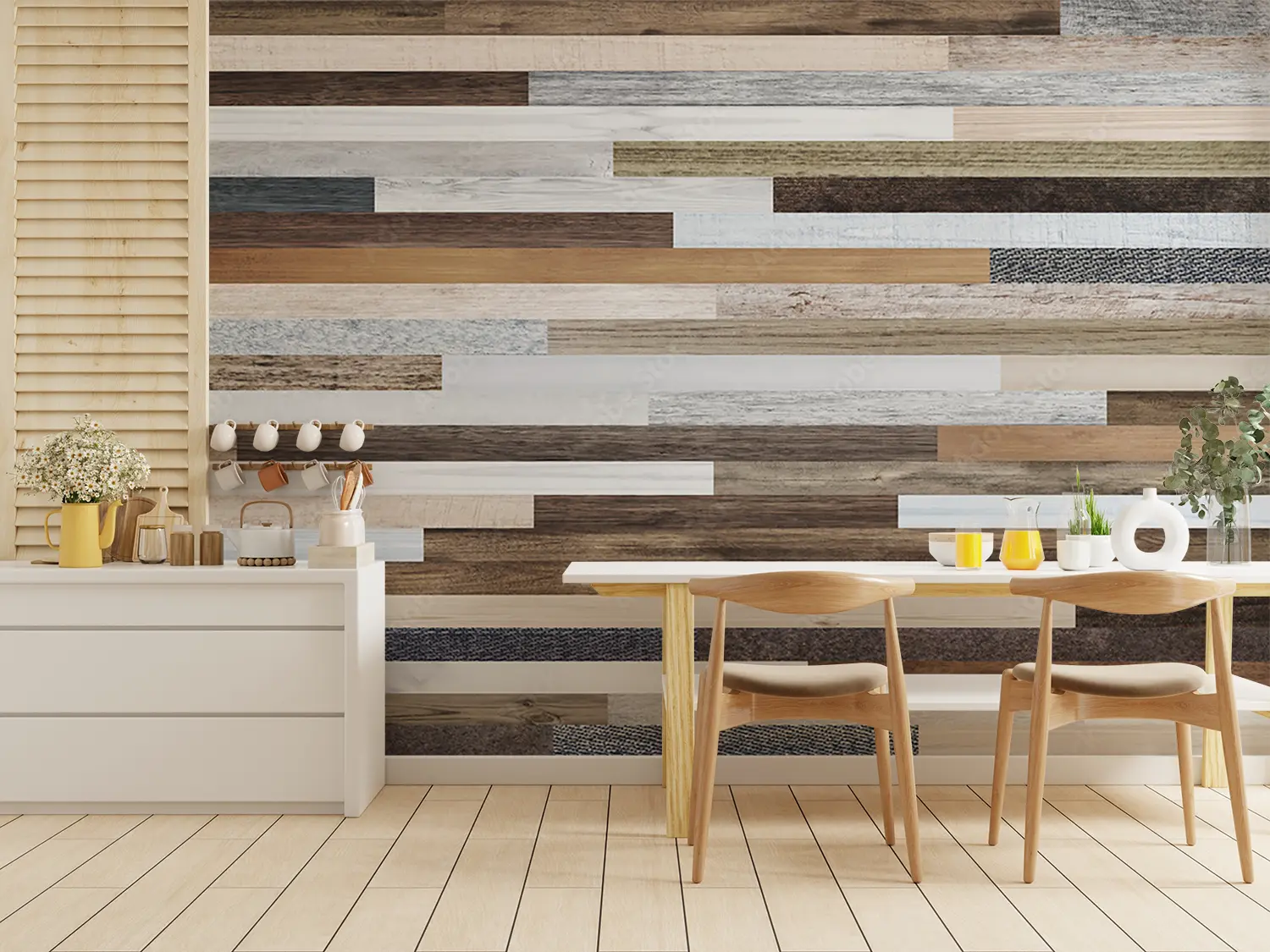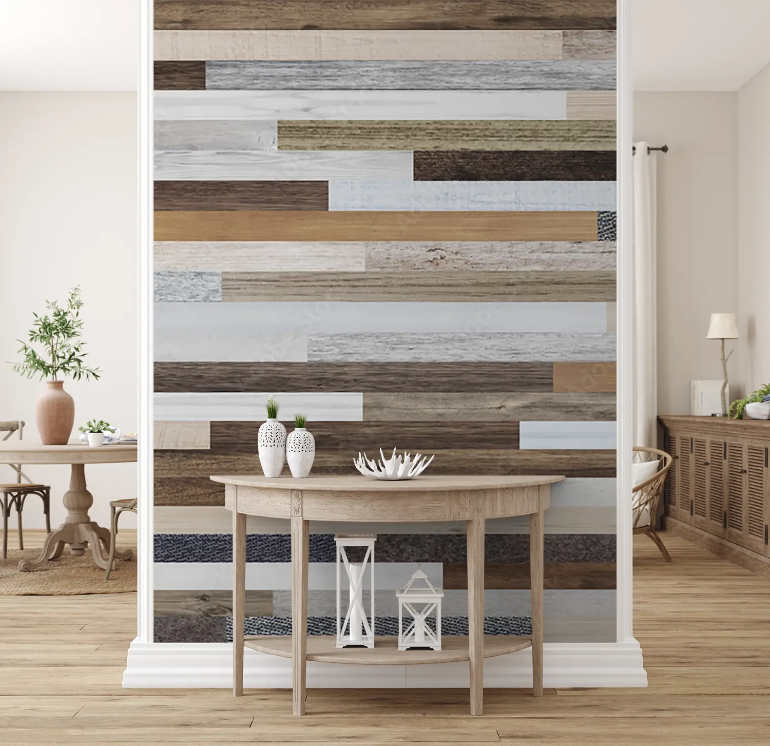 Transform your space with a captivating wood panel wall featuring a variety of colors. This unique design adds warmth and character to any room, making it a standout piece of home decor. Complementary colors to consider include shades of grey, brown, and earthy tones to enhance the overall aesthetic appeal of your living space.