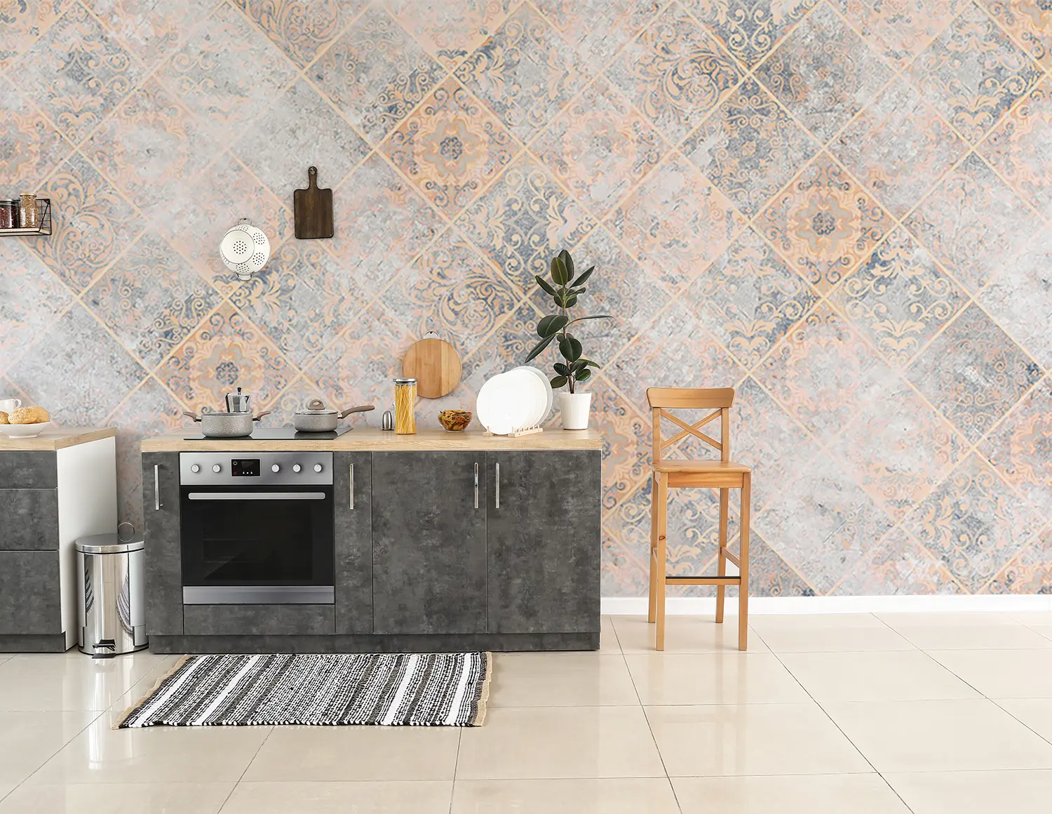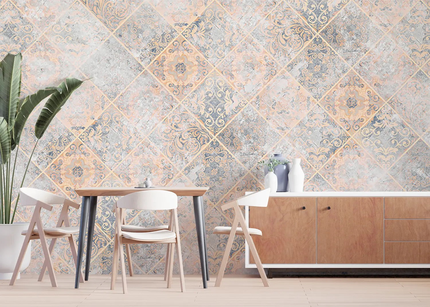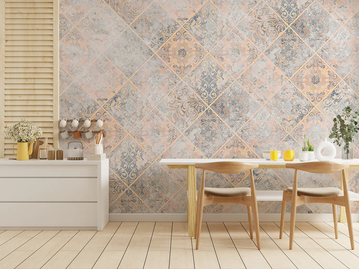 Transform your living space with the exquisite beauty of a diamond-patterned wall design. This captivating wallpaper features a blend of soft blues, oranges, and neutral tones, adding a touch of sophistication to any room. Elevate your home decor with this stylish and timeless piece that complements a variety of color schemes and interior styles.