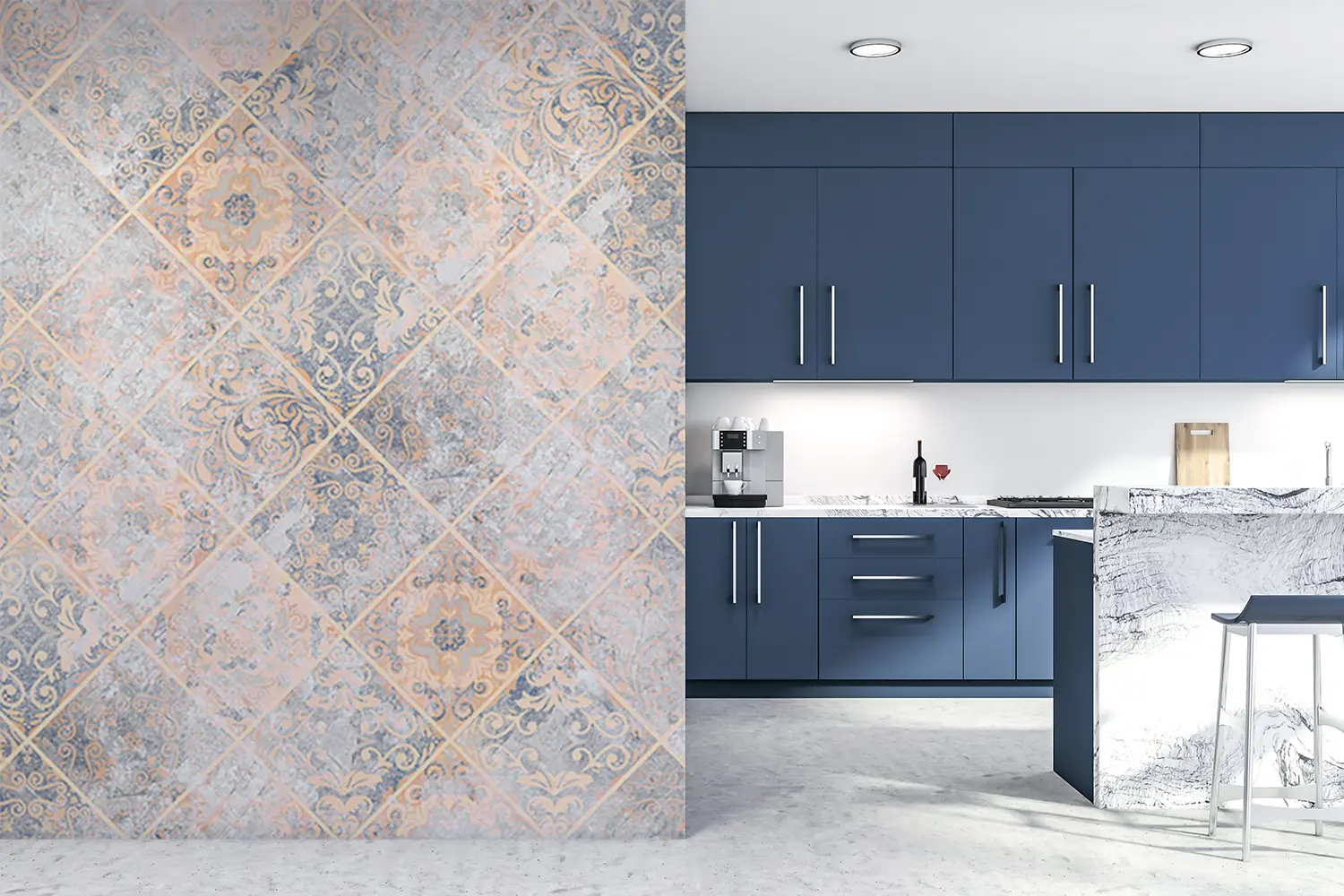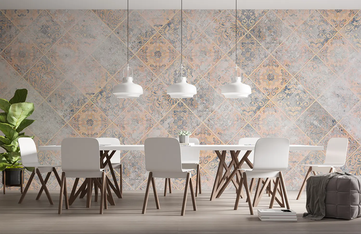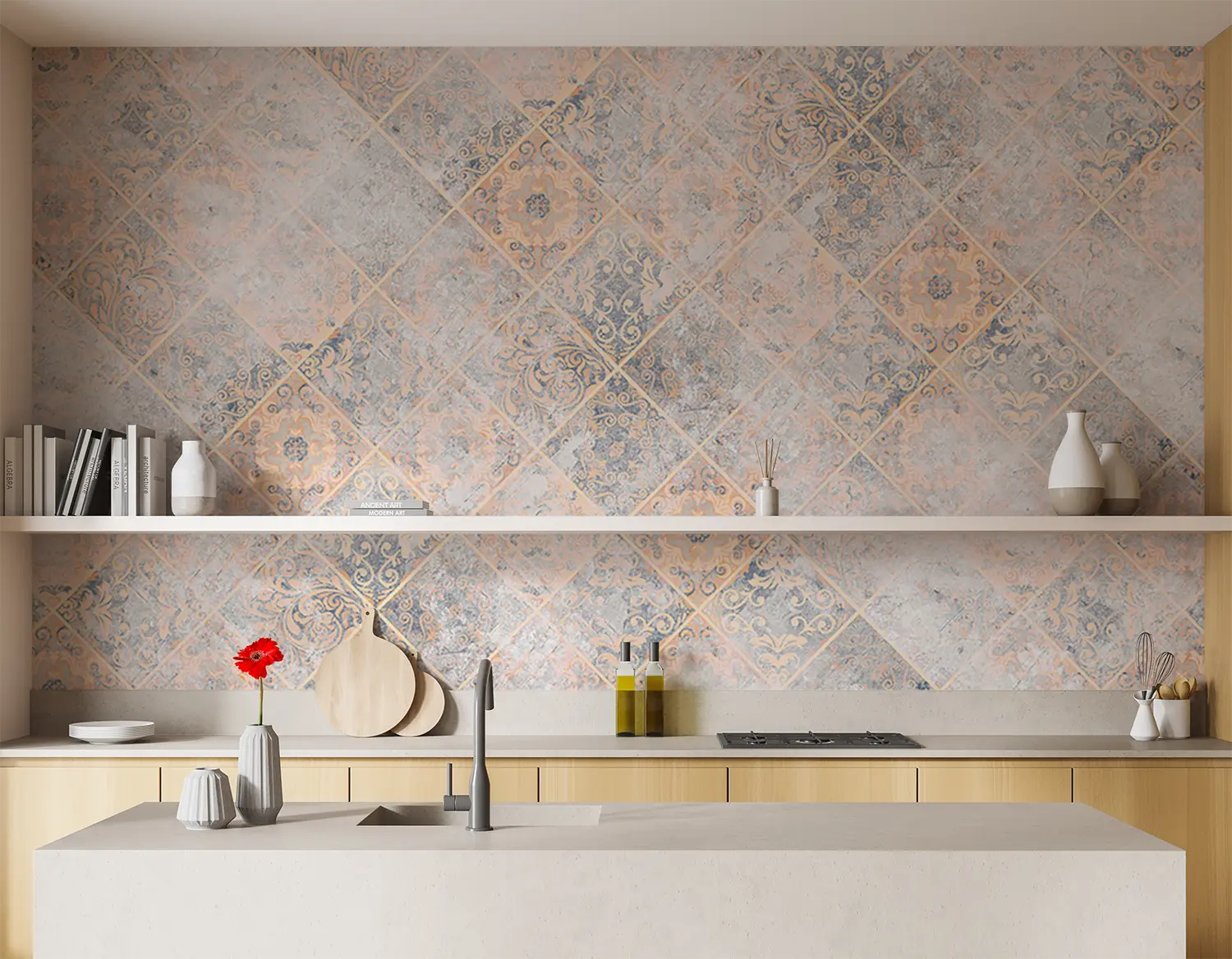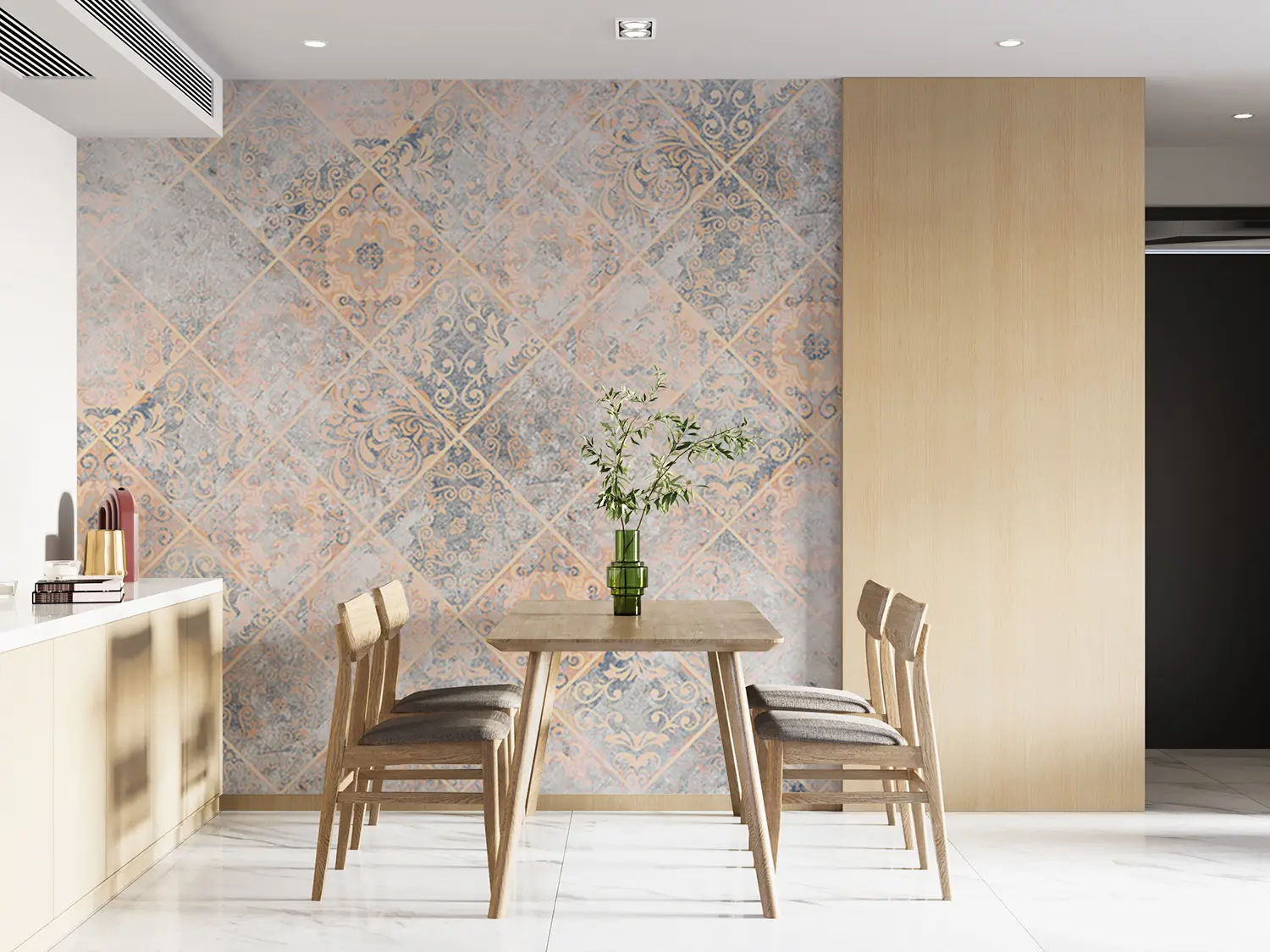 Transform your living space with the exquisite beauty of a diamond-patterned wall design. This captivating wallpaper features a blend of soft blues, oranges, and neutral tones, adding a touch of sophistication to any room. Elevate your home decor with this stylish and timeless piece that complements a variety of color schemes and interior styles.