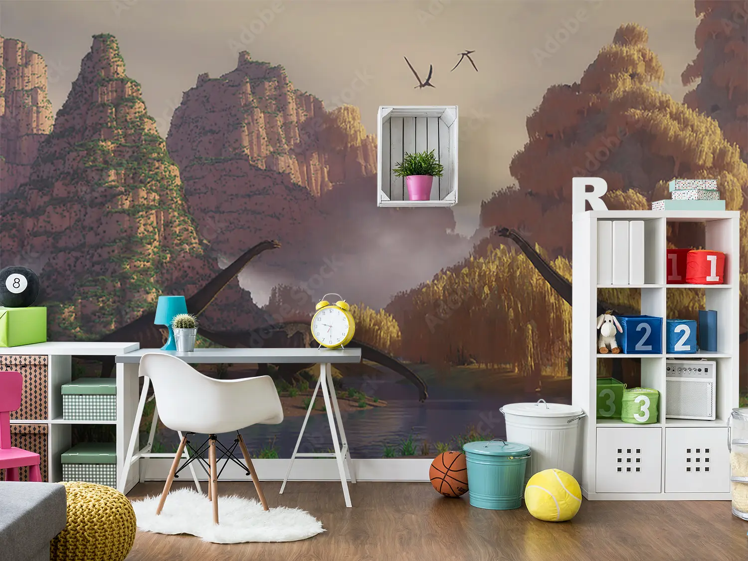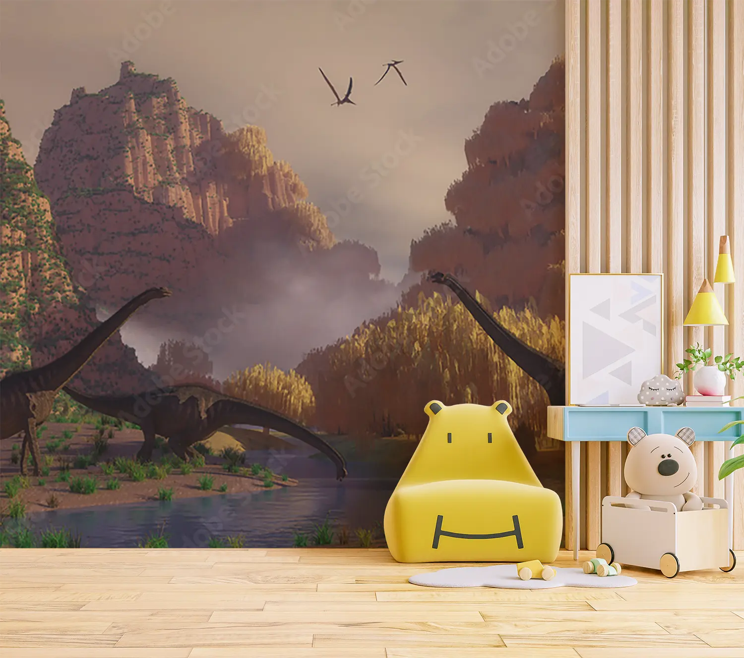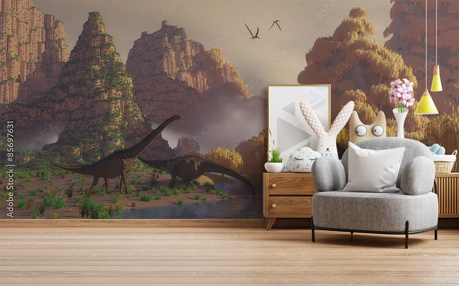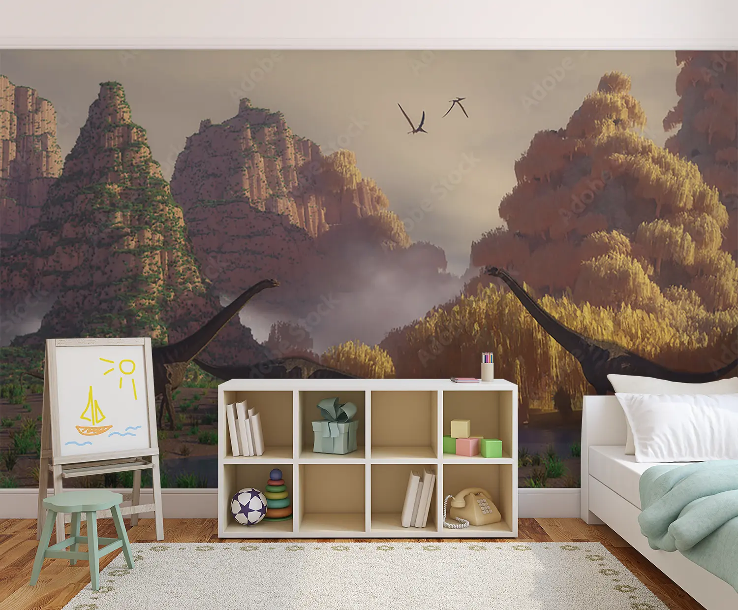 Transform your space with a stunning wall art featuring a captivating scene of dinosaurs walking through a lush field. This vibrant and detailed mural will add an enchanting touch to your home decor, creating a sense of adventure and wonder. Complementary colors to consider include earthy tones like olive green, sandy brown, and deep blue.