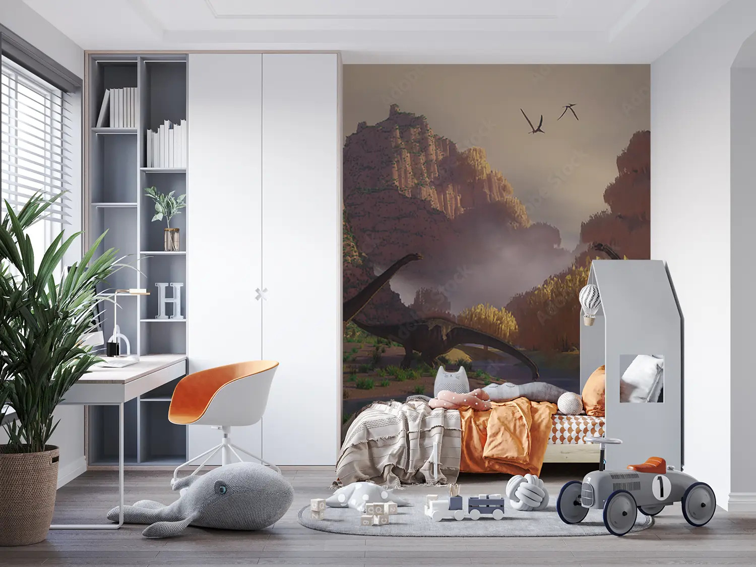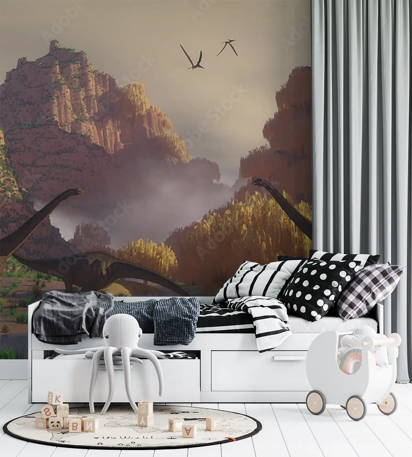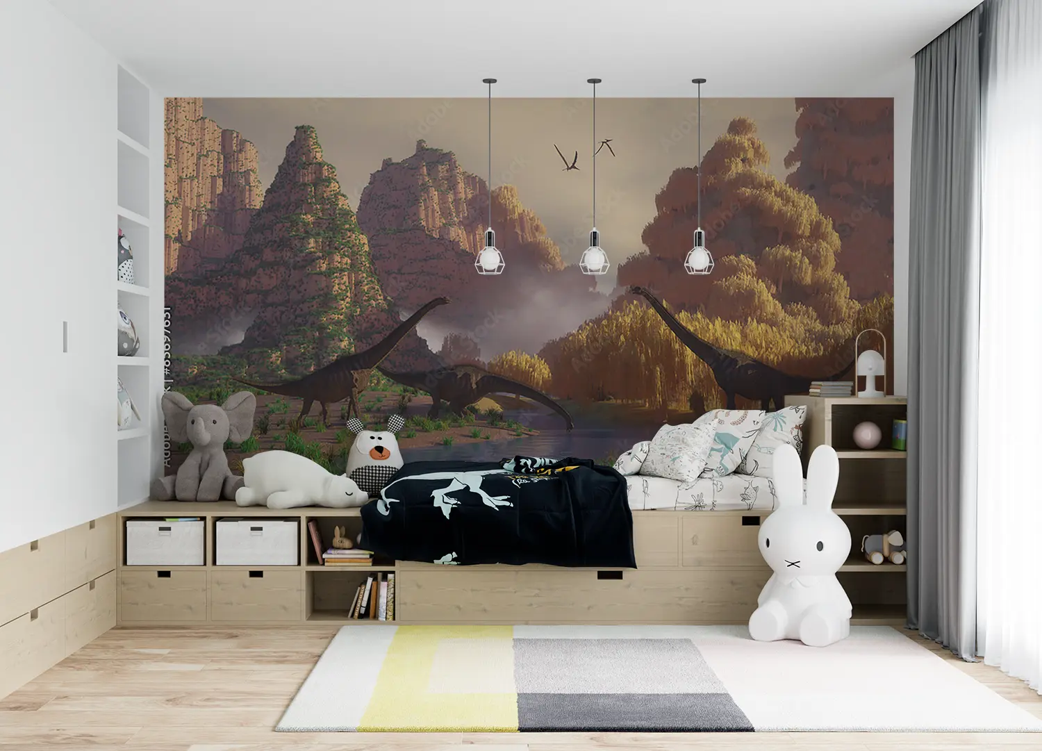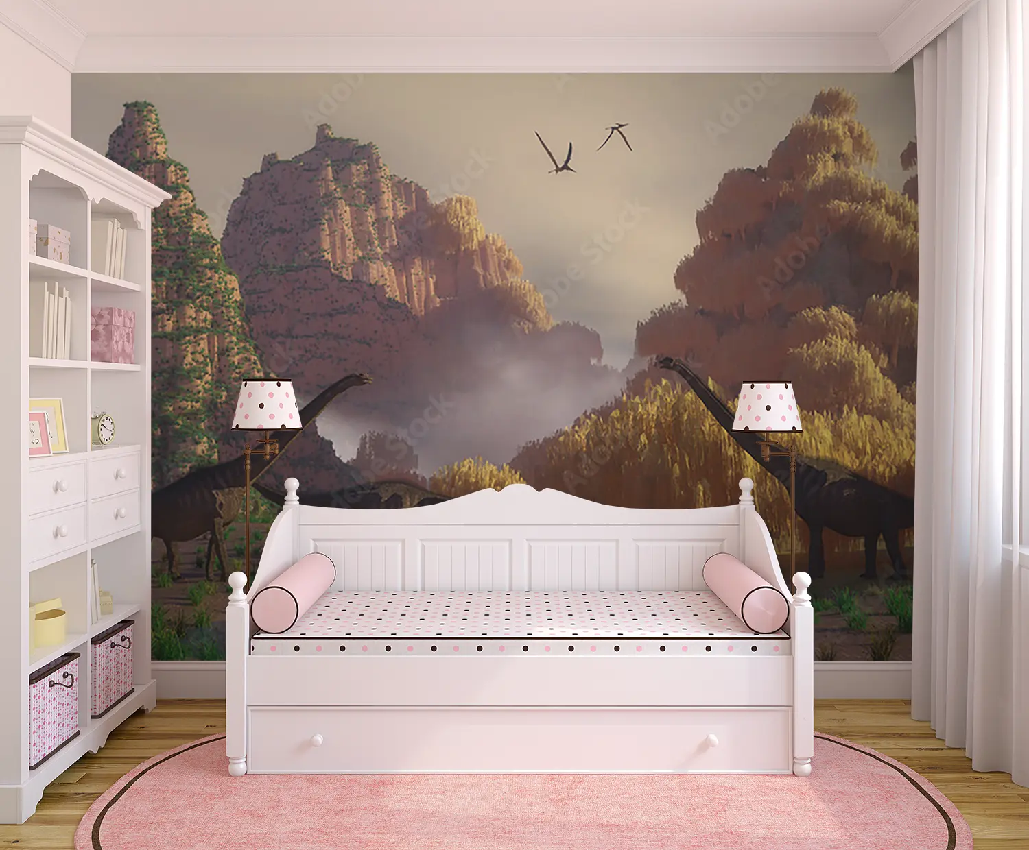 Transform your space with a stunning wall art featuring a captivating scene of dinosaurs walking through a lush field. This vibrant and detailed mural will add an enchanting touch to your home decor, creating a sense of adventure and wonder. Complementary colors to consider include earthy tones like olive green, sandy brown, and deep blue.