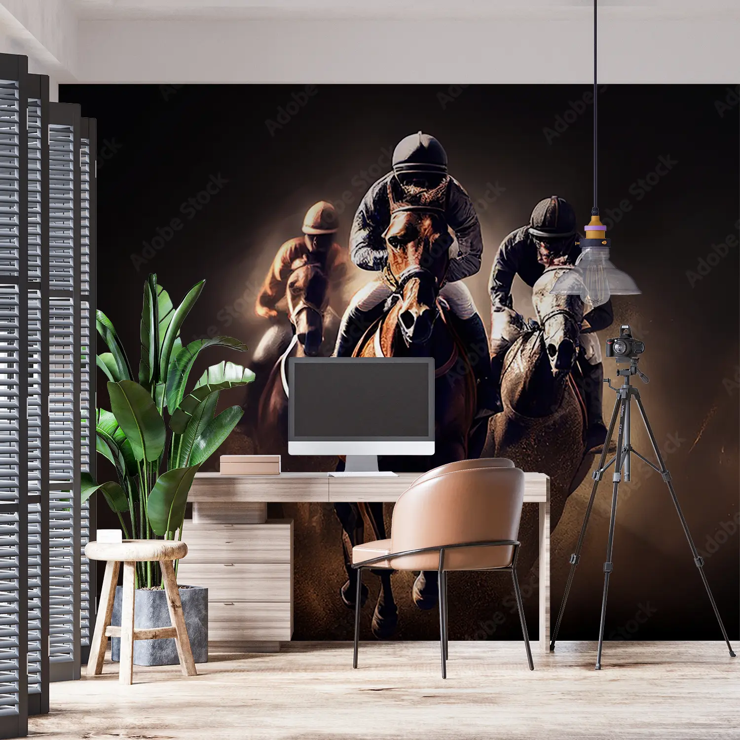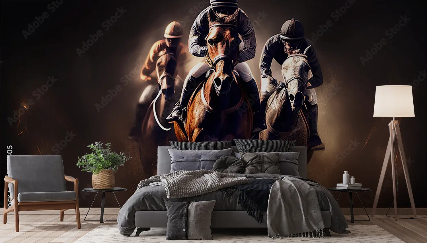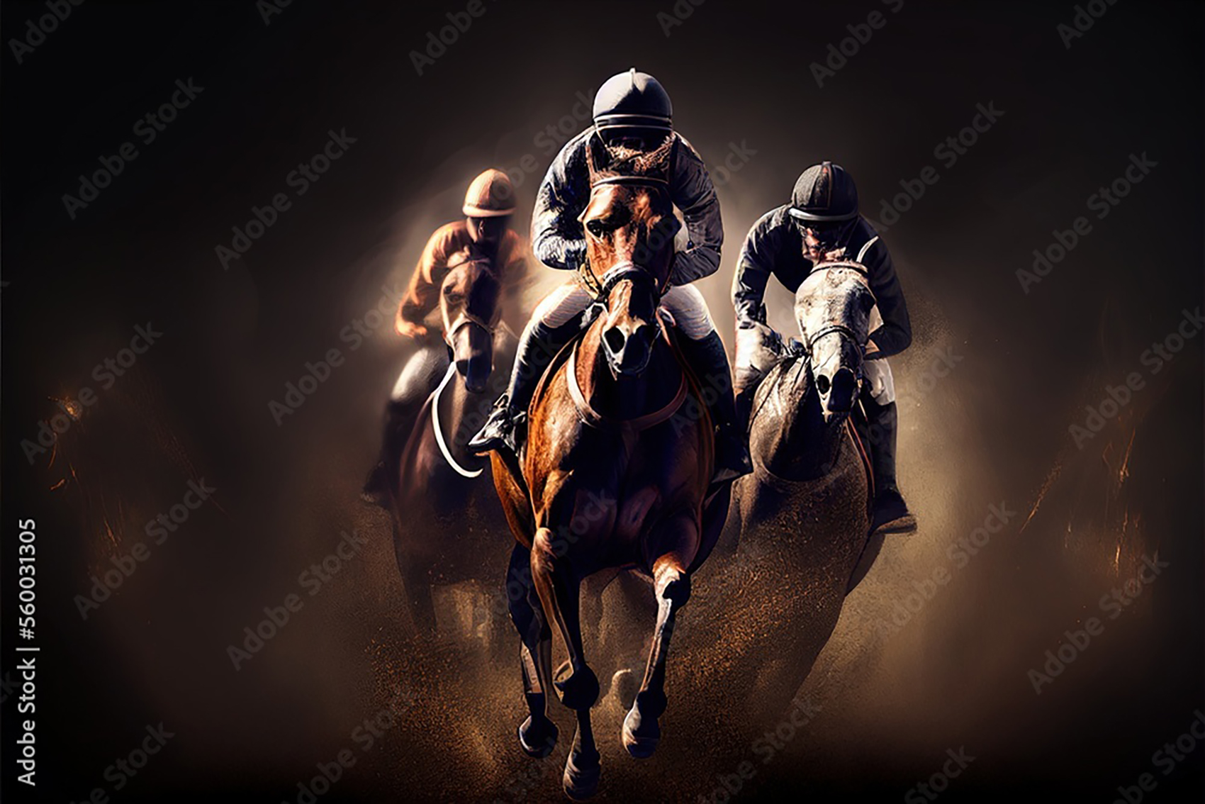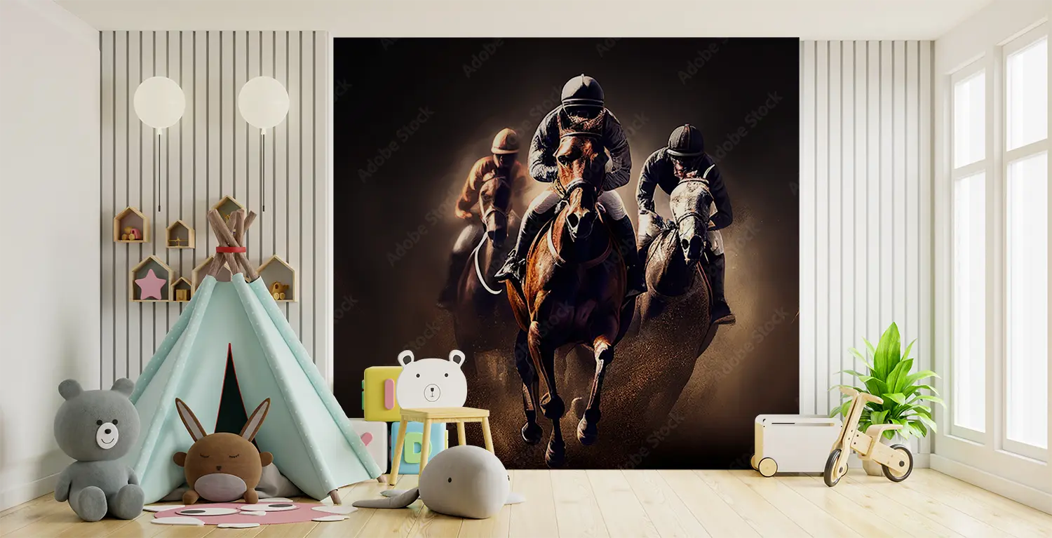 Transform your space with this captivating wall art featuring three jockeys riding horses in a thrilling race. The dark background adds a sense of drama and excitement to any room, making it a perfect addition to your home decor. Complementary colors such as earthy browns, soft creams, and deep blues will enhance the aesthetic appeal of this artwork.