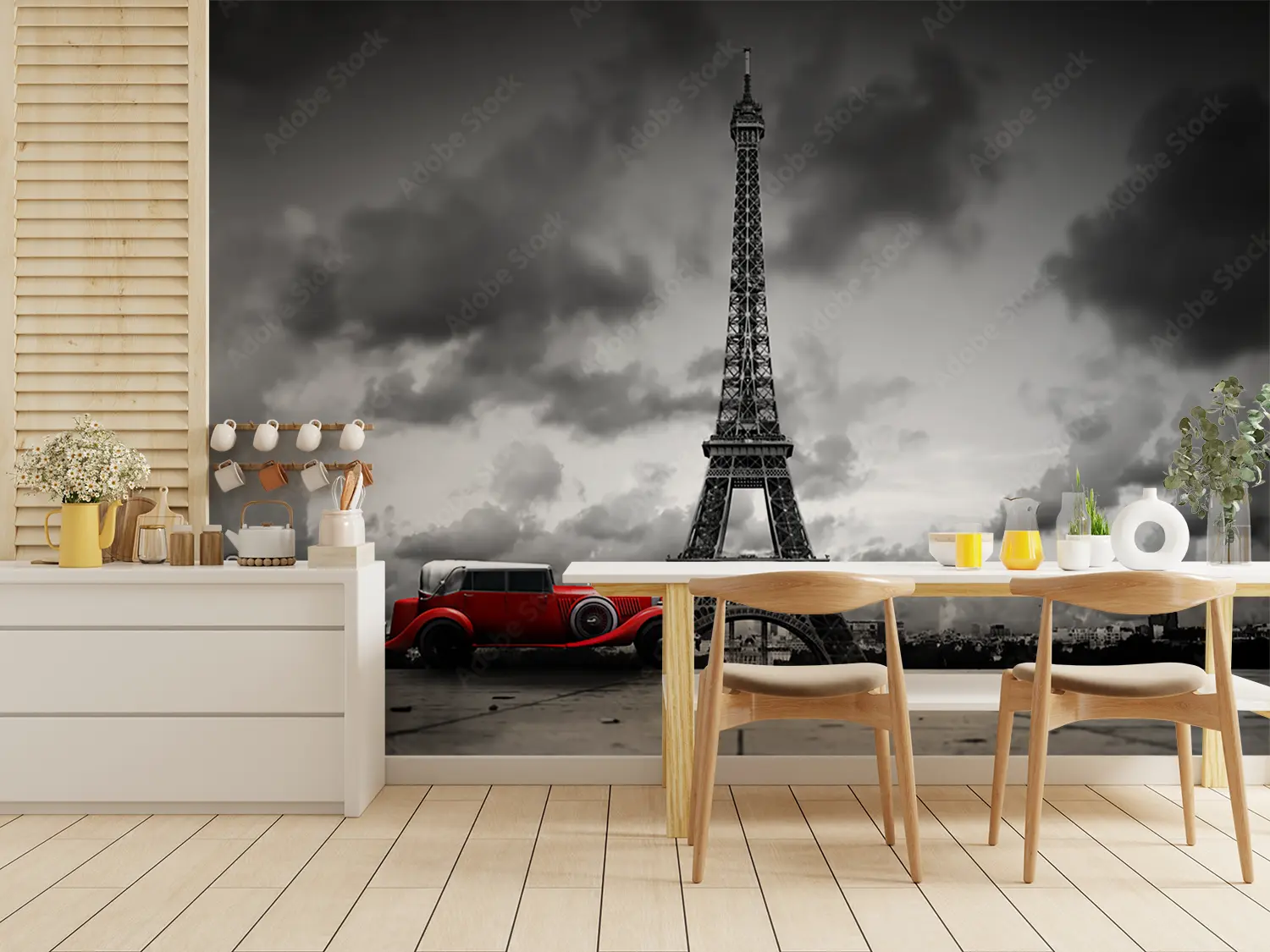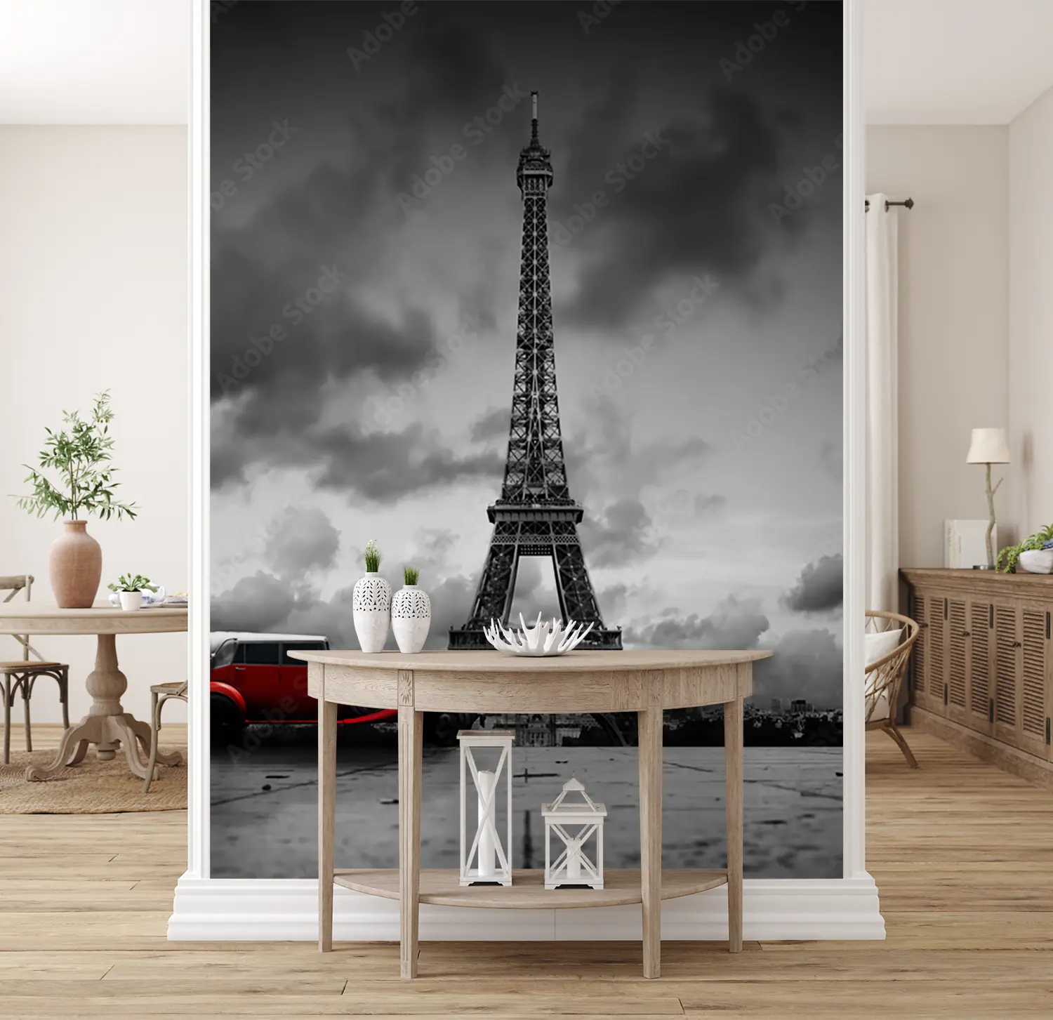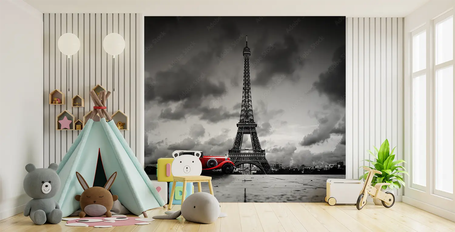 Transform your space with a captivating image of a red car parked in front of the iconic Eiffel Tower. This artistic piece adds a touch of wanderlust to your home decor, creating a sophisticated and stylish ambiance. Complementary colors like grey, white, and black will further enhance the aesthetic appeal of this stunning wall art.