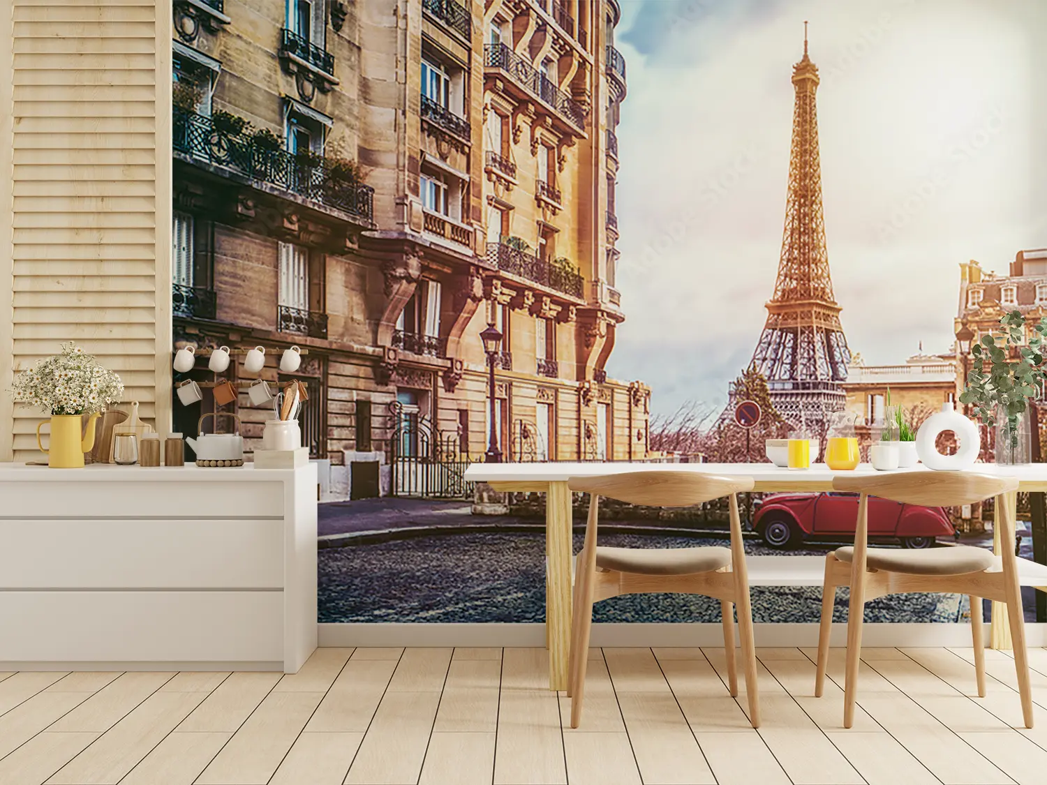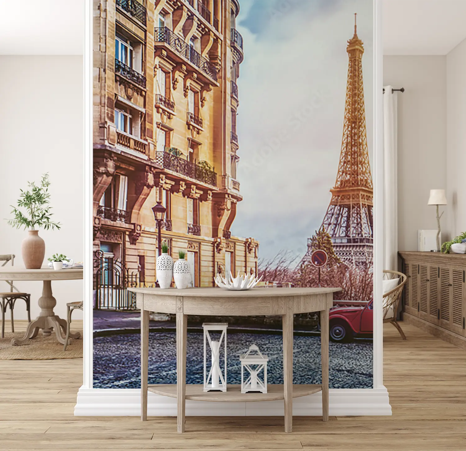 Bring the beauty of Paris into your home with this stunning wall art featuring a red car parked in front of the iconic Eiffel Tower. Its vibrant colors and detailed imagery will add a touch of sophistication to any room. Complementary colors to consider for your décor include shades of grey, beige, and soft blues. Elevate your space with this timeless piece.