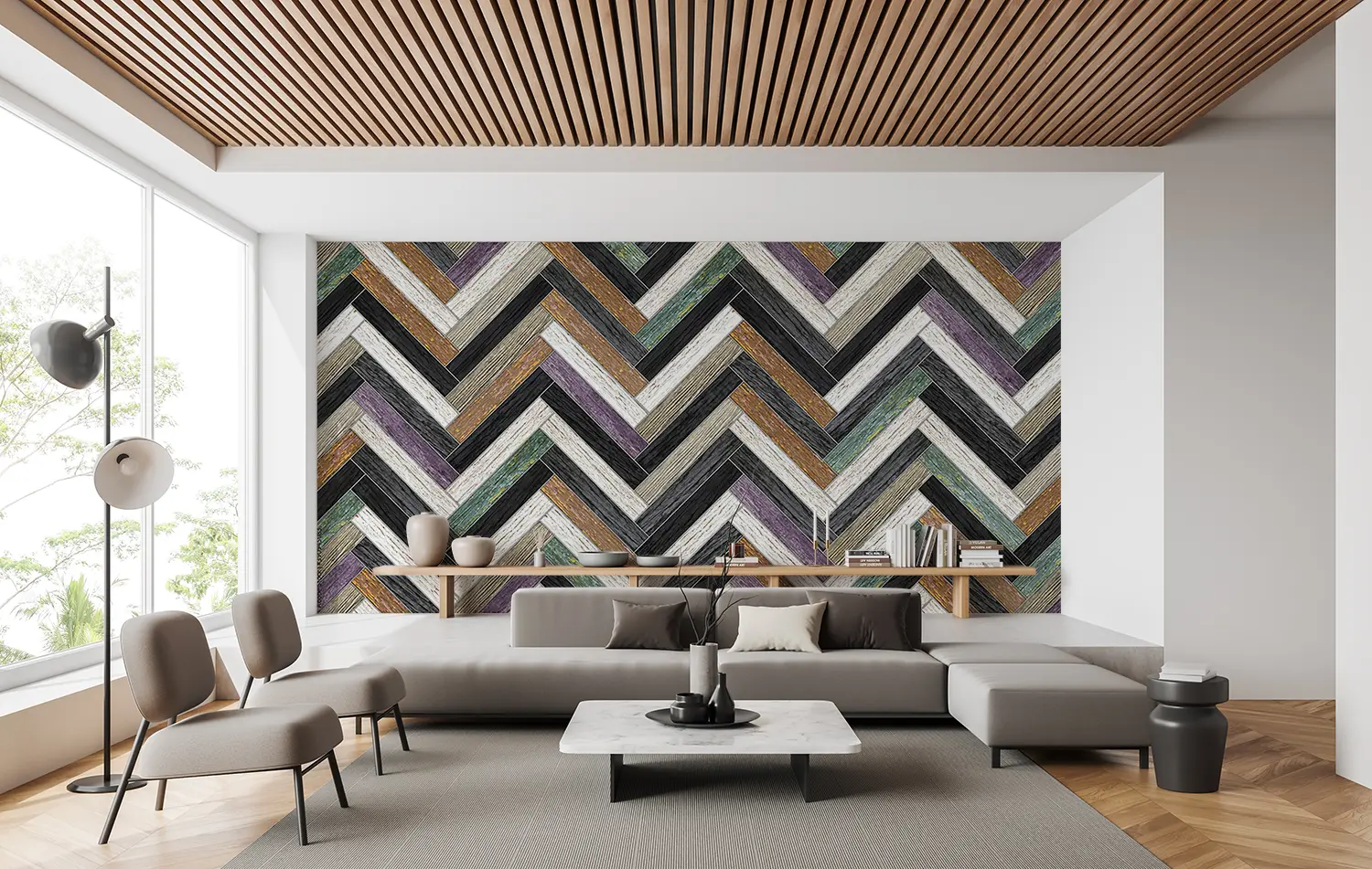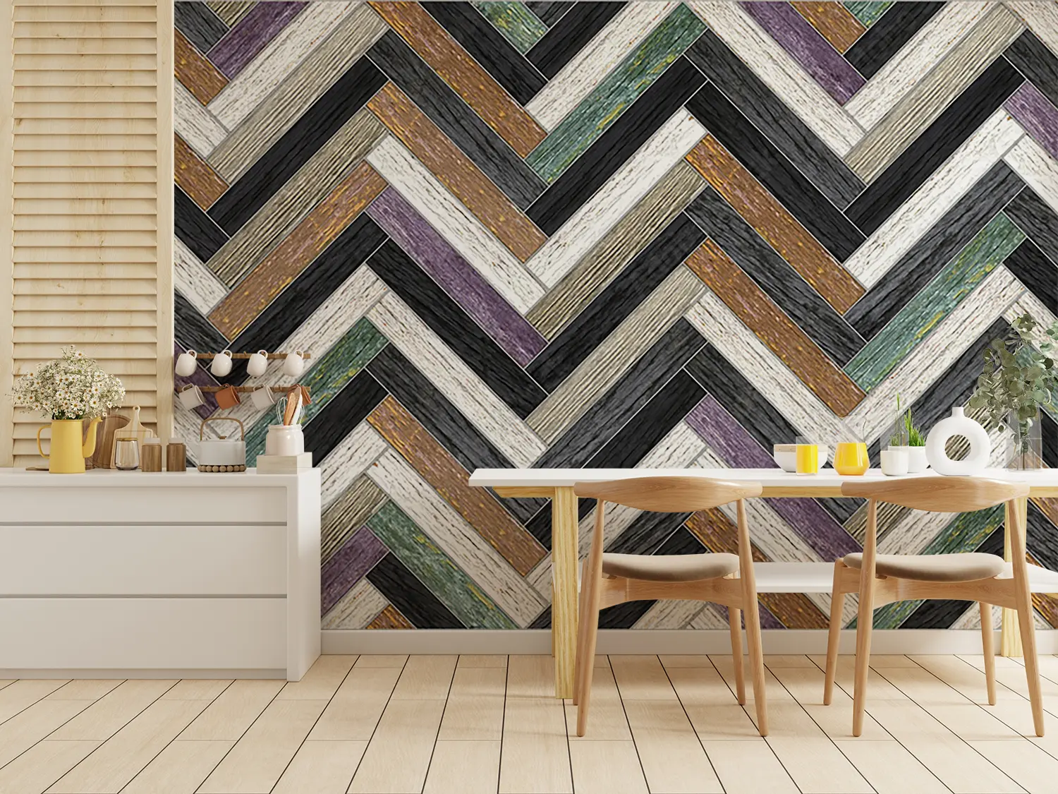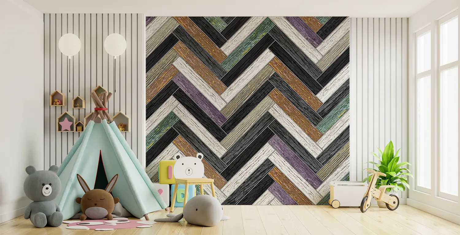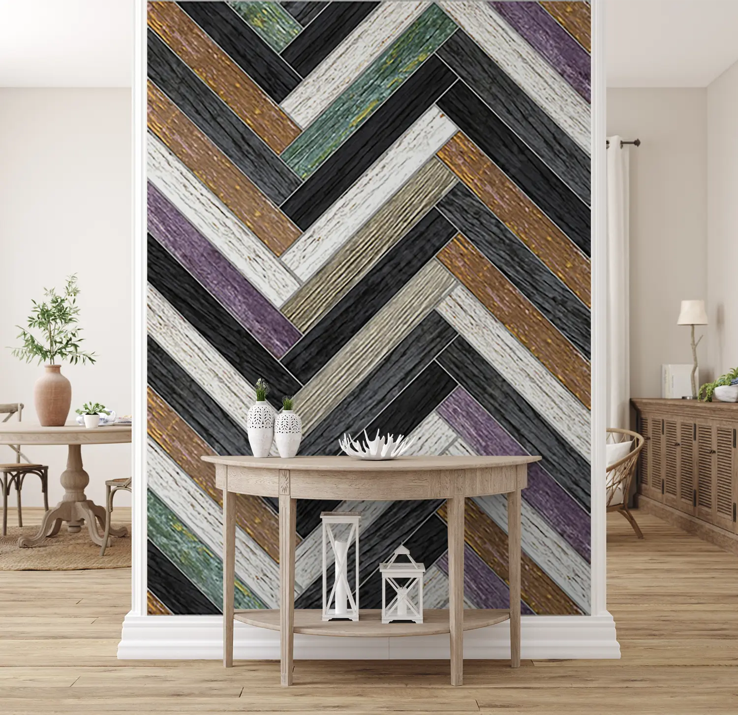 Transform your home decor with this stunning wall design featuring a chevron pattern of wood and stone. The intricate blend of textures adds a touch of sophistication to any room. Complement the mural with earthy tones like warm browns, soft greys, and subtle creams to create a harmonious and inviting space. Elevate your interior with this timeless and stylish aesthetic.