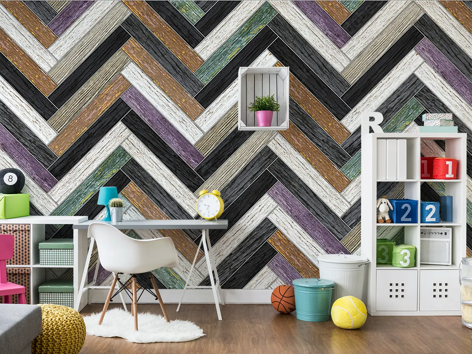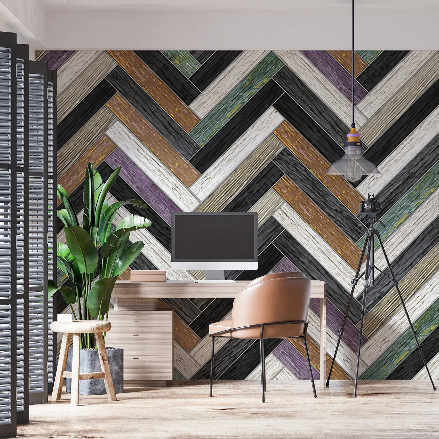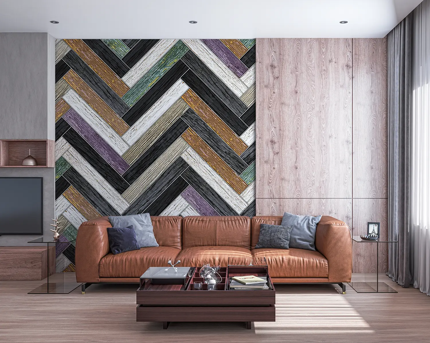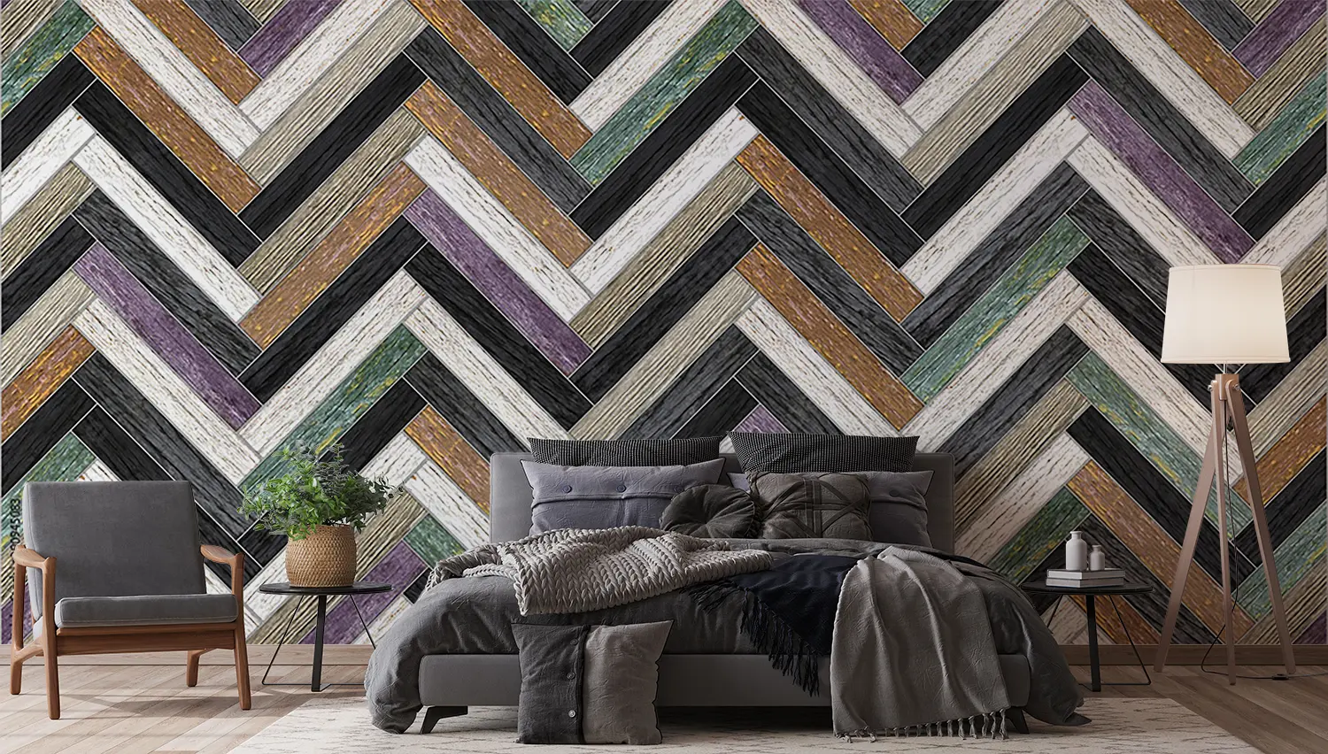 Transform your home decor with this stunning wall design featuring a chevron pattern of wood and stone. The intricate blend of textures adds a touch of sophistication to any room. Complement the mural with earthy tones like warm browns, soft greys, and subtle creams to create a harmonious and inviting space. Elevate your interior with this timeless and stylish aesthetic.