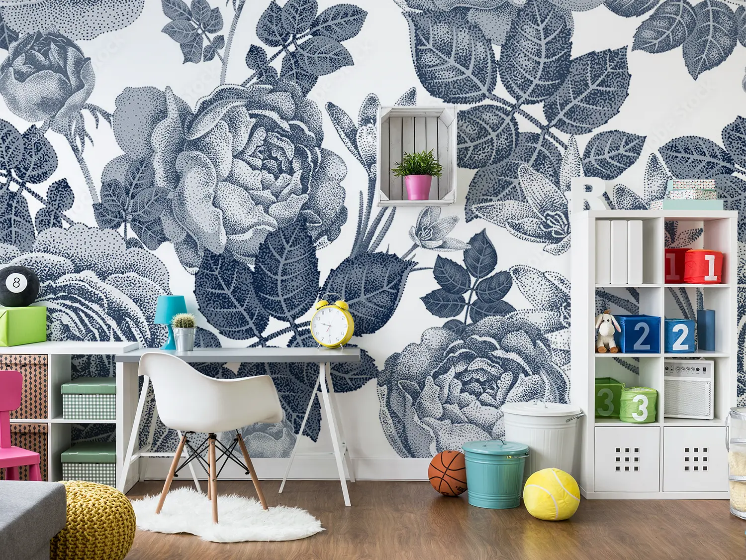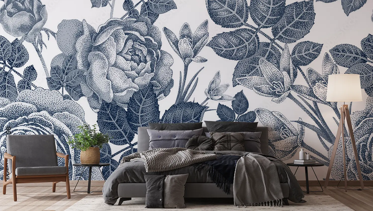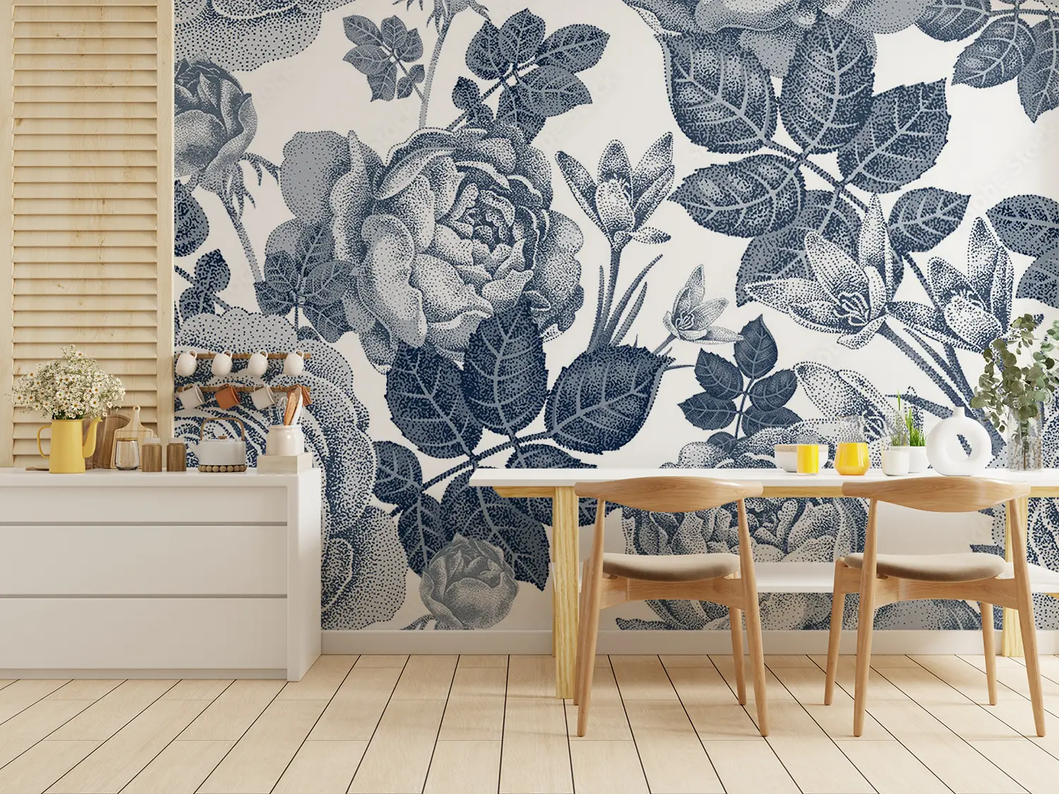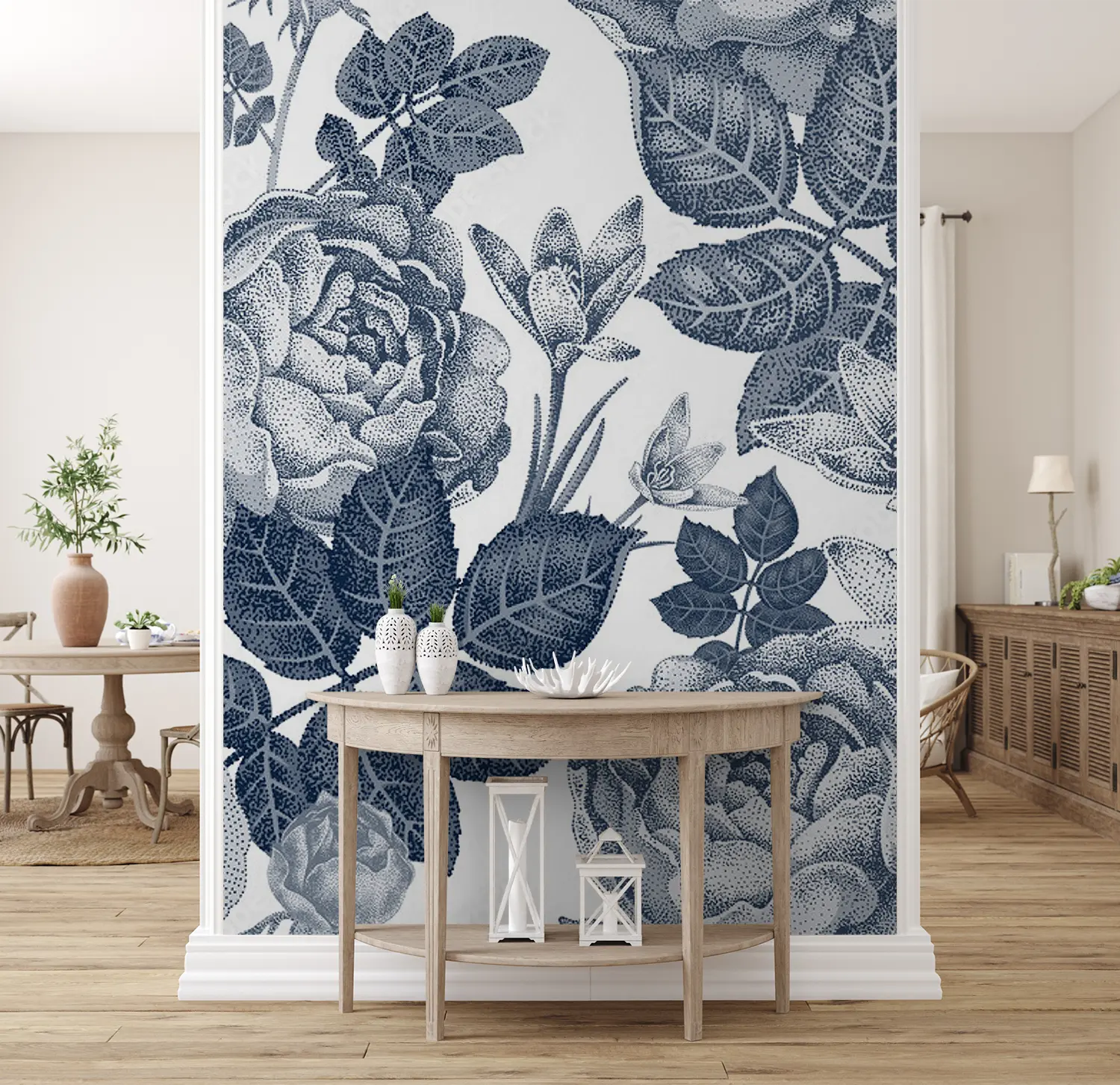 Transform your space with this stunning floral wall art featuring a beautiful bouquet of roses and leaves in blue and white tones. Enhance your home decor with this intricate design that adds a touch of elegance and charm to any room. Complementary colors include soft whites, muted blues, and subtle grays for a cohesive and stylish look.
