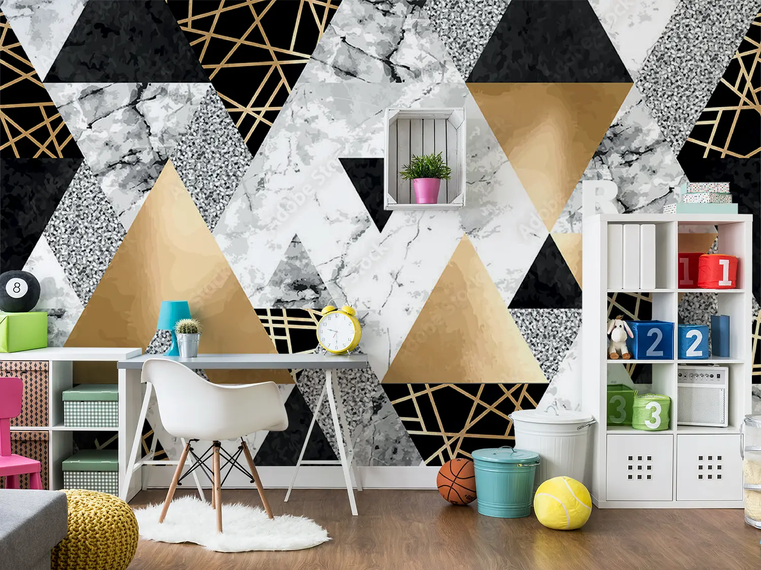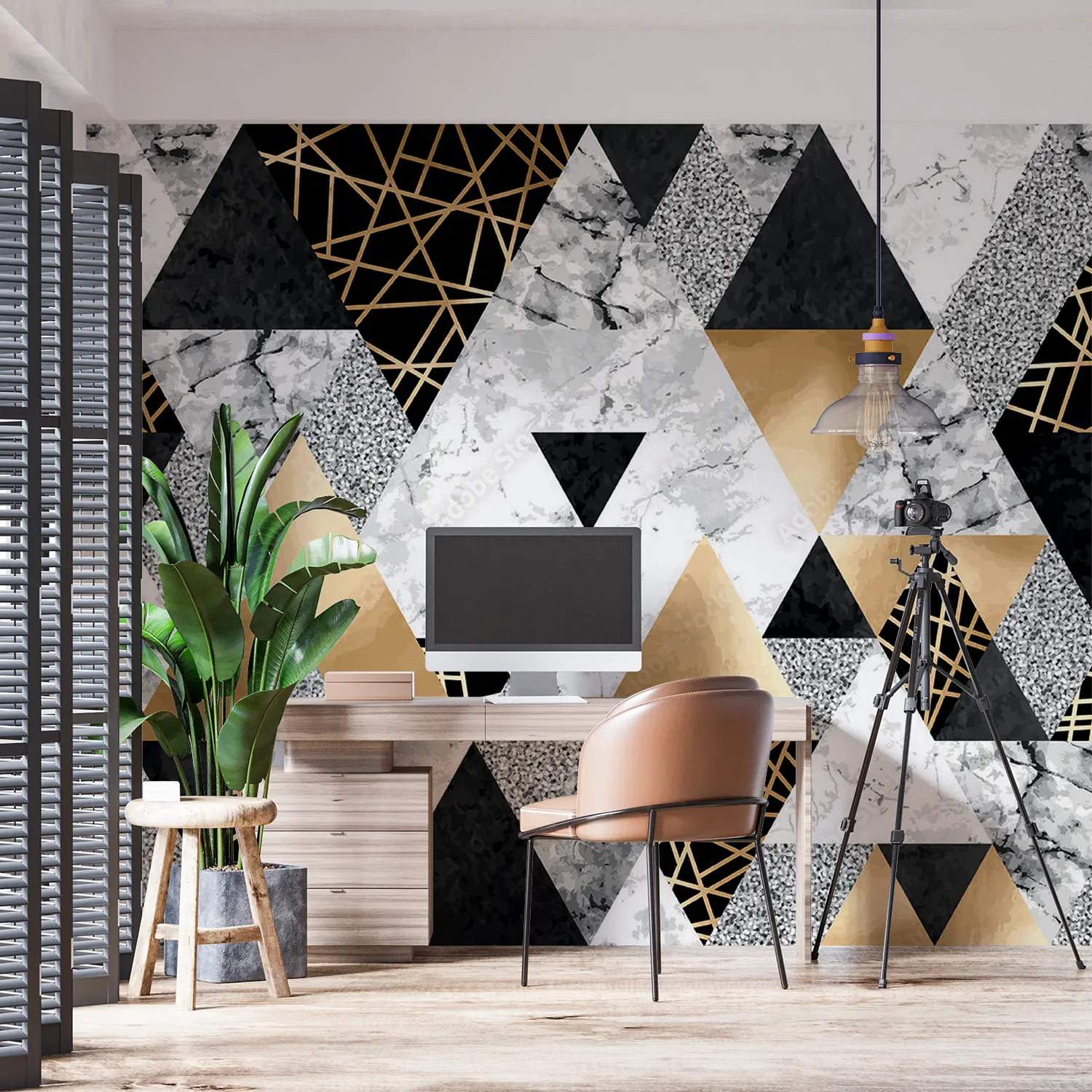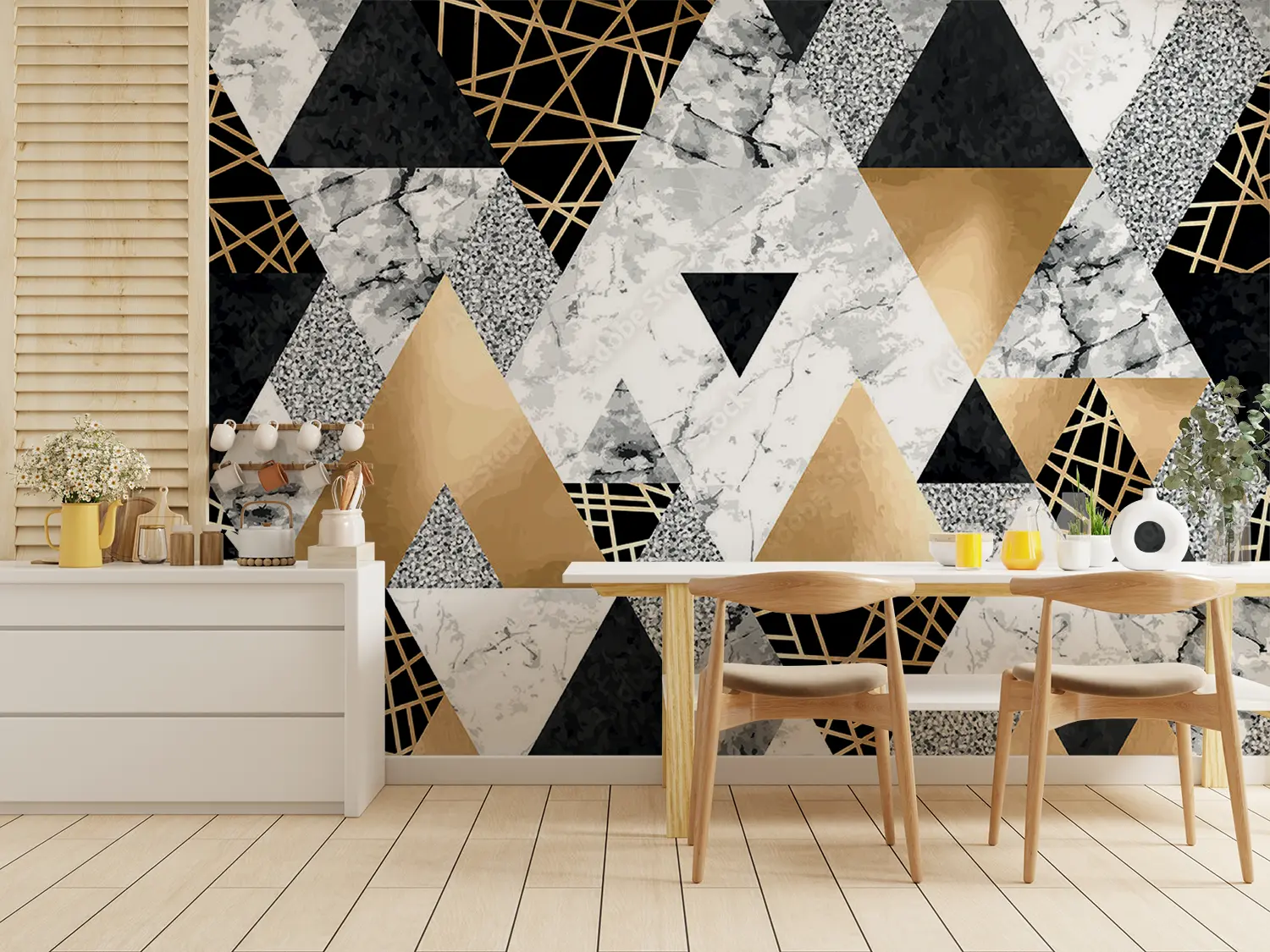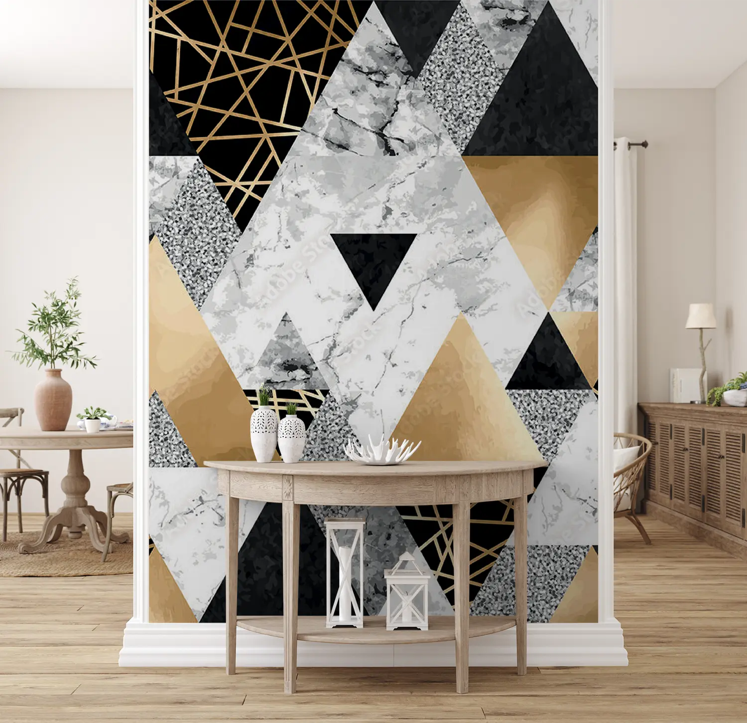 Transform your space with this sophisticated black, white, and gold geometric design. Add a touch of modern elegance to your home decor with this captivating pattern. Complementary colors to consider include soft gray, warm beige, and rich navy blue. Elevate your interior with this eye-catching and chic wall art.