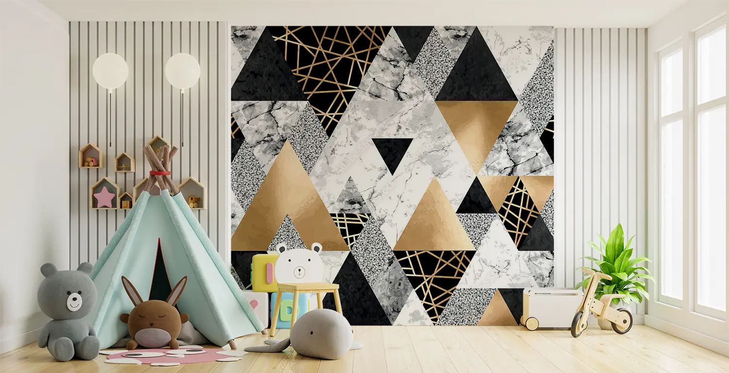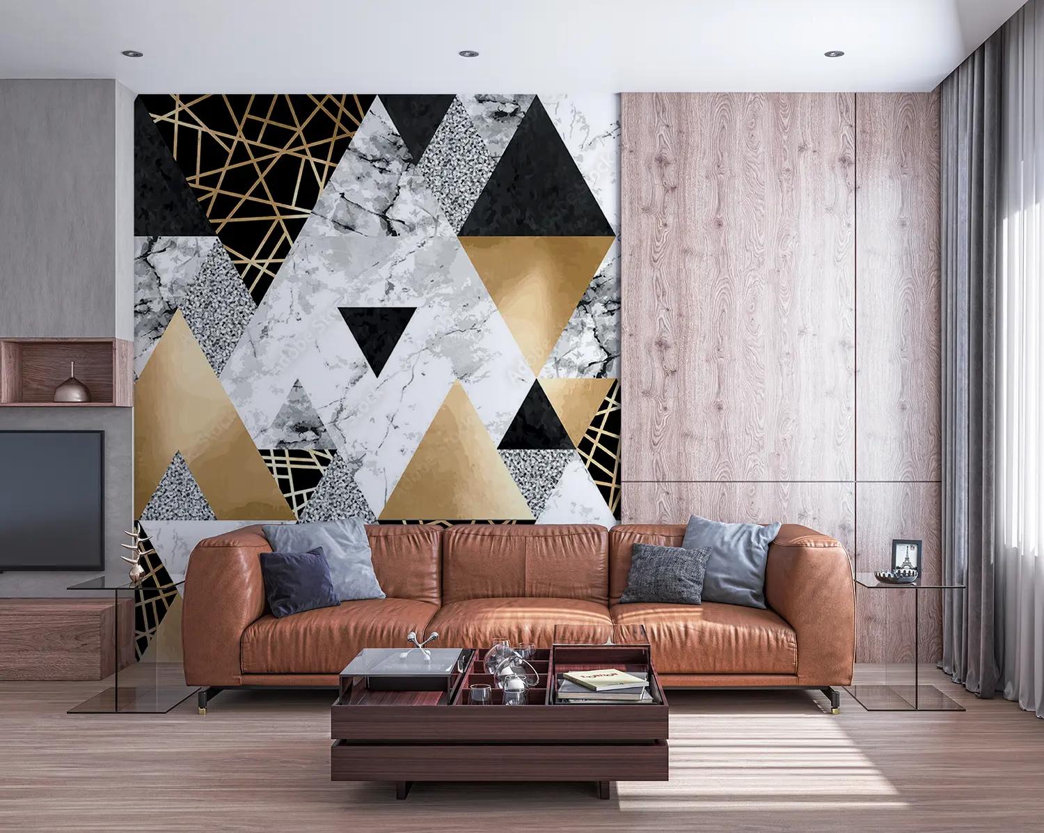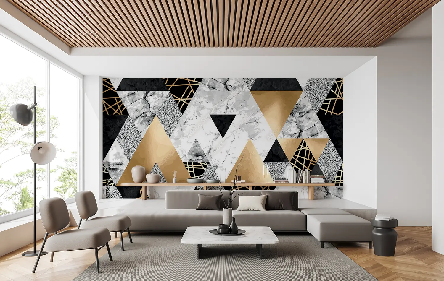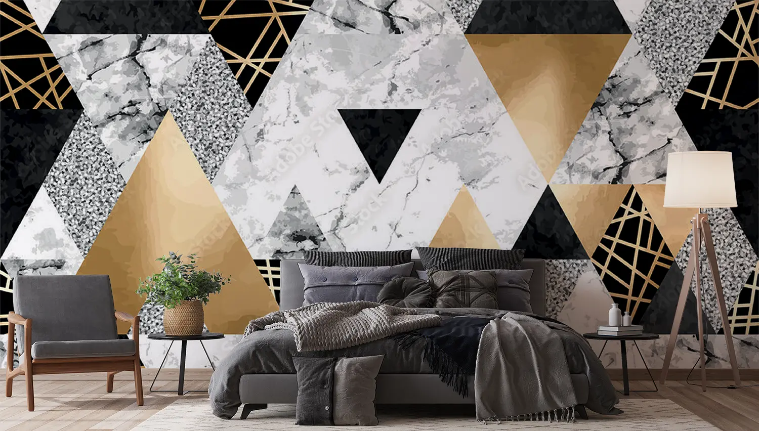 Transform your space with this sophisticated black, white, and gold geometric design. Add a touch of modern elegance to your home decor with this captivating pattern. Complementary colors to consider include soft gray, warm beige, and rich navy blue. Elevate your interior with this eye-catching and chic wall art.