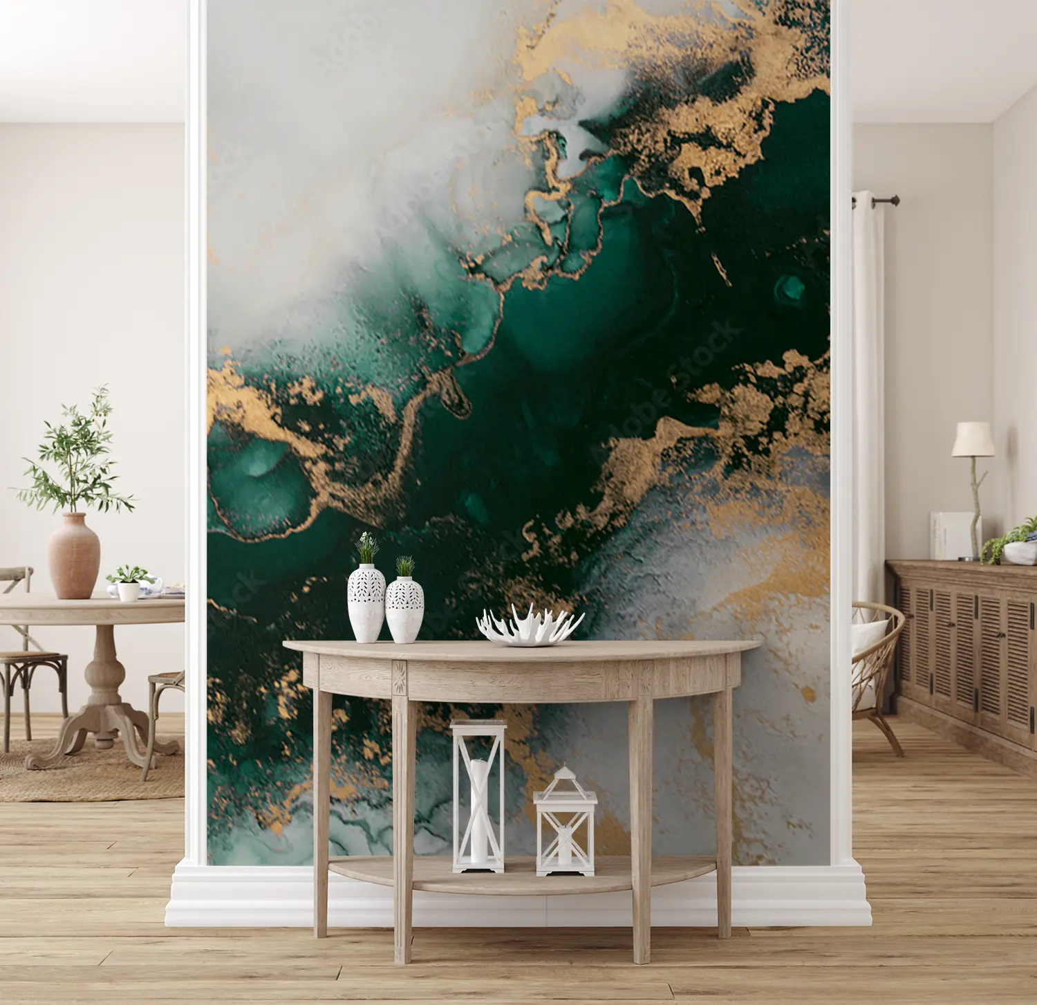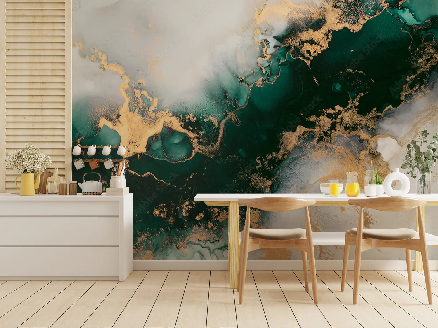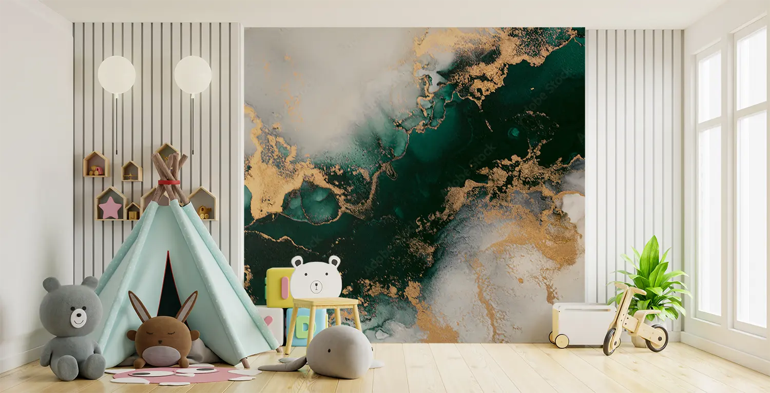 Elevate your home decor with this stunning wall art featuring a mesmerizing blend of gold and green hues. The marbled background adds a touch of sophistication, making it a perfect focal point for any room. Complementary colors like white, brown, and powder can enhance the overall aesthetic appeal of your space.