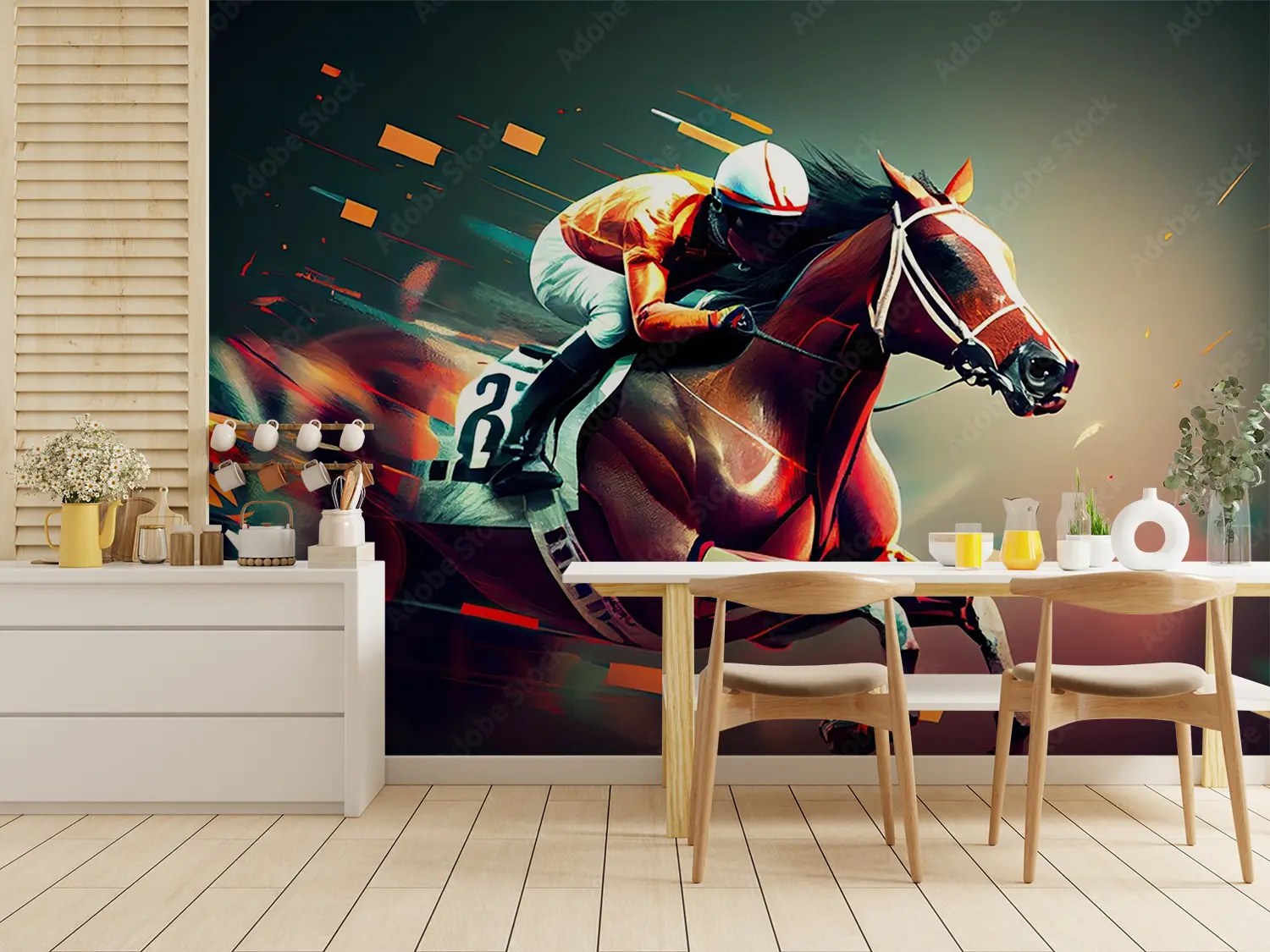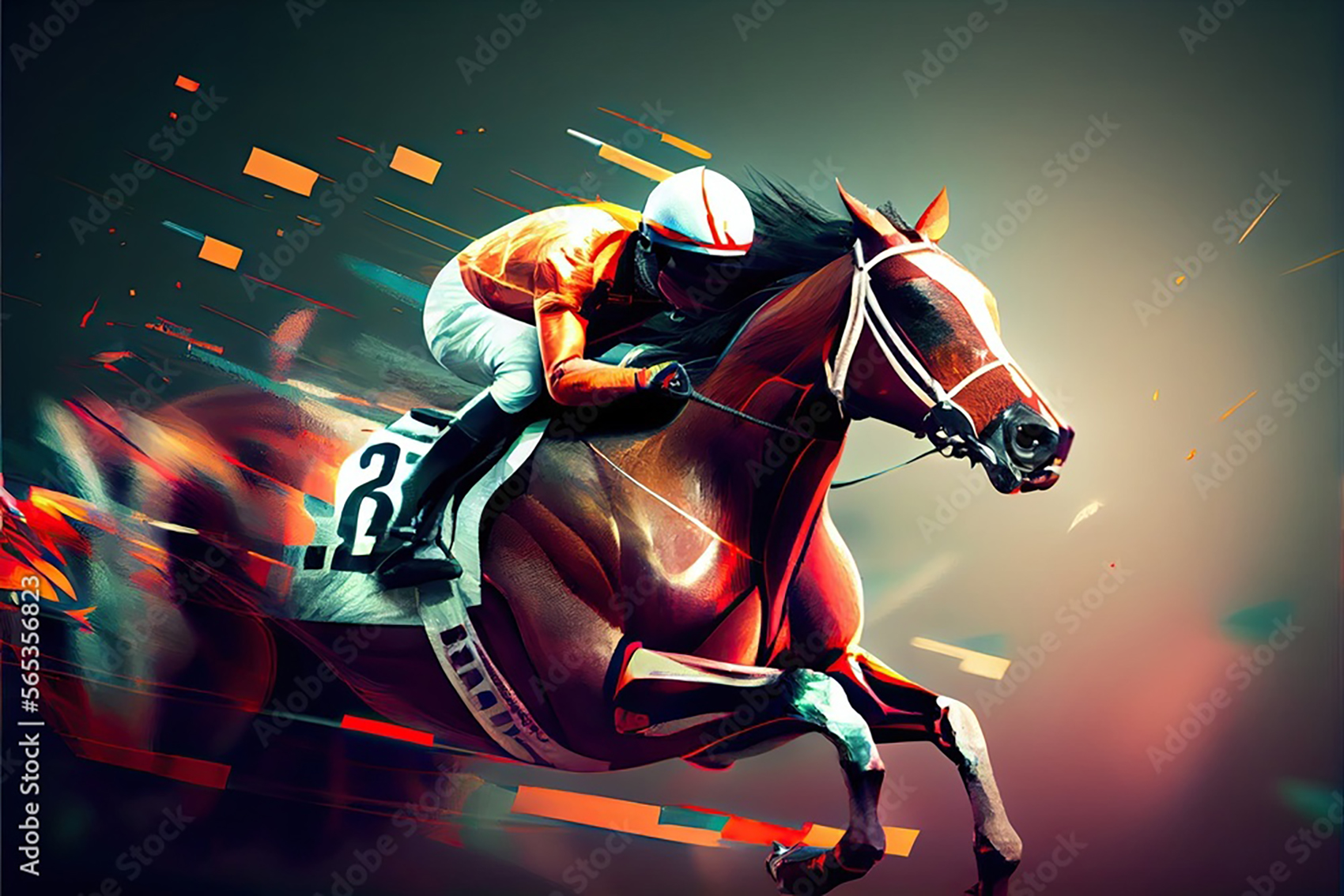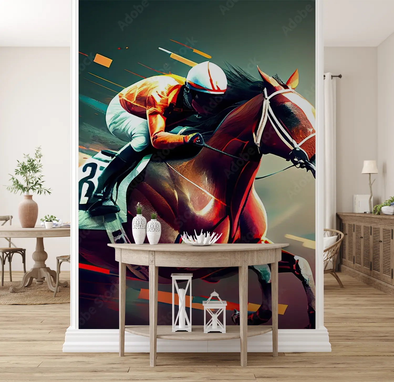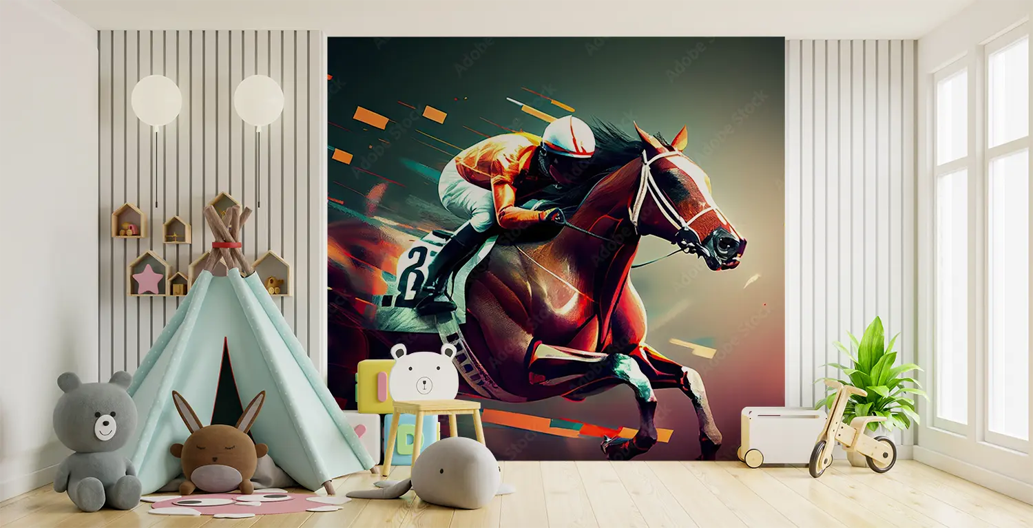 Transform your space with this stunning horse racing artwork, capturing the thrill of the race in a sophisticated painting style. Perfect for adding a touch of elegance to your home decor, this piece features a jockey on a horse in motion. Complementary colors include warm tones like tan, cream, and burgundy to enhance its aesthetic appeal.