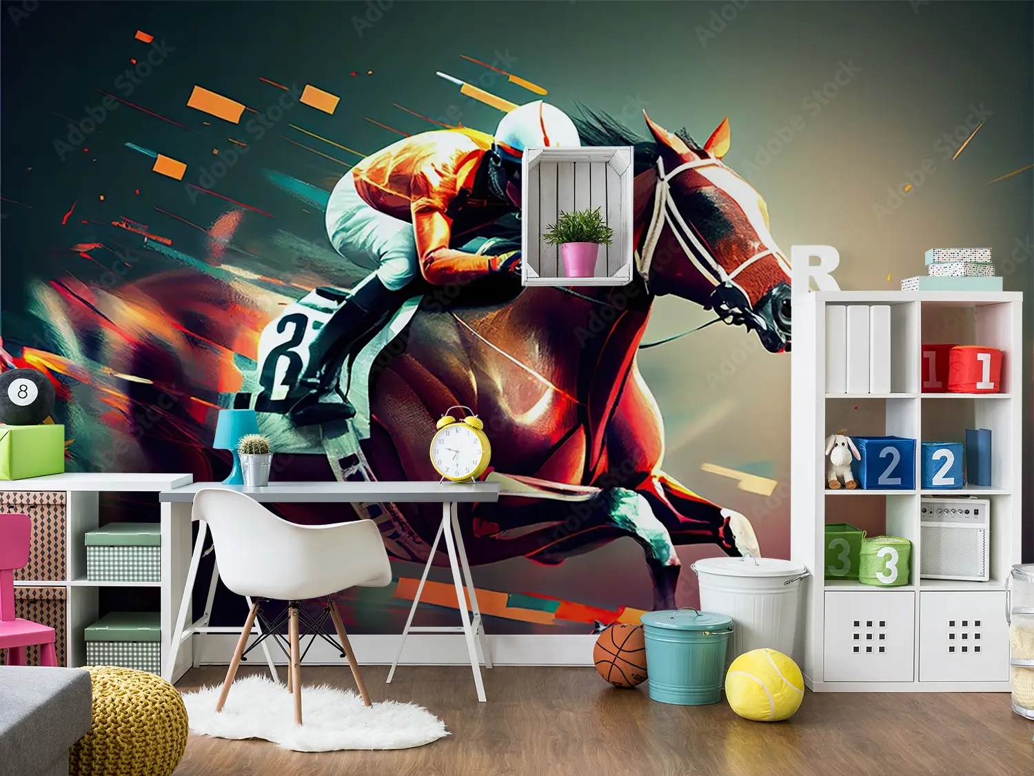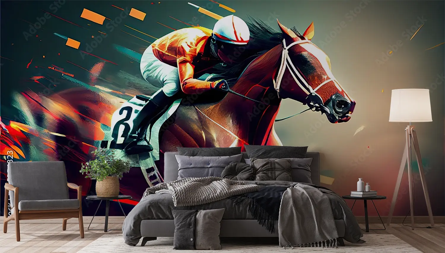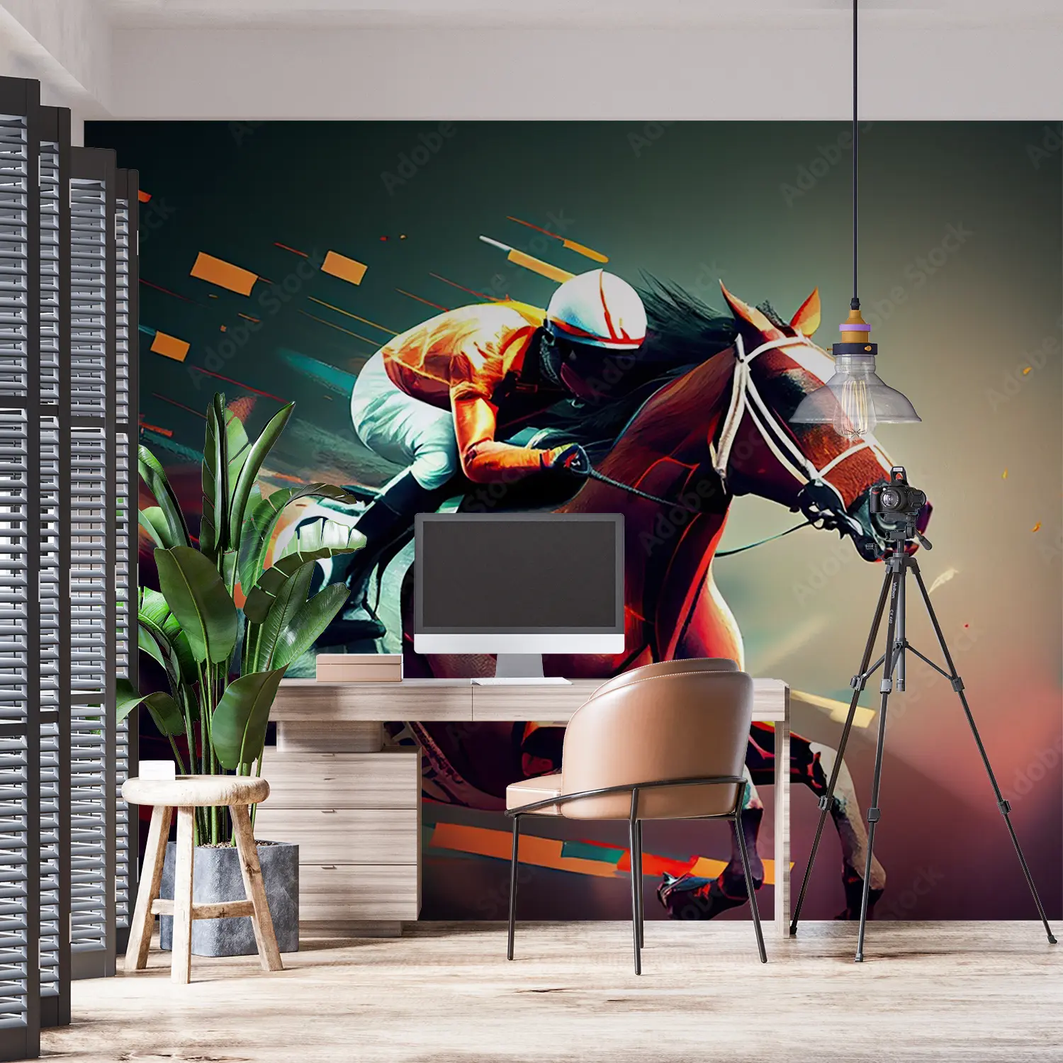 Transform your space with this stunning horse racing artwork, capturing the thrill of the race in a sophisticated painting style. Perfect for adding a touch of elegance to your home decor, this piece features a jockey on a horse in motion. Complementary colors include warm tones like tan, cream, and burgundy to enhance its aesthetic appeal.