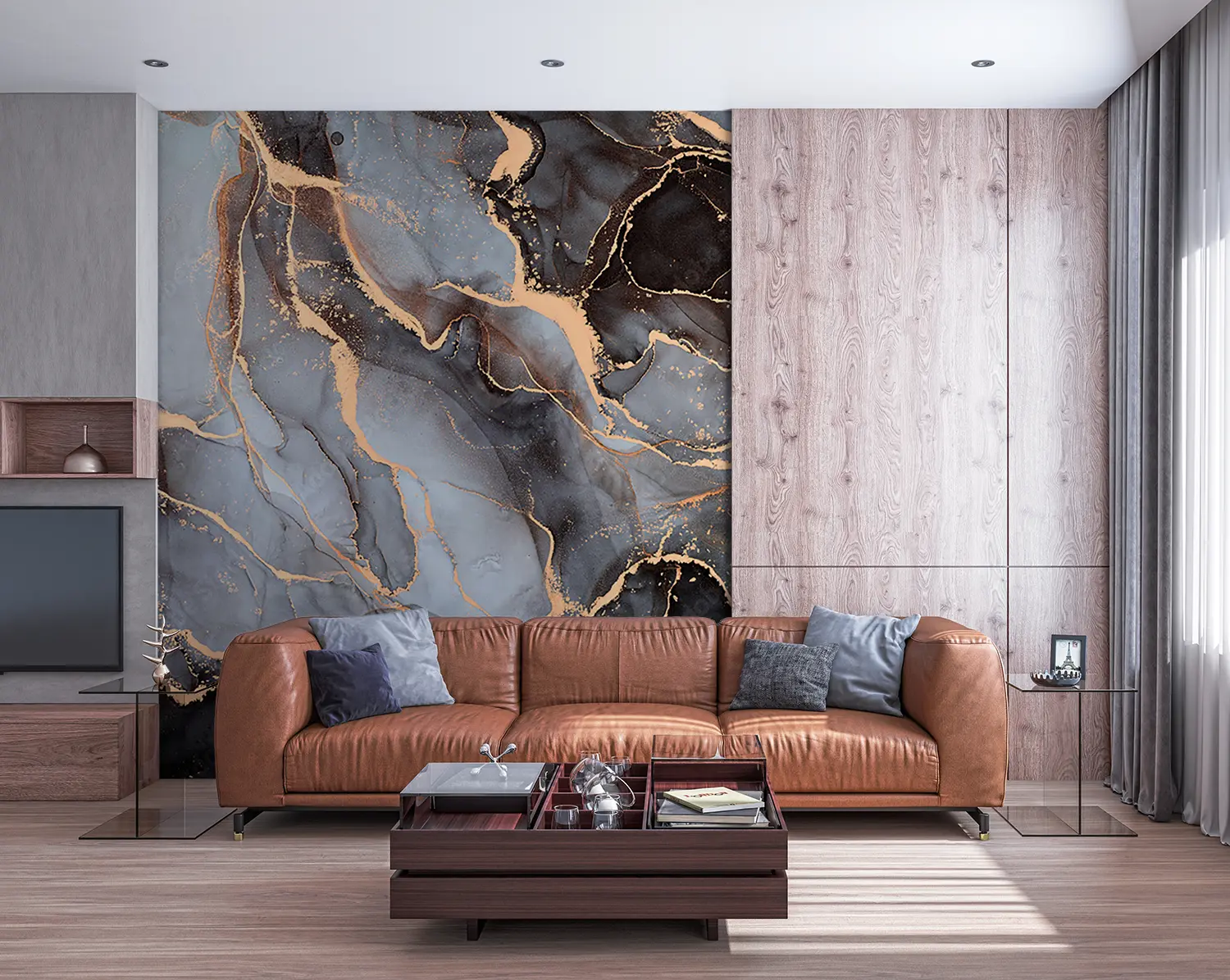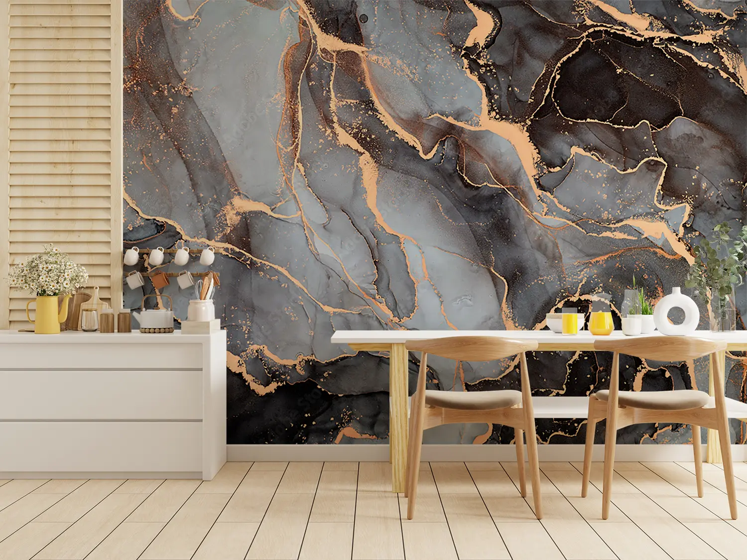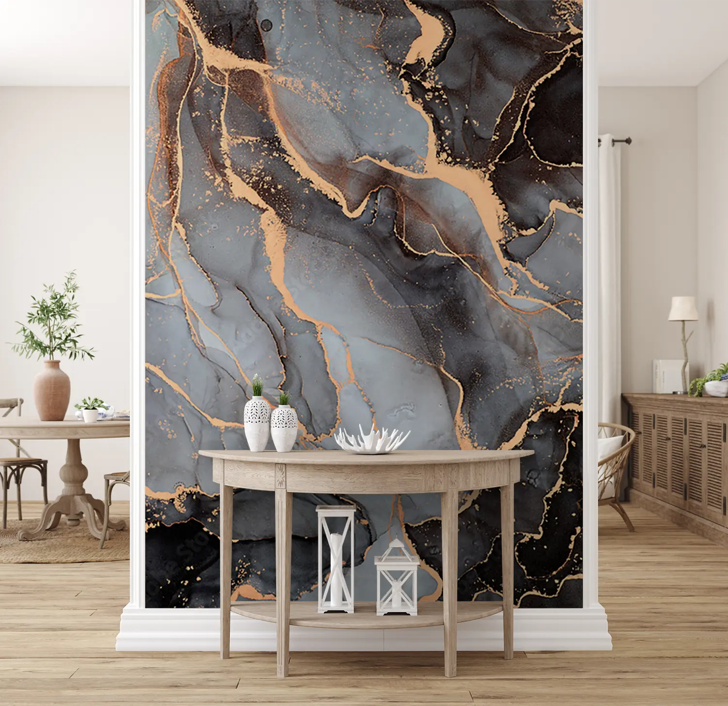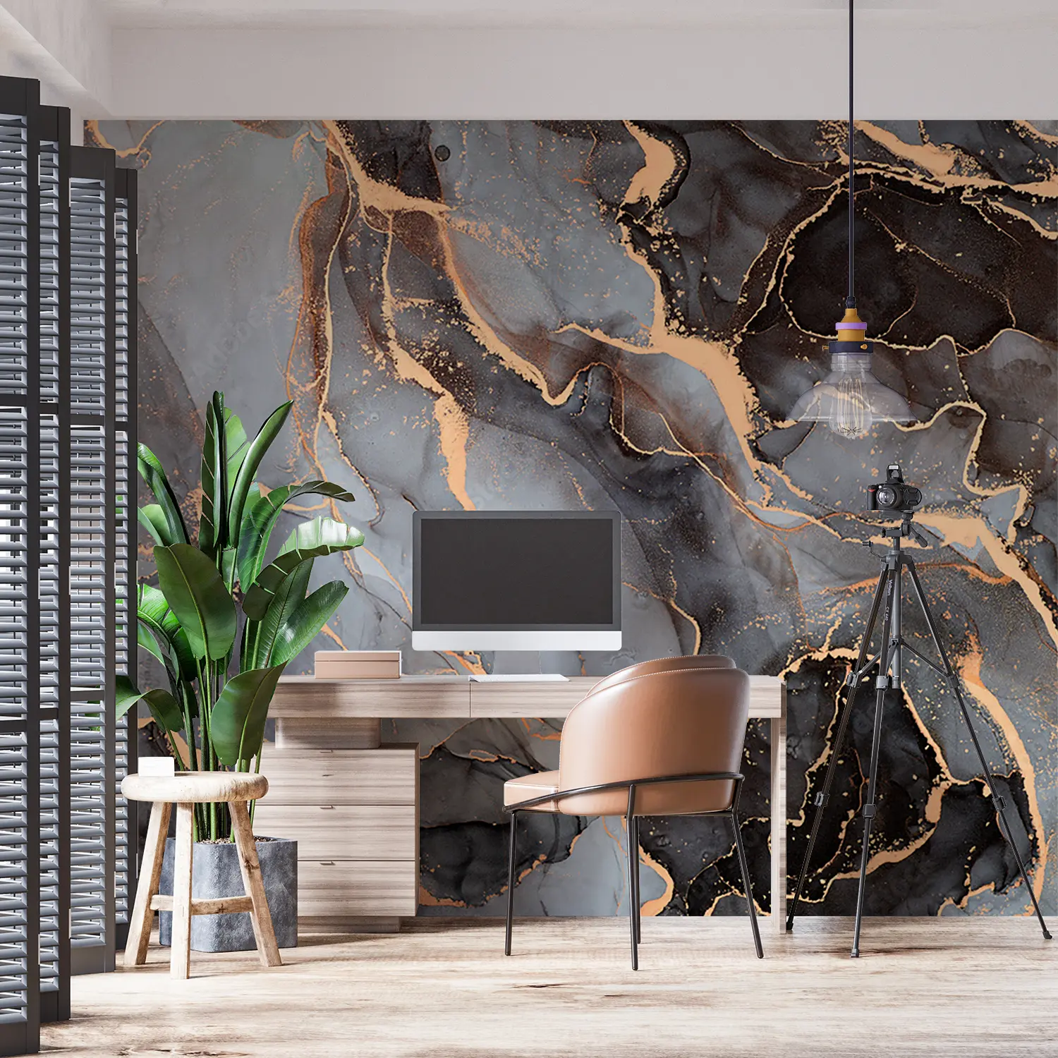 Transform your space with this luxurious marble surface featuring intricate gold and black patterns. Elevate your home decor with this stunning piece that exudes sophistication and style. Complementary colors to consider for a cohesive look include blue, white, and earthy tones. Add a touch of elegance to your walls with this captivating design.