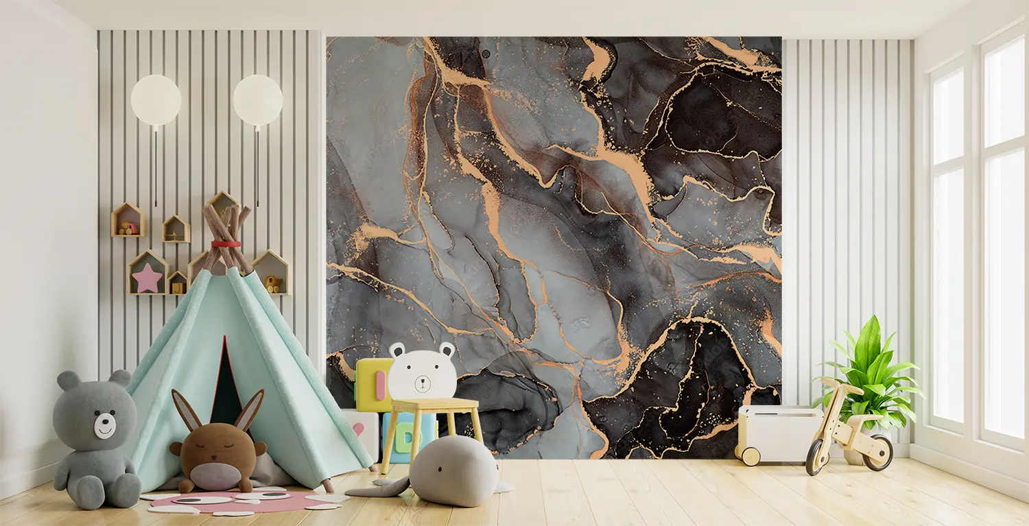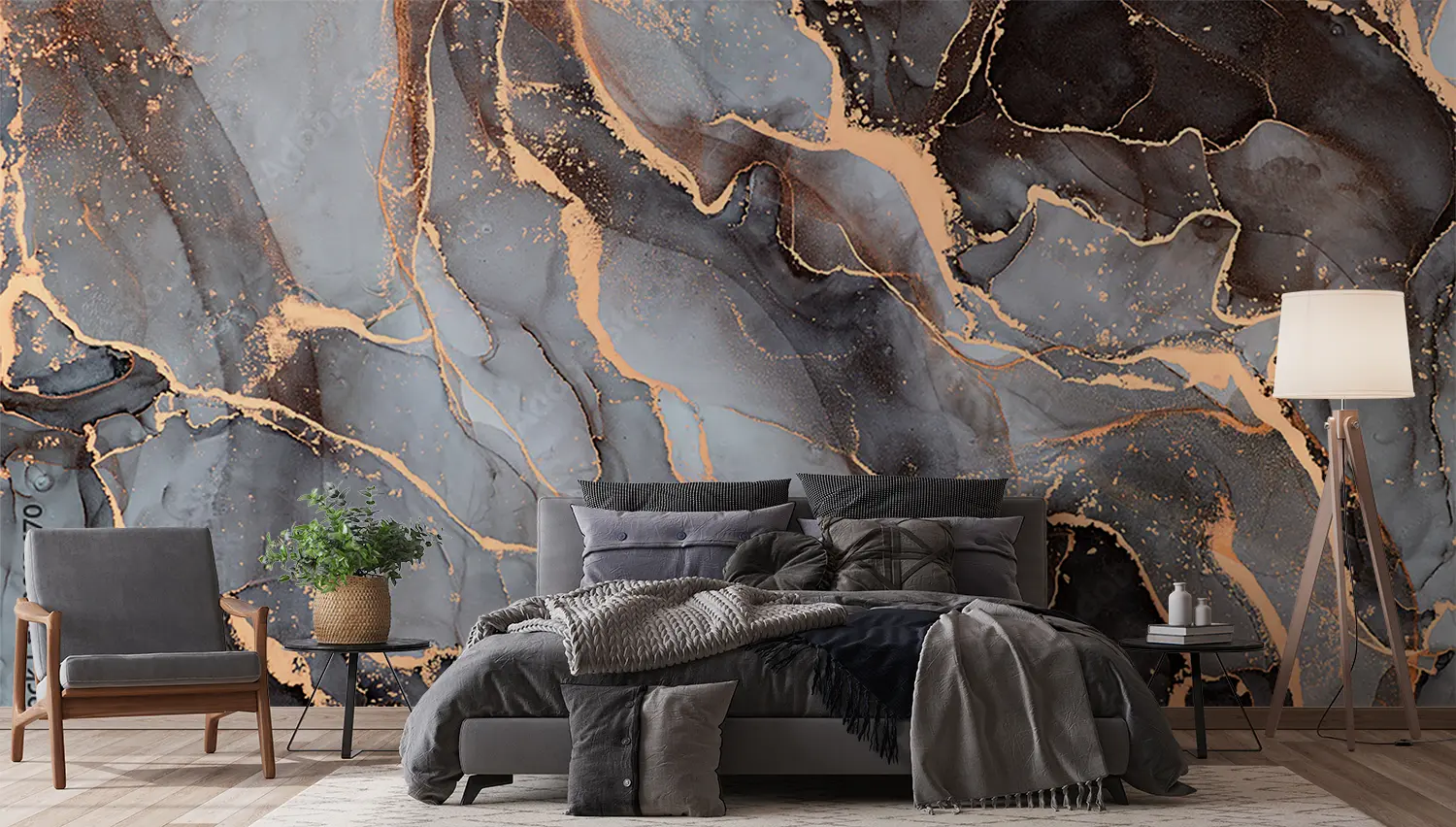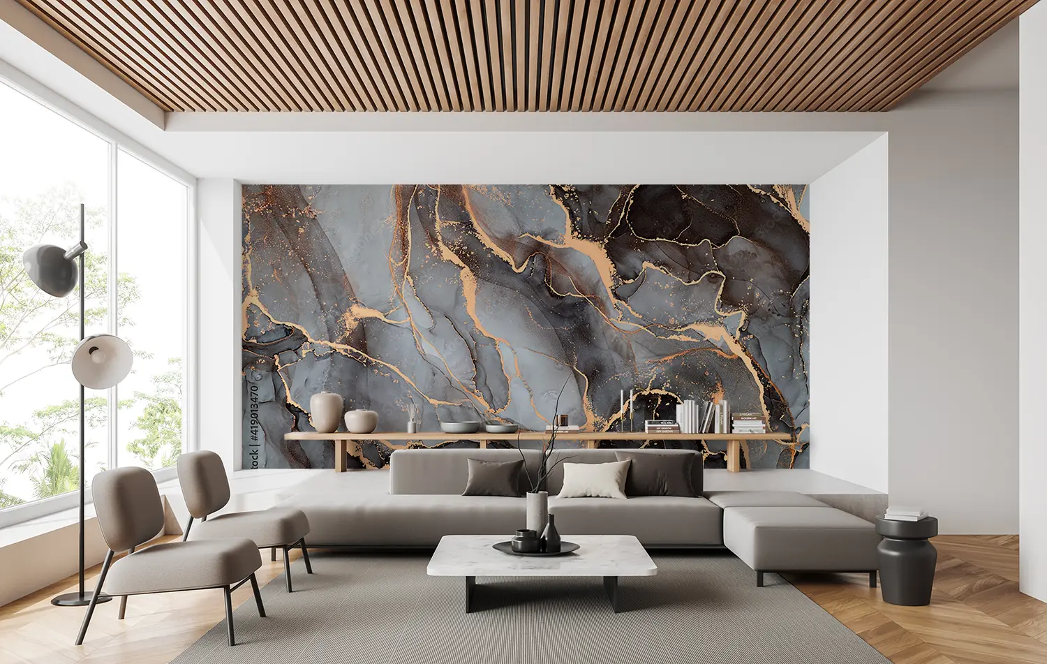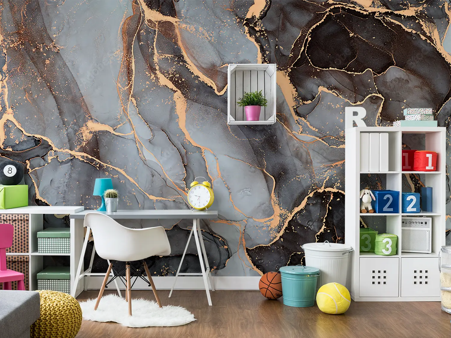 Transform your space with this luxurious marble surface featuring intricate gold and black patterns. Elevate your home decor with this stunning piece that exudes sophistication and style. Complementary colors to consider for a cohesive look include blue, white, and earthy tones. Add a touch of elegance to your walls with this captivating design.