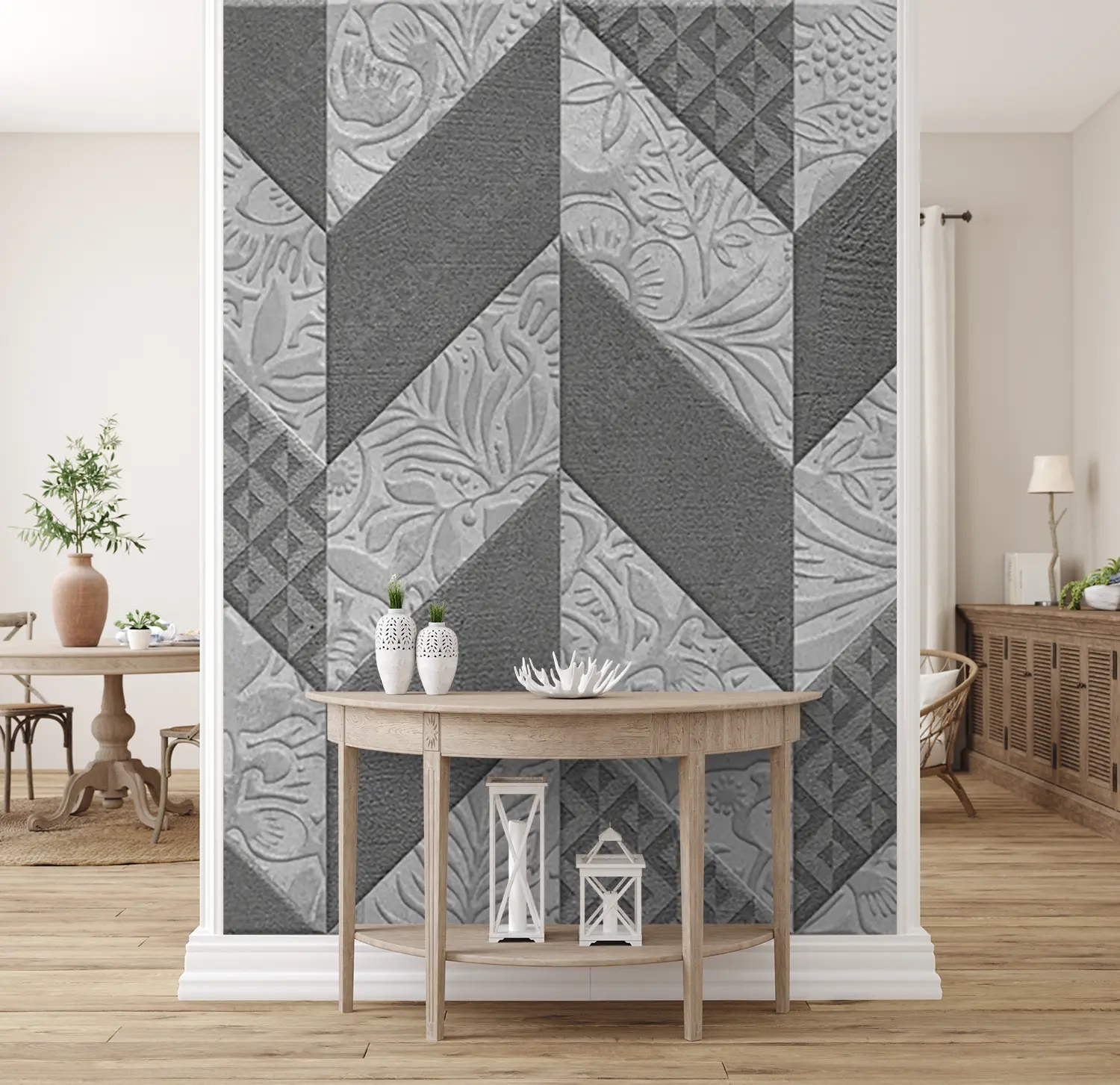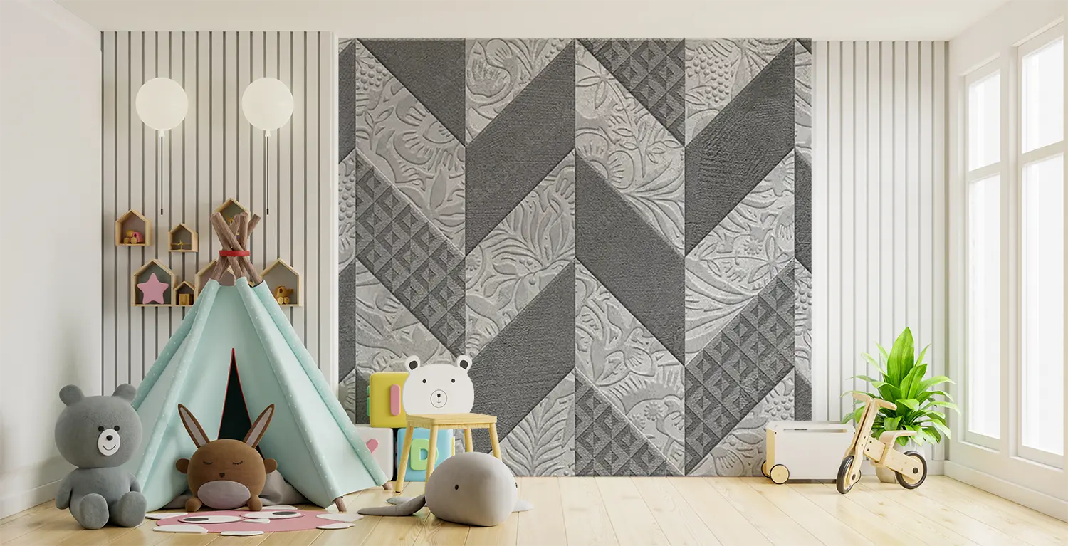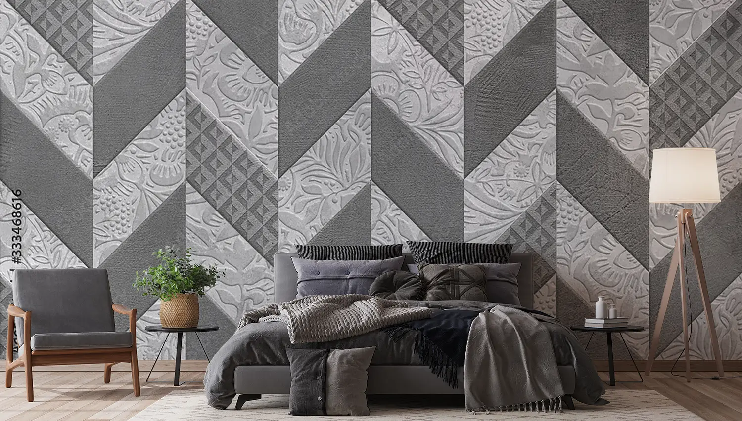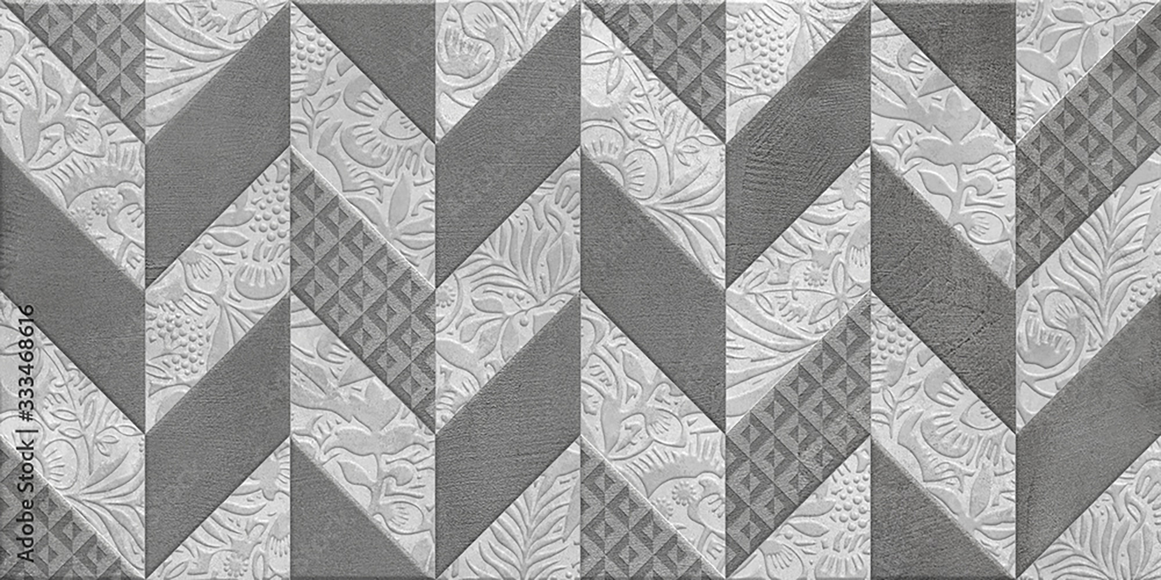 Adorn your space with the timeless beauty of a quilt-inspired wall design. This close-up image showcases a stunning pattern of flowers and leaves, adding a touch of sophistication to any room. The gray and white color scheme exudes a sense of tranquility, while the intricate design brings a sense of elegance to your home decor. Elevate your space with this captivating aesthetic piece.
