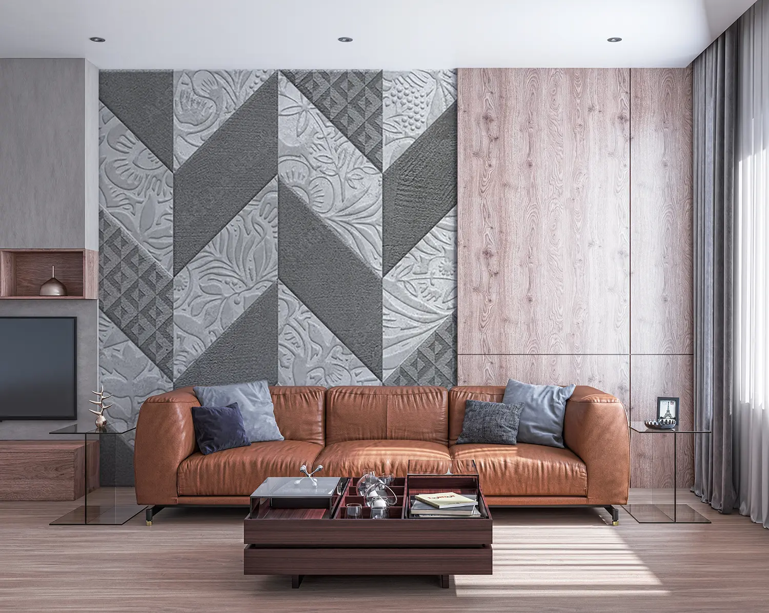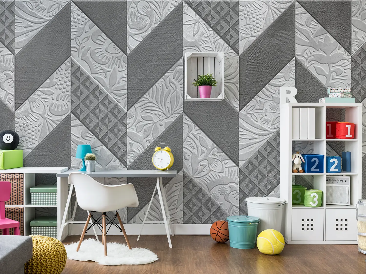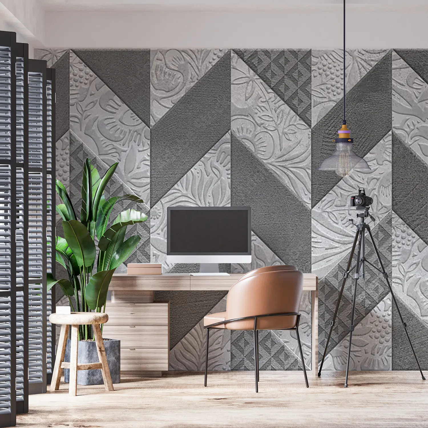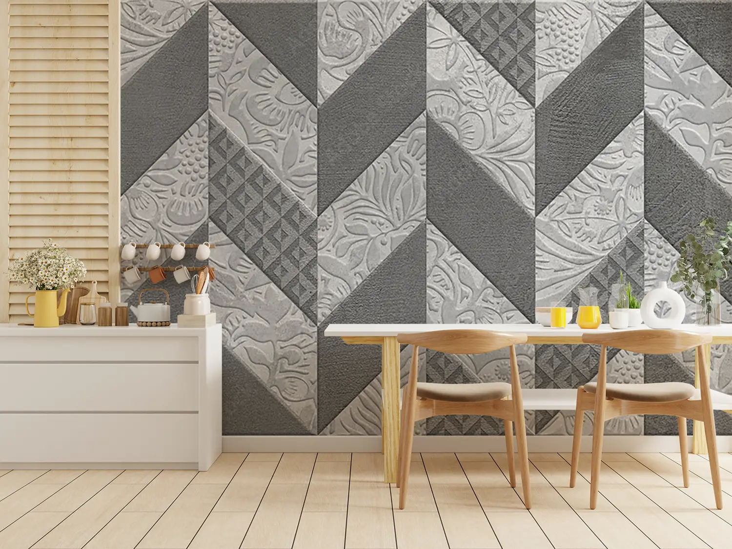 Adorn your space with the timeless beauty of a quilt-inspired wall design. This close-up image showcases a stunning pattern of flowers and leaves, adding a touch of sophistication to any room. The gray and white color scheme exudes a sense of tranquility, while the intricate design brings a sense of elegance to your home decor. Elevate your space with this captivating aesthetic piece.