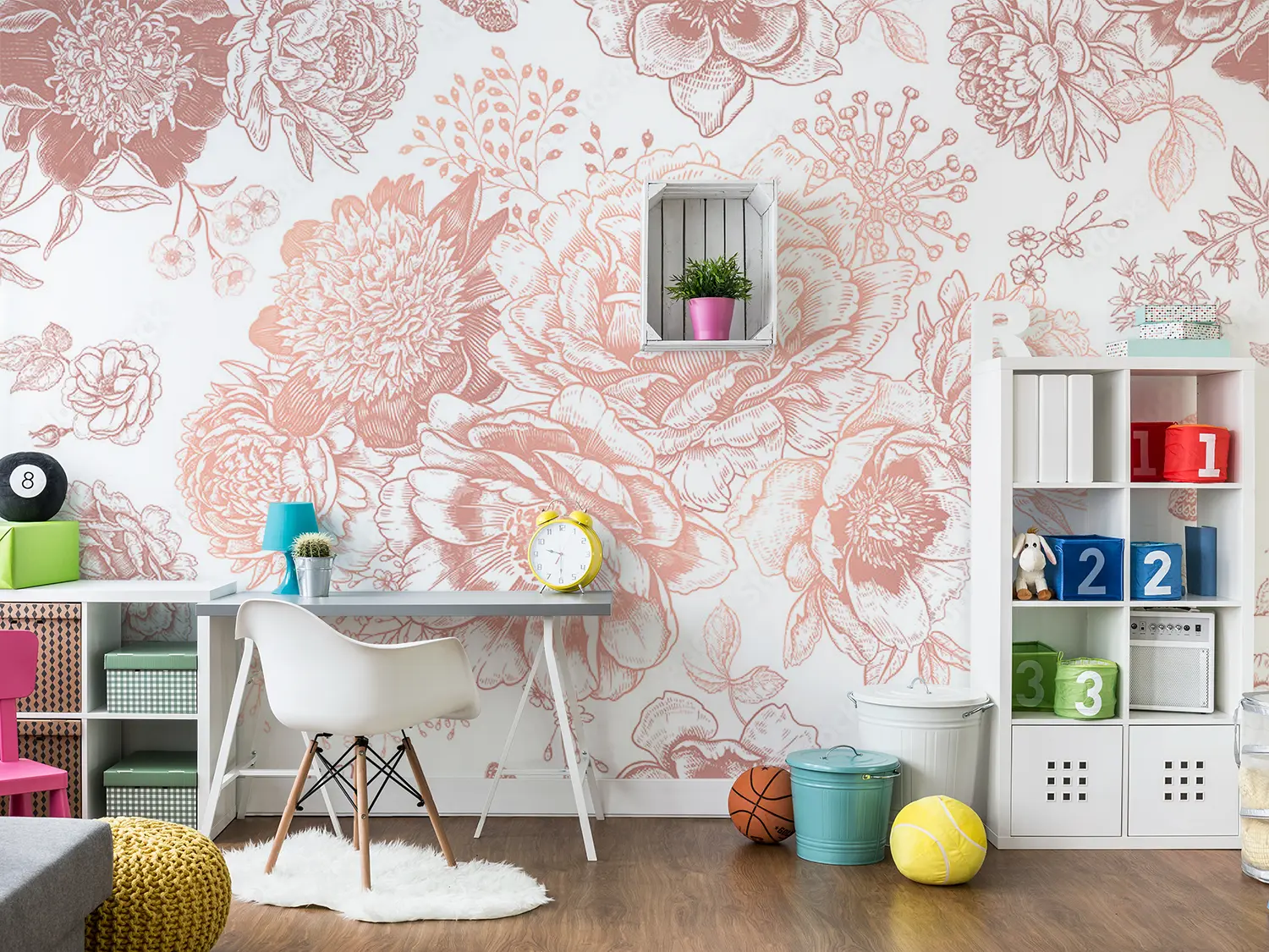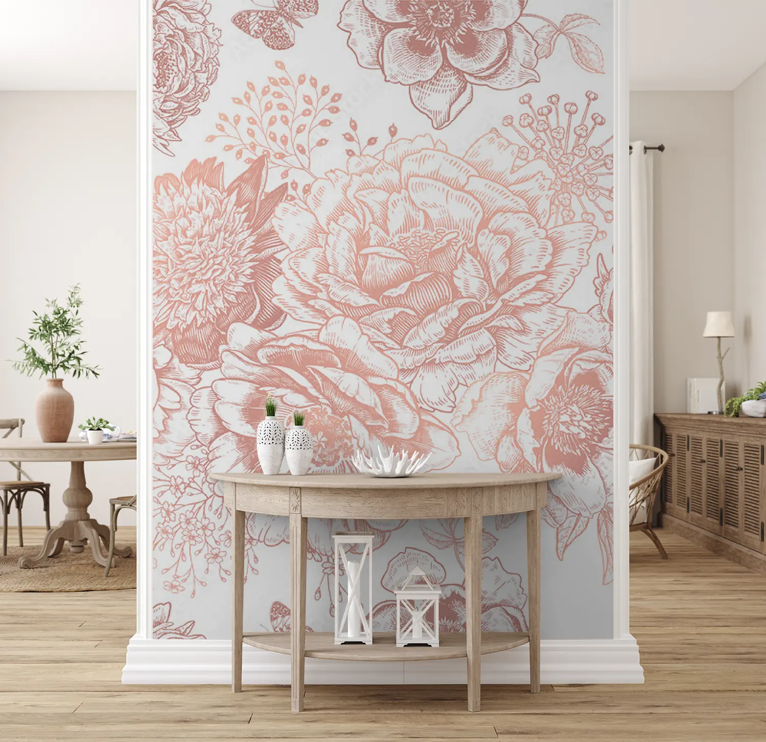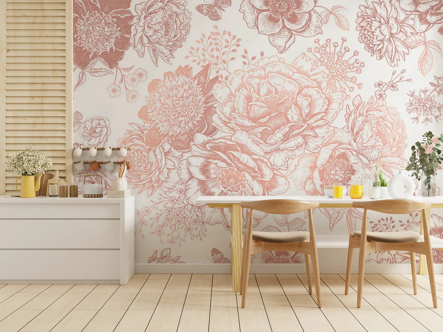 Elevate your living space with this stunning rose pattern wall design. The intricate floral details and soft pink hues create a romantic and charming ambiance. Perfect for adding a touch of elegance to any room. Pair with soft neutrals like ivory and blush pink for a harmonious and sophisticated look. A must-have for lovers of timeless beauty.