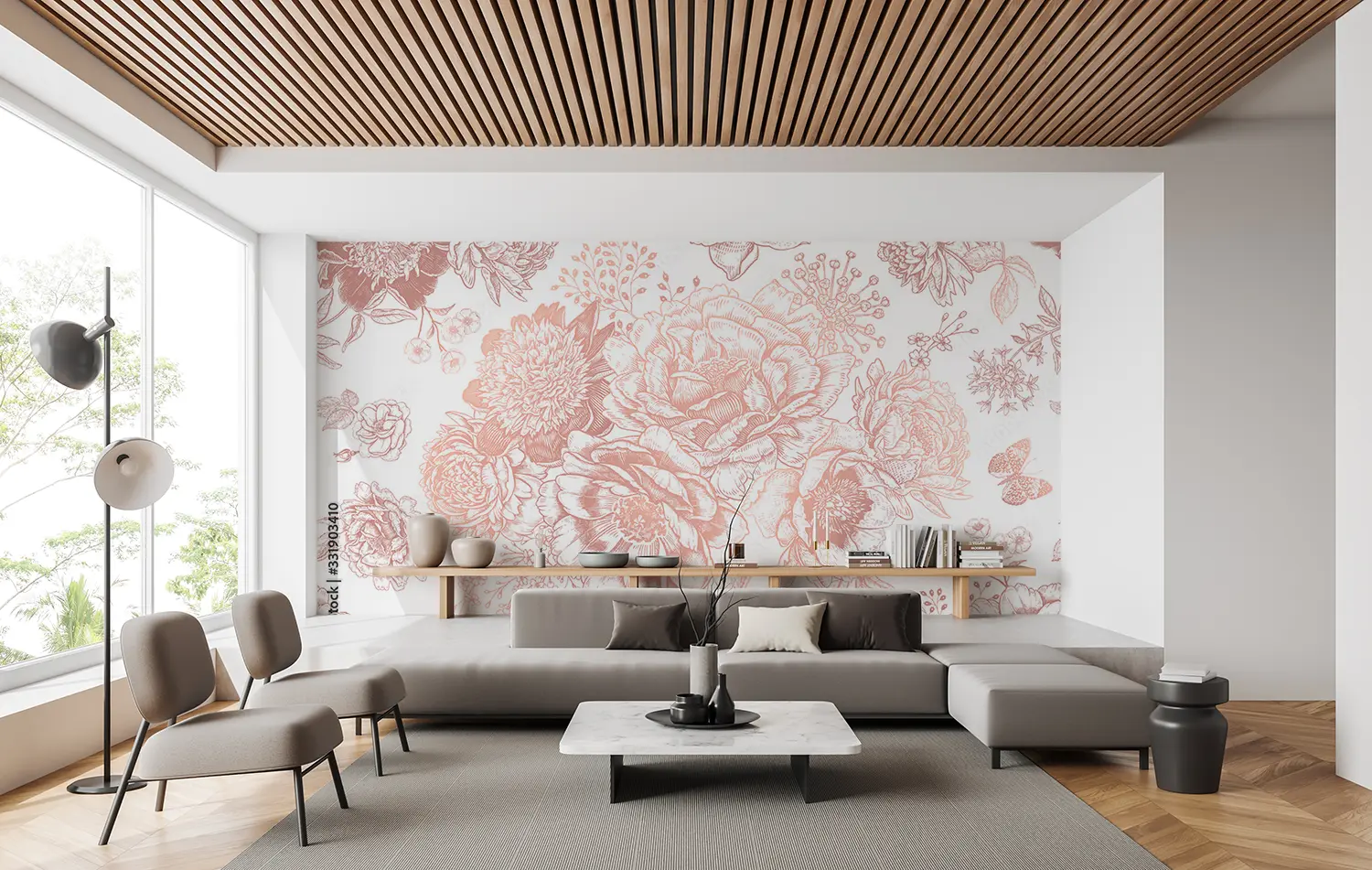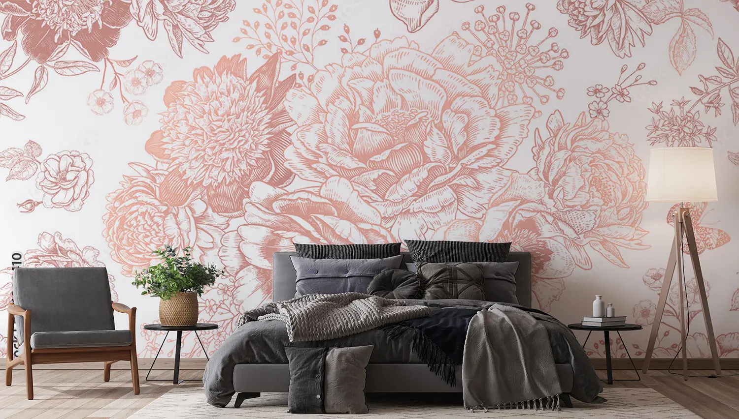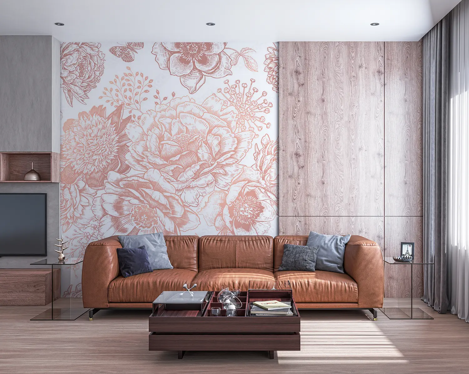 Elevate your living space with this stunning rose pattern wall design. The intricate floral details and soft pink hues create a romantic and charming ambiance. Perfect for adding a touch of elegance to any room. Pair with soft neutrals like ivory and blush pink for a harmonious and sophisticated look. A must-have for lovers of timeless beauty.