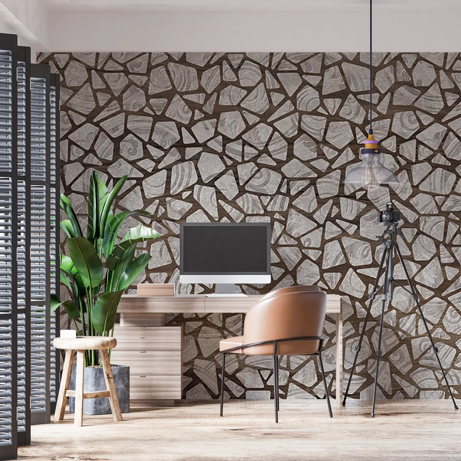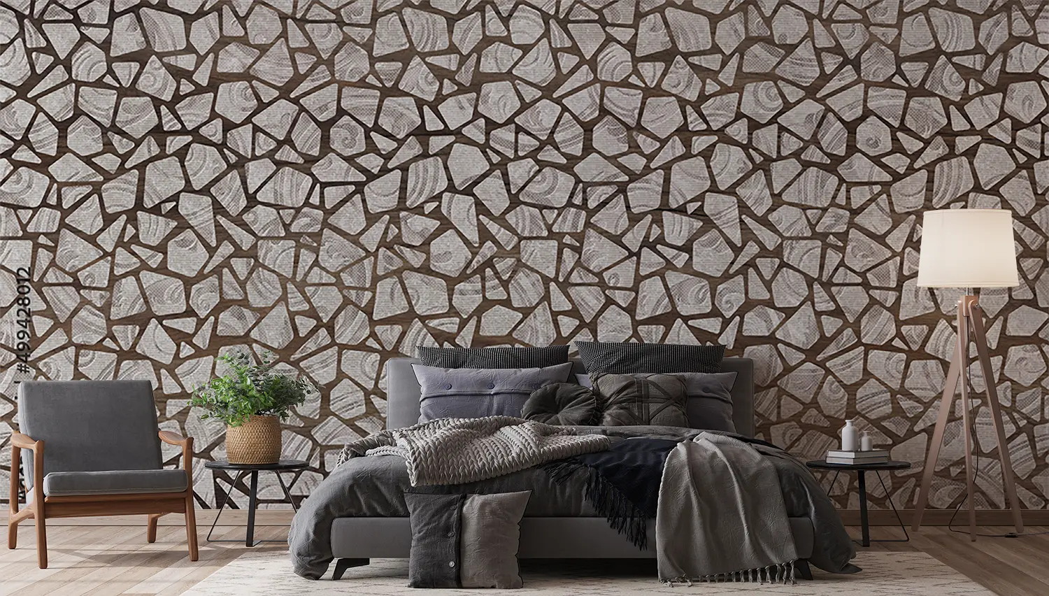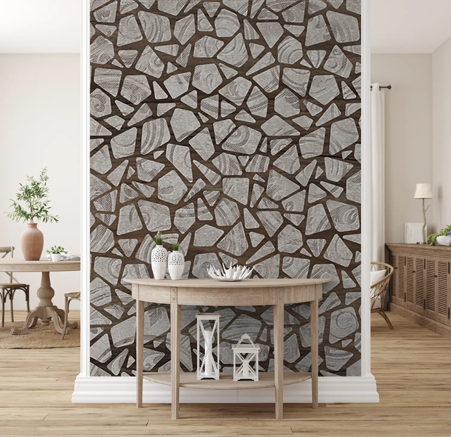 Adorn your space with this stunning wall pattern featuring a mix of broken glass and mosaic tiles in brown and white hues. Enhance your home's aesthetic appeal with this intricate design that adds texture and style to any room. Complementary colors include shades of brown, white, and earthy tones for a cohesive look that exudes sophistication.