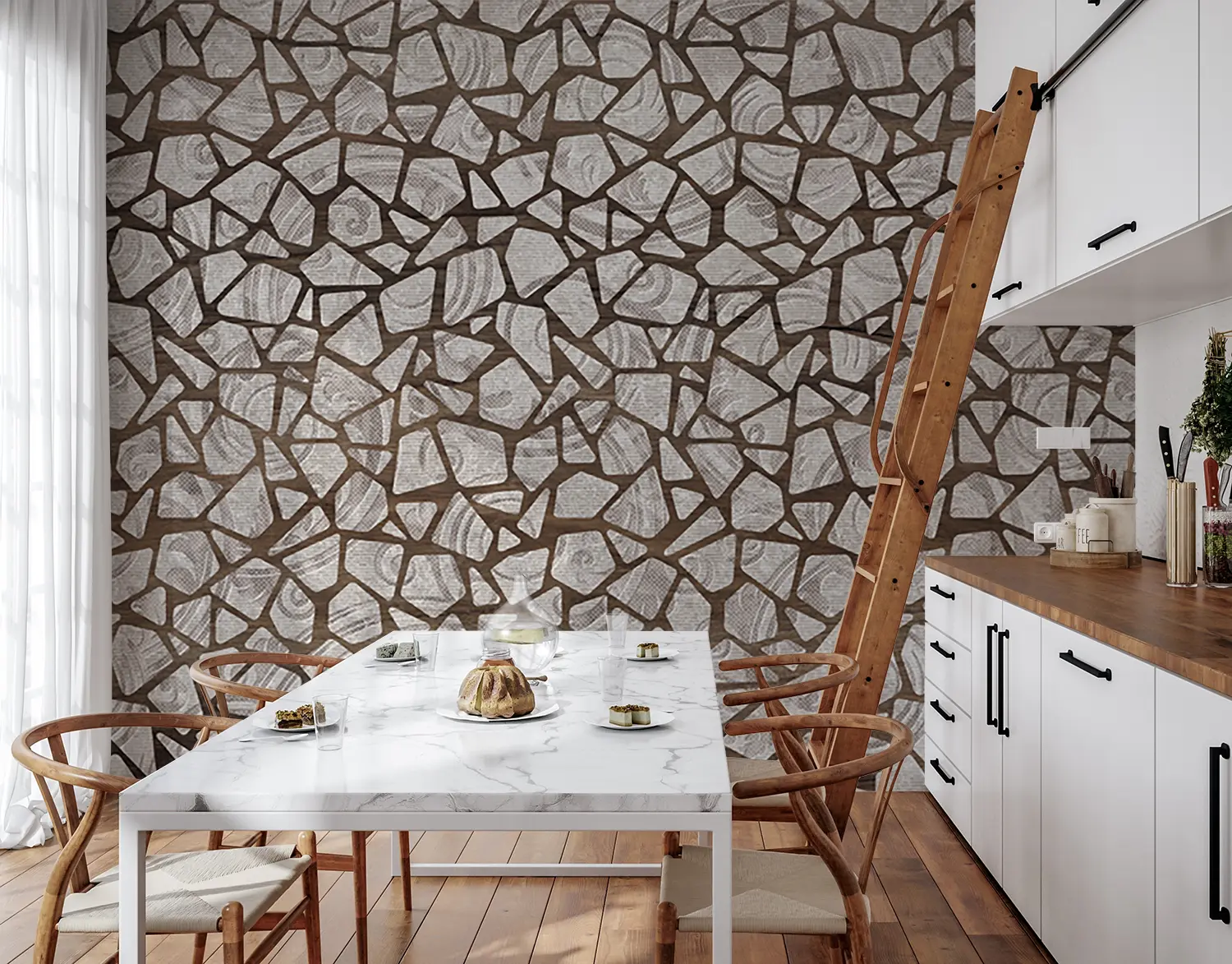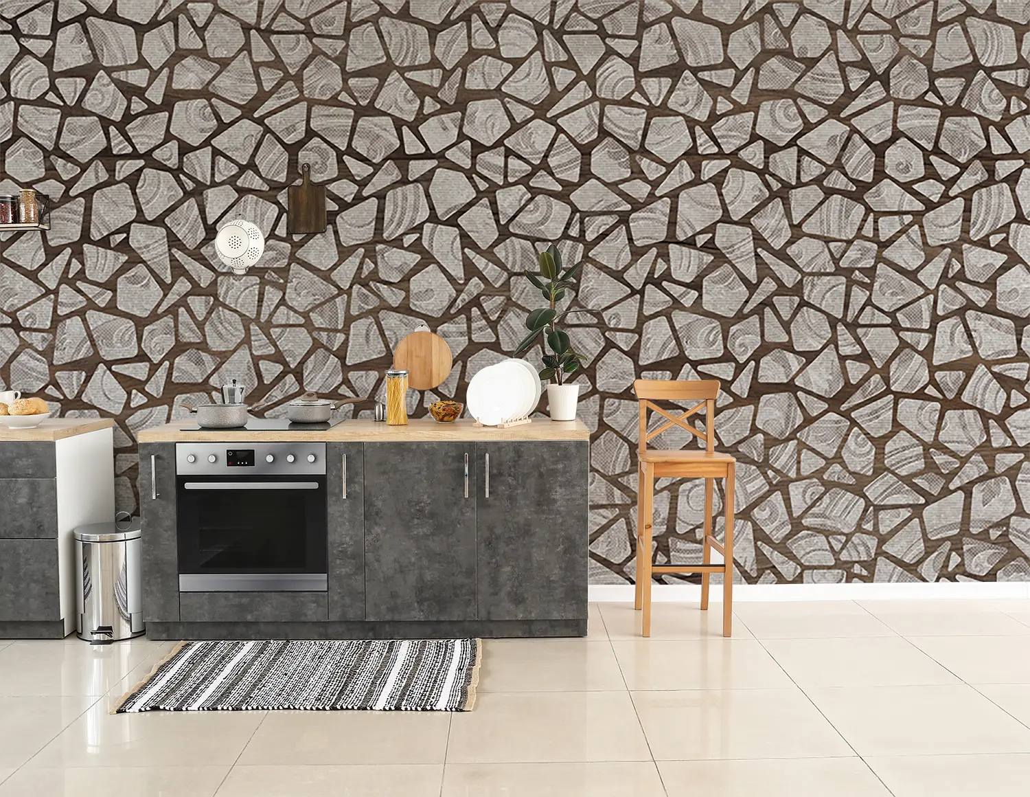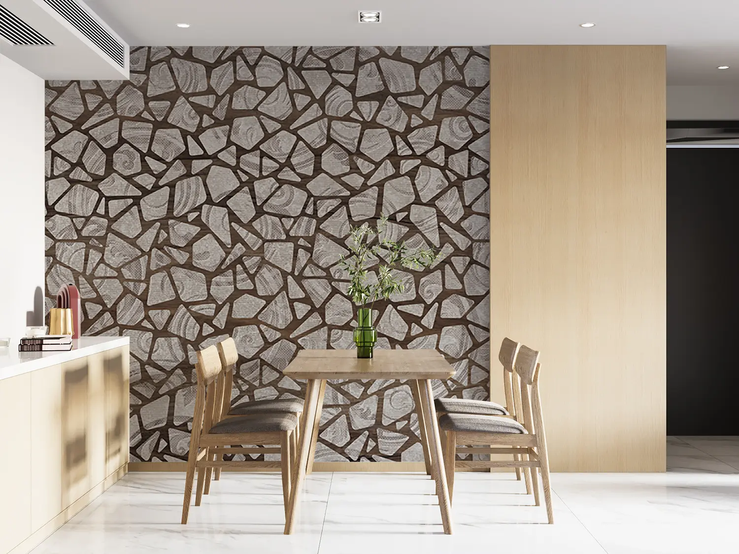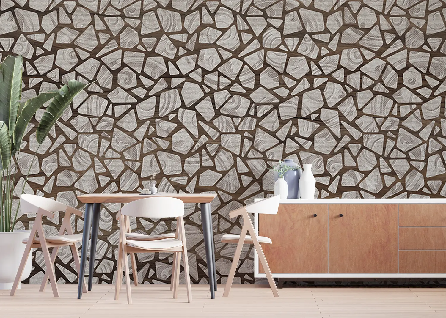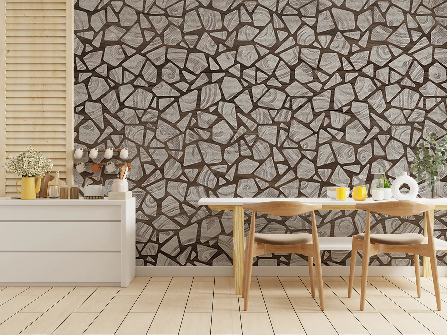 Elevate your home decor with this stunning wall pattern featuring a mix of broken glass and mosaic tiles in brown and white hues. The intricate design adds a touch of sophistication to any room, creating a visually appealing focal point. Complementary colors include shades of brown, white, and gray for a cohesive and stylish look.