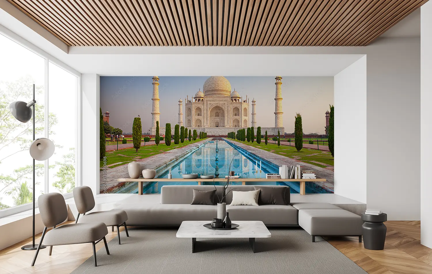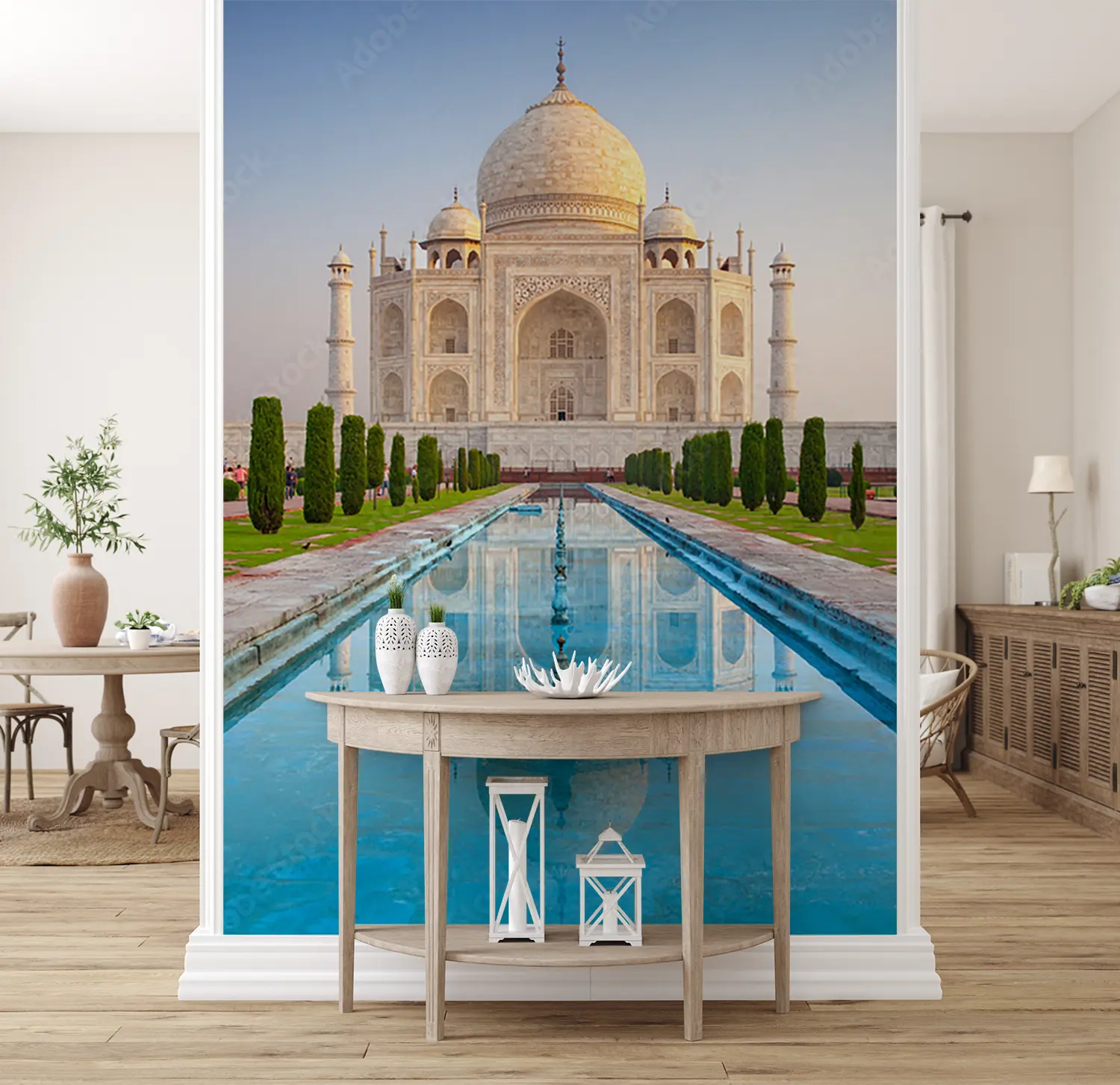 Transform your space with this stunning image of a large white building and a shimmering pool, creating a sophisticated and serene atmosphere. This wall art exudes elegance and is perfect for enhancing your home decor. Pair it with shades of blue, grey, and green to complement the peaceful and luxurious vibe of the scene.