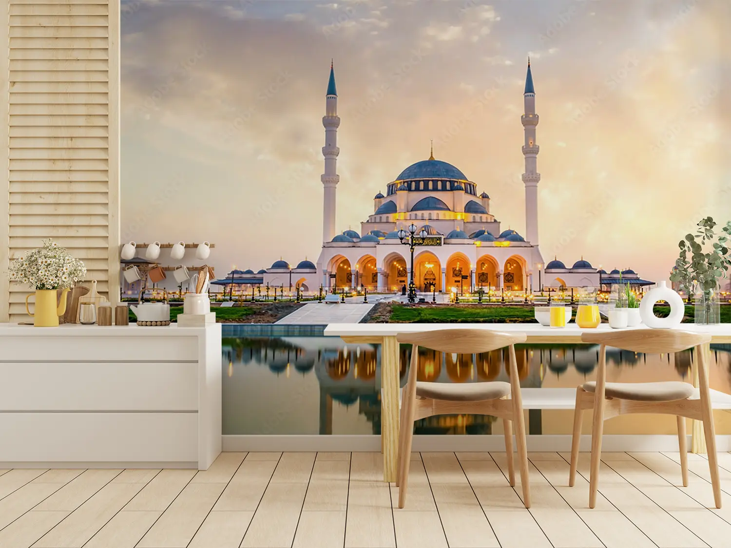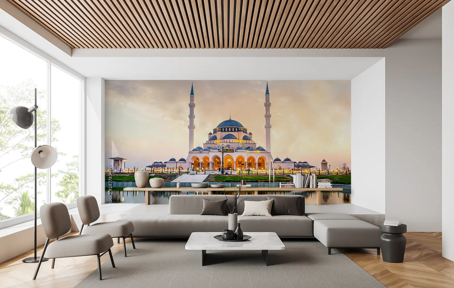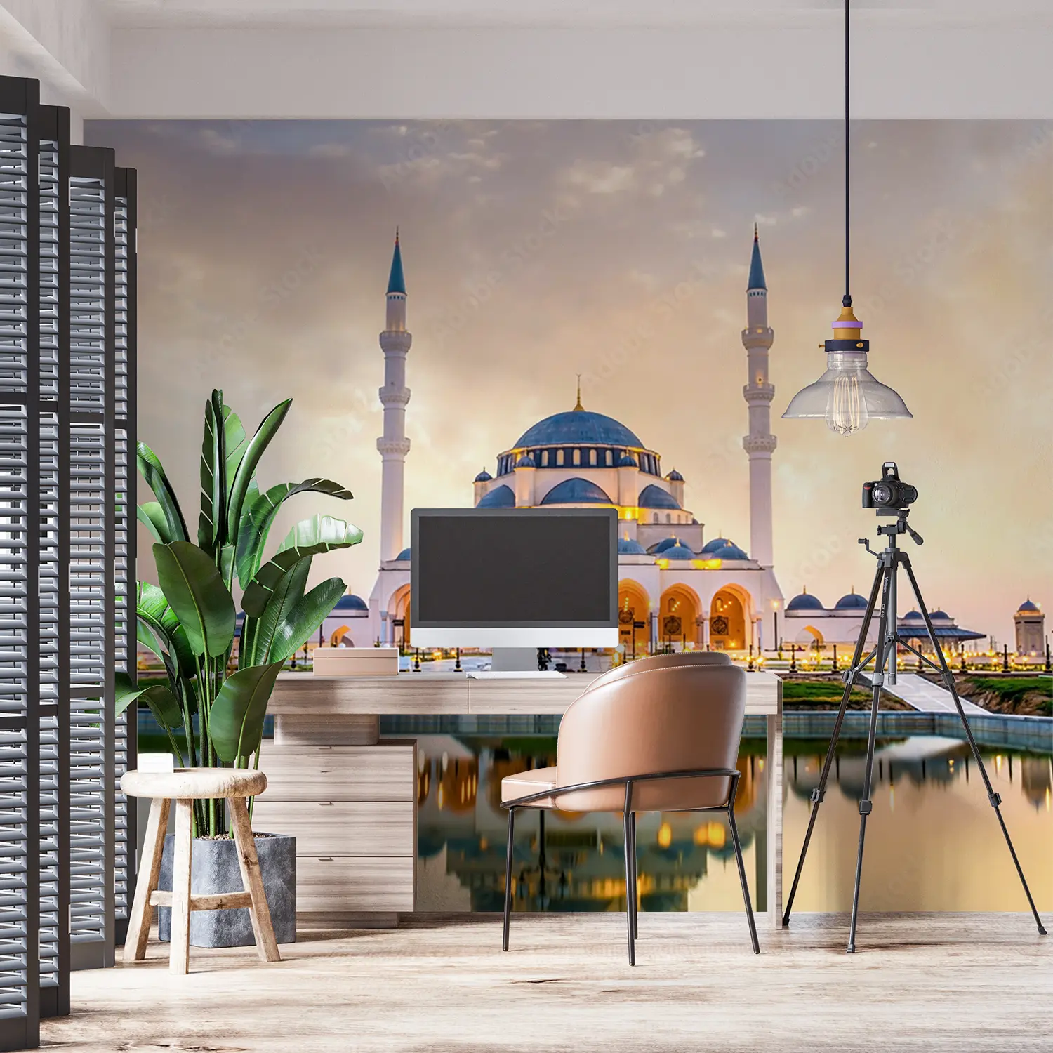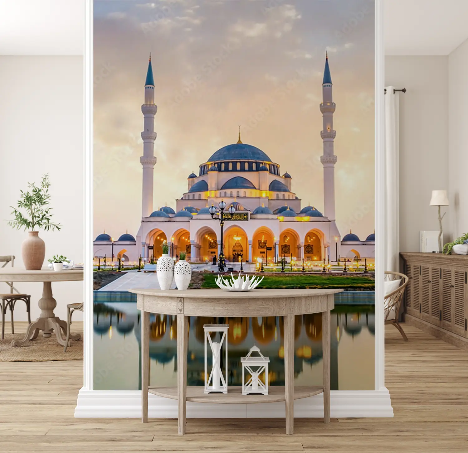 Transform your space with this stunning image of a large white building featuring a captivating blue dome. The intricate architecture adds a touch of sophistication to any room, making it a perfect choice for home decor enthusiasts. Complementary colors to consider for your decor palette include shades of beige, brown, and blue for a harmonious look.