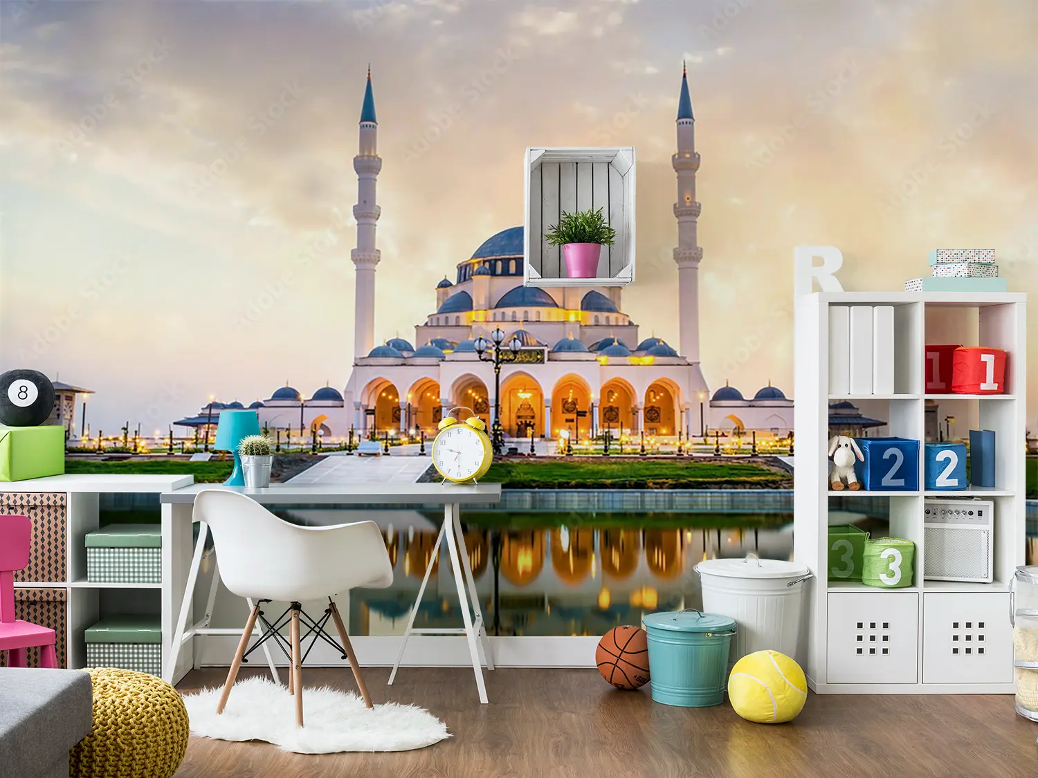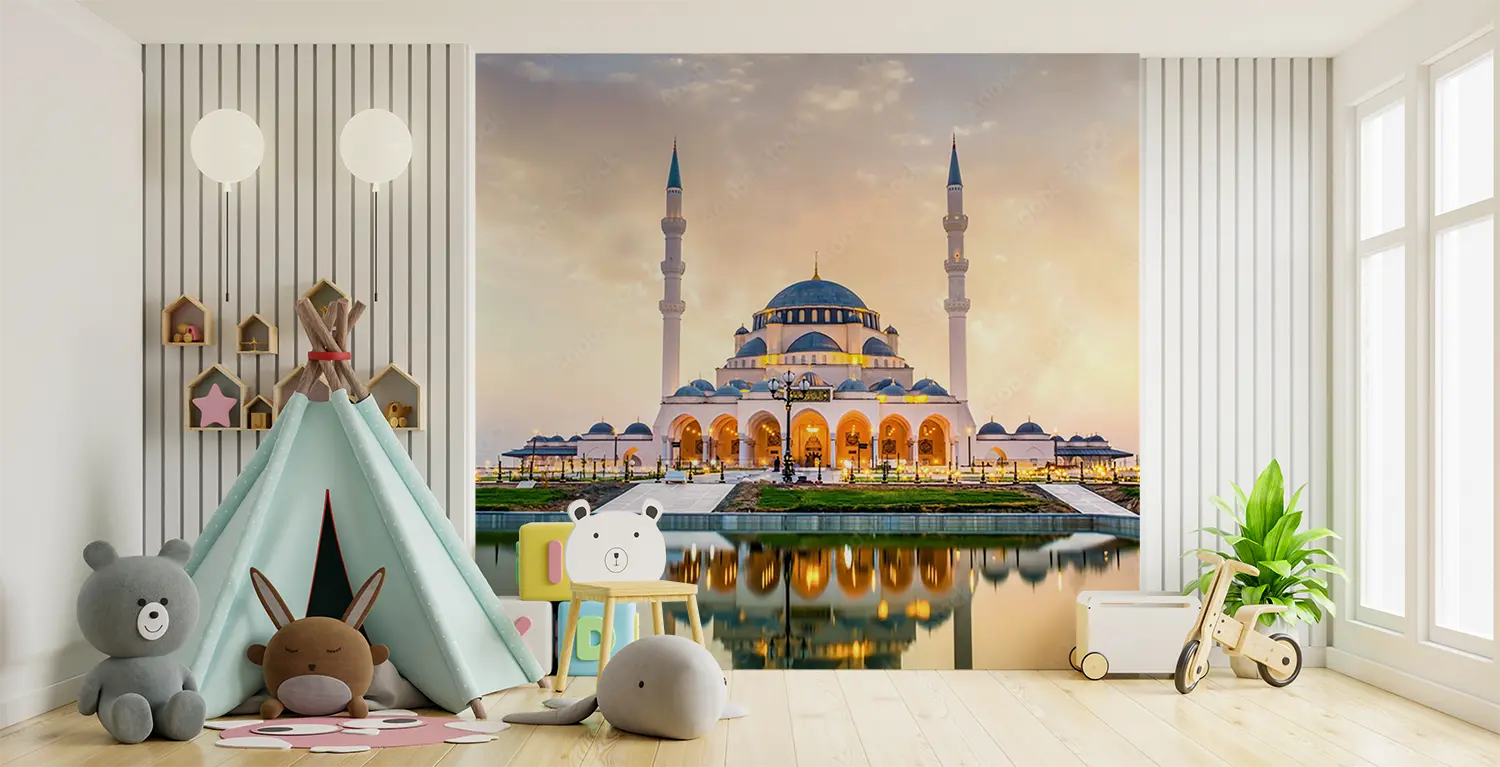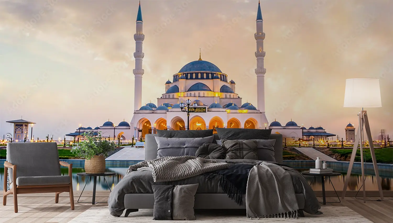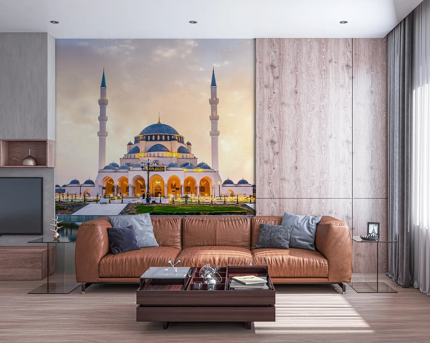 Transform your space with this stunning image of a large white building featuring a captivating blue dome. The intricate architecture adds a touch of sophistication to any room, making it a perfect choice for home decor enthusiasts. Complementary colors to consider for your decor palette include shades of beige, brown, and blue for a harmonious look.