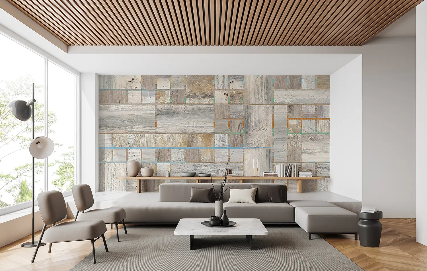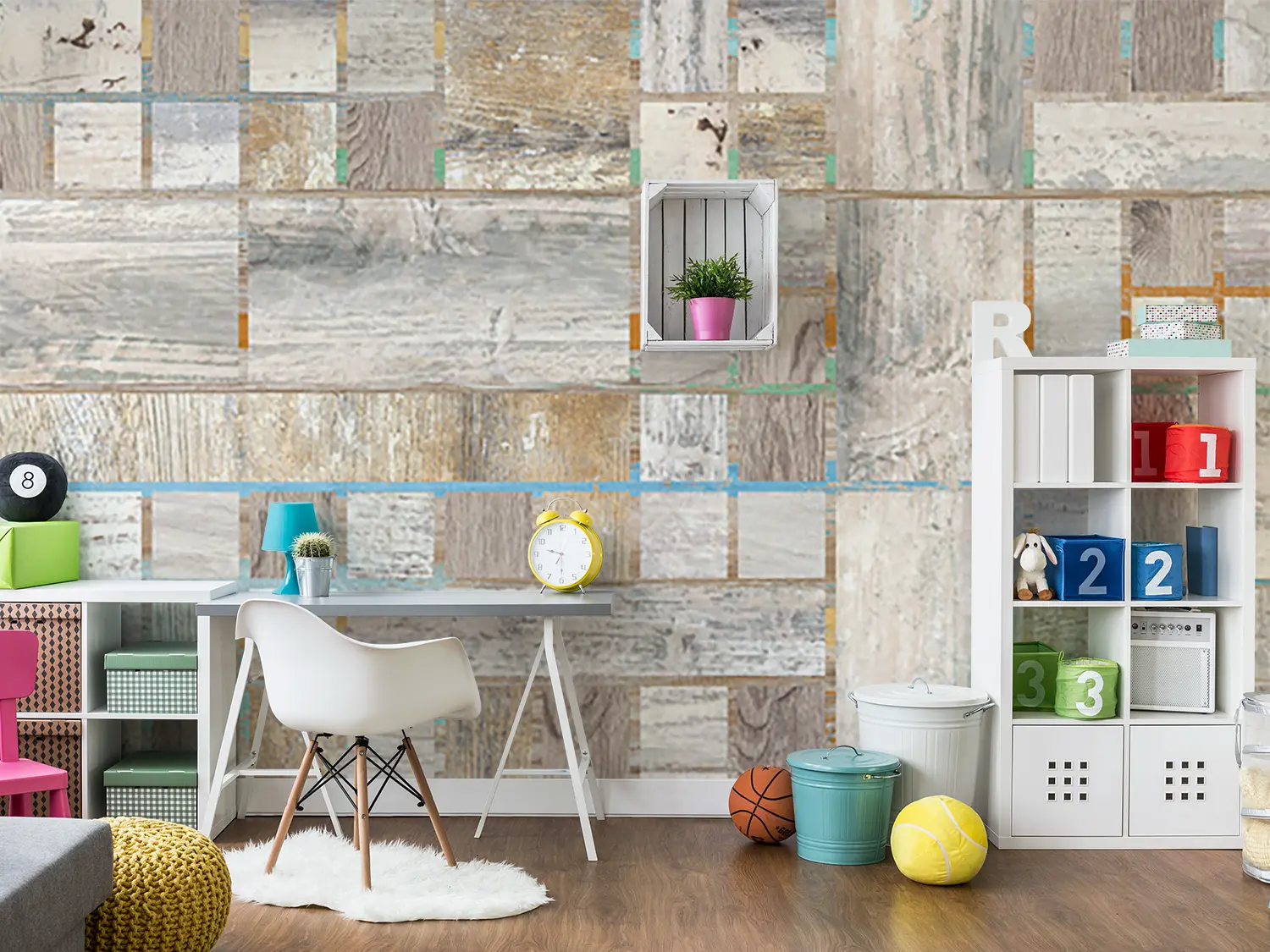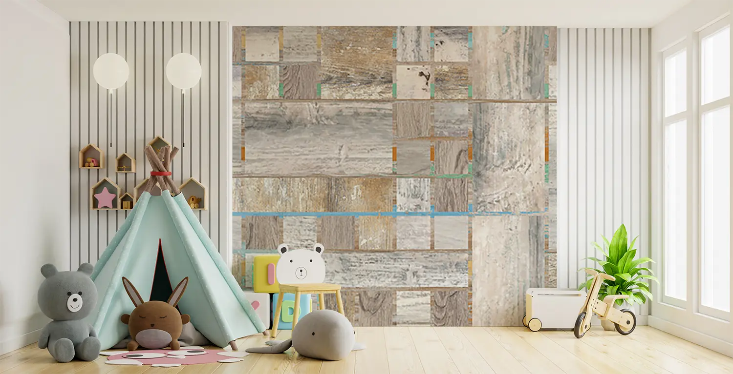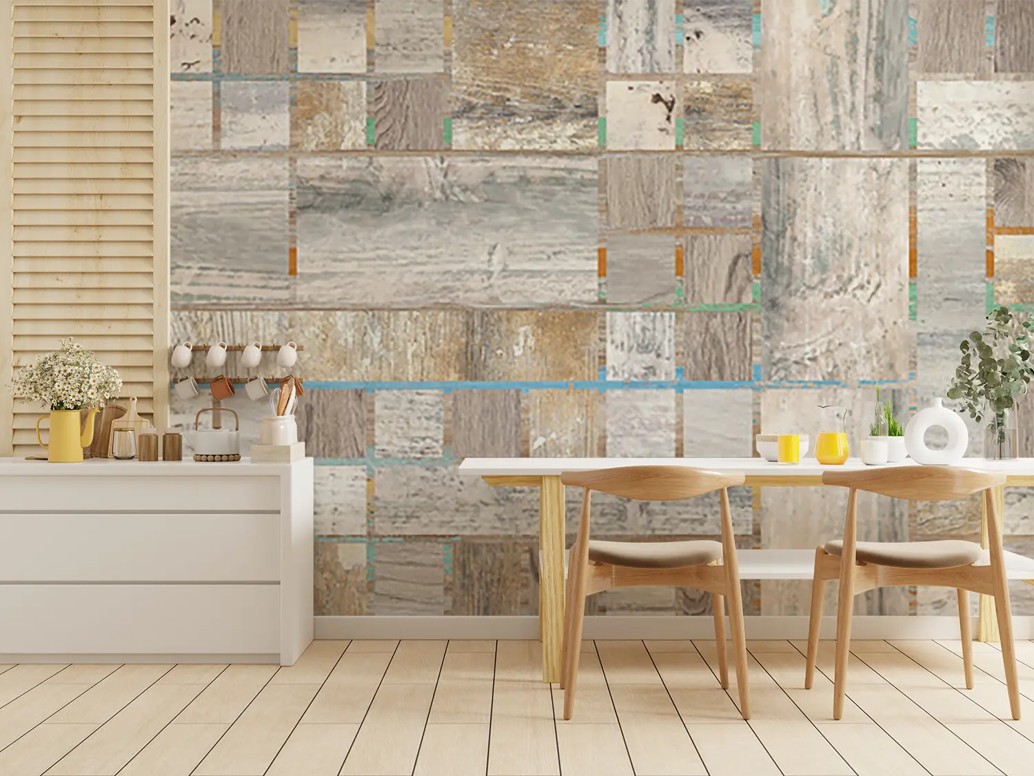 Elevate your home decor with this stunning wood panel wall featuring a variety of colors and patterns. The intricate design adds a touch of sophistication and warmth to any room. Complementary colors like soft blues, whites, and neutrals will enhance the aesthetic appeal of this unique wall art. Perfect for creating a stylish focal point in your living space.