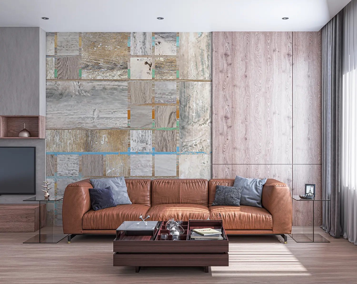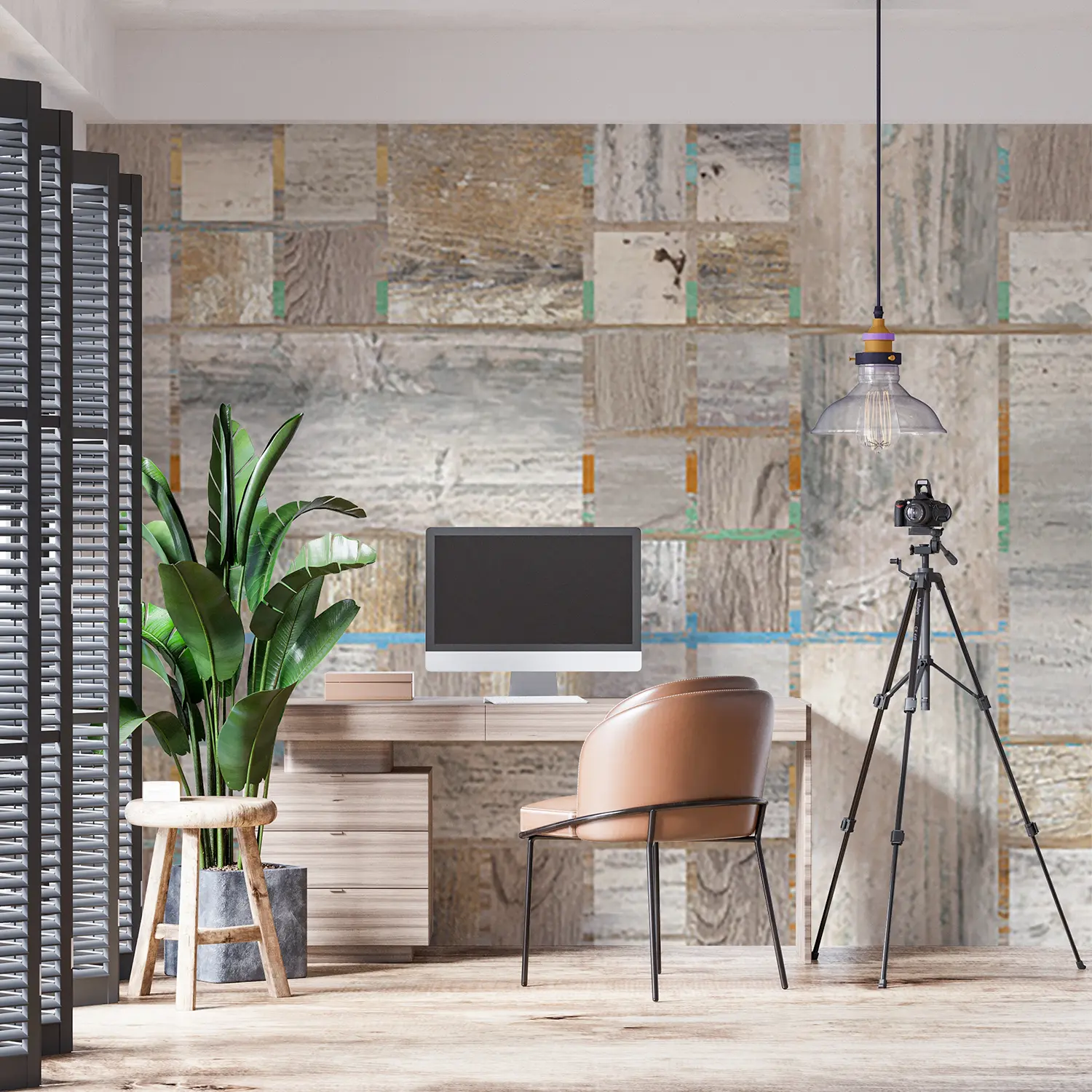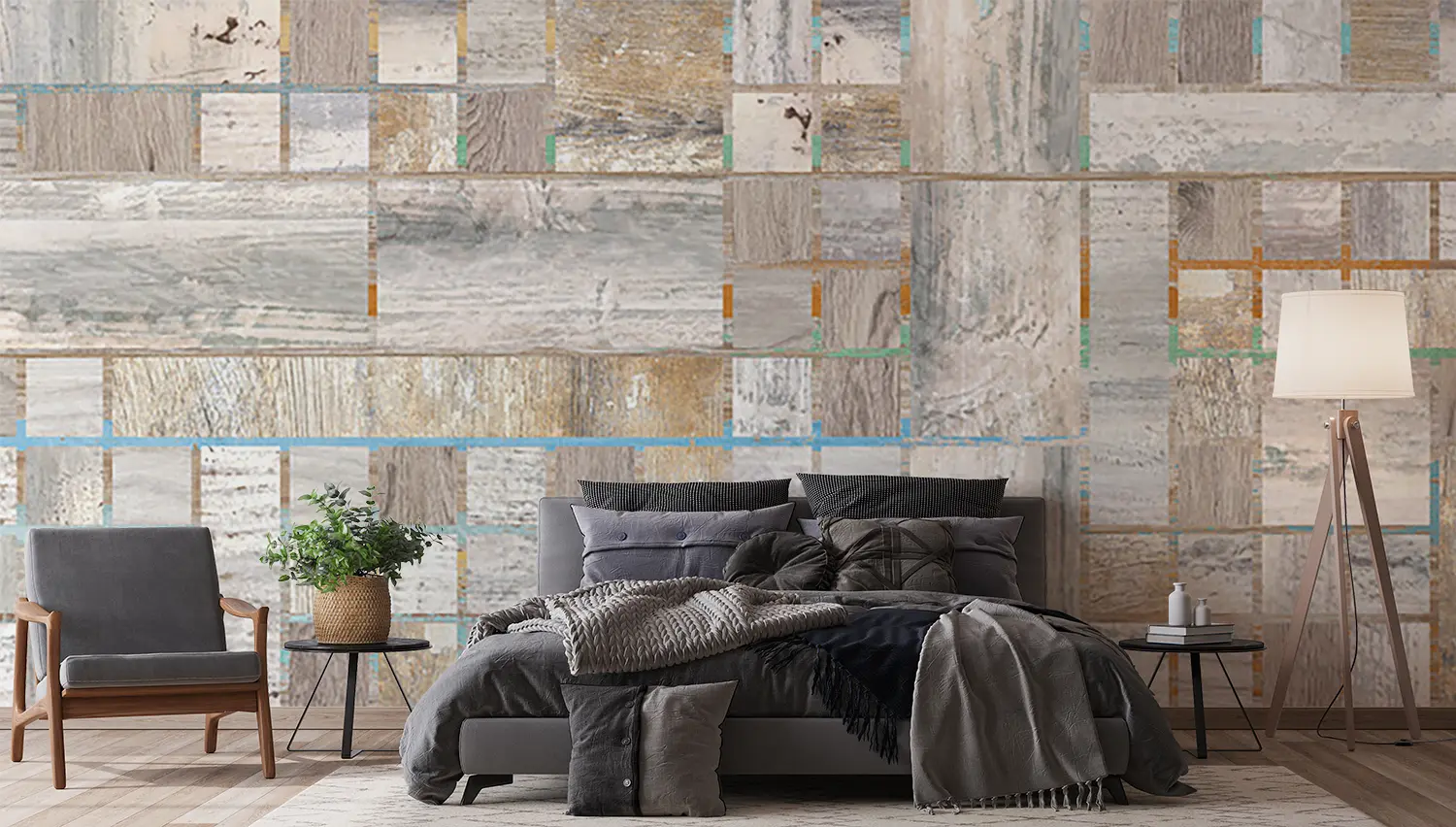 Elevate your home decor with this stunning wood panel wall featuring a variety of colors and patterns. The intricate design adds a touch of sophistication and warmth to any room. Complementary colors like soft blues, whites, and neutrals will enhance the aesthetic appeal of this unique wall art. Perfect for creating a stylish focal point in your living space.