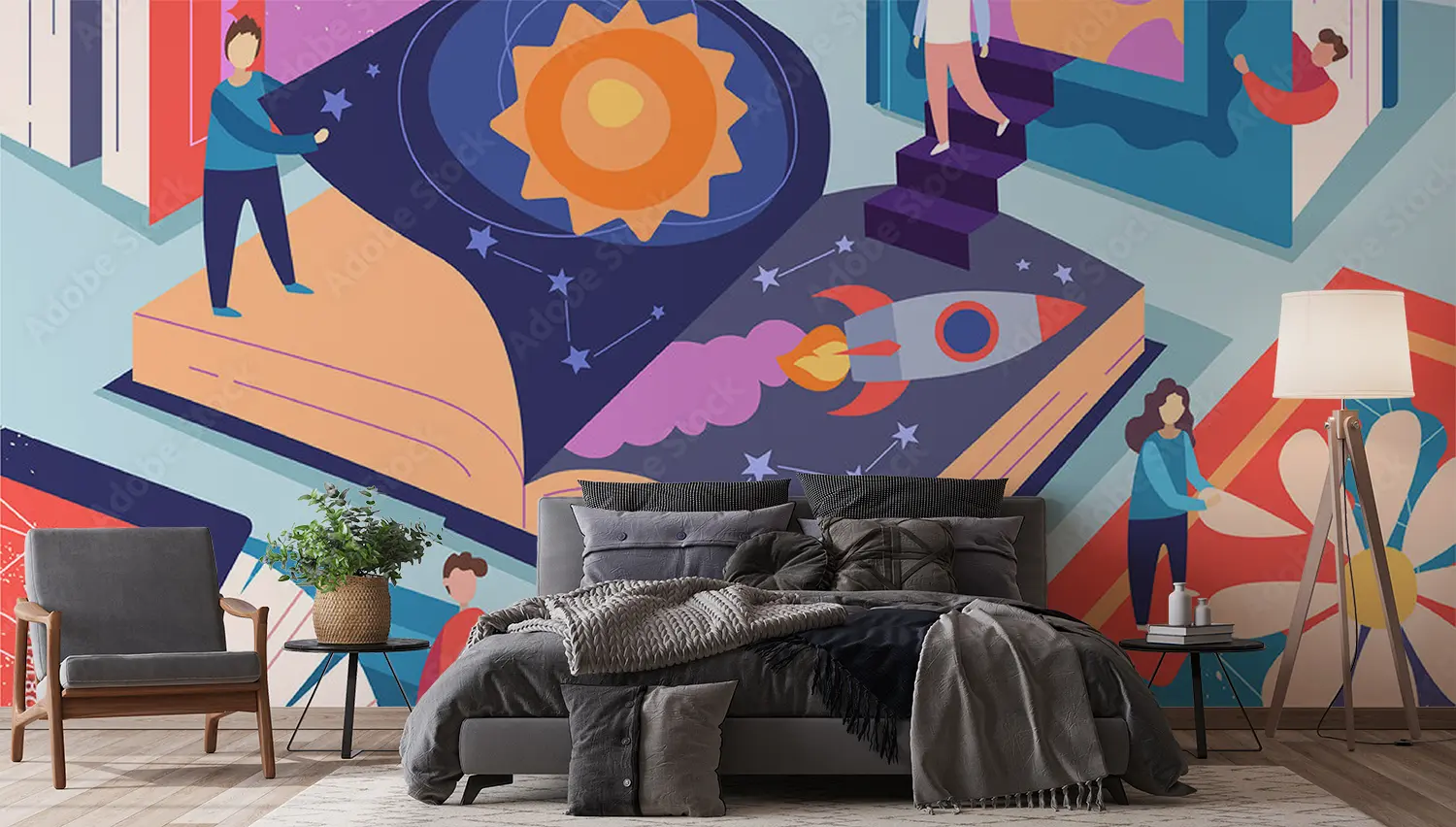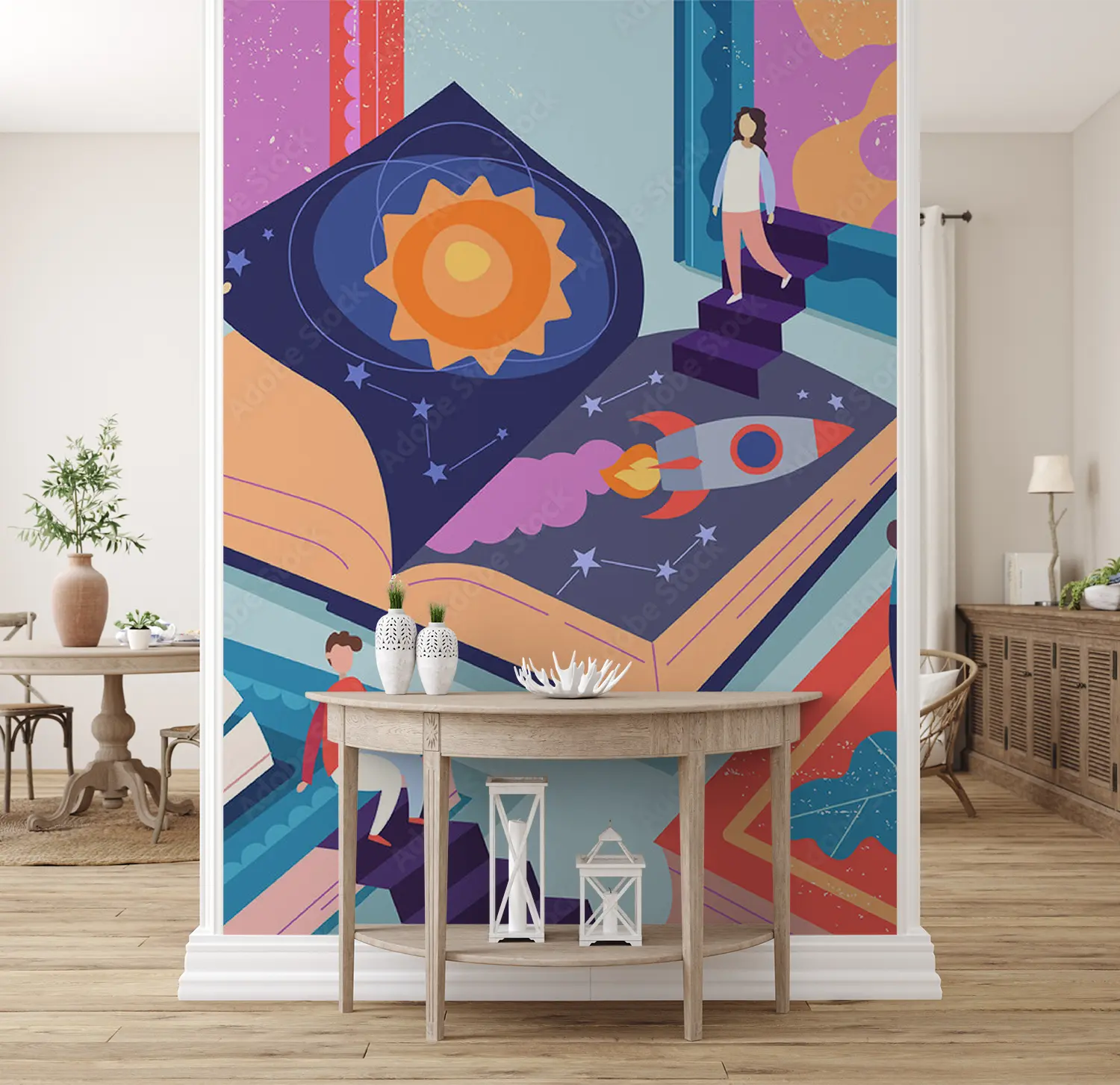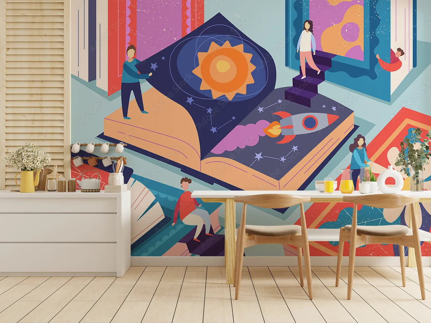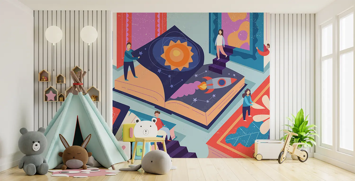 Transform your space with this enchanting wall art featuring a group of people standing around a captivating book. The serene color palette of soft blues and warm neutrals adds a touch of sophistication to any room. Elevate your home decor with this unique piece that sparks creativity and imagination.
