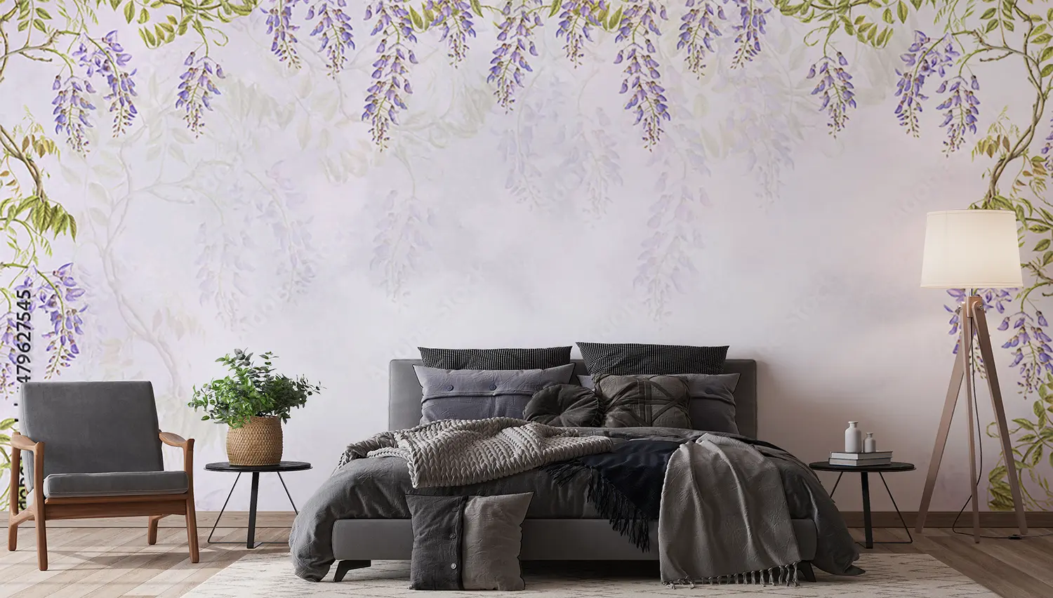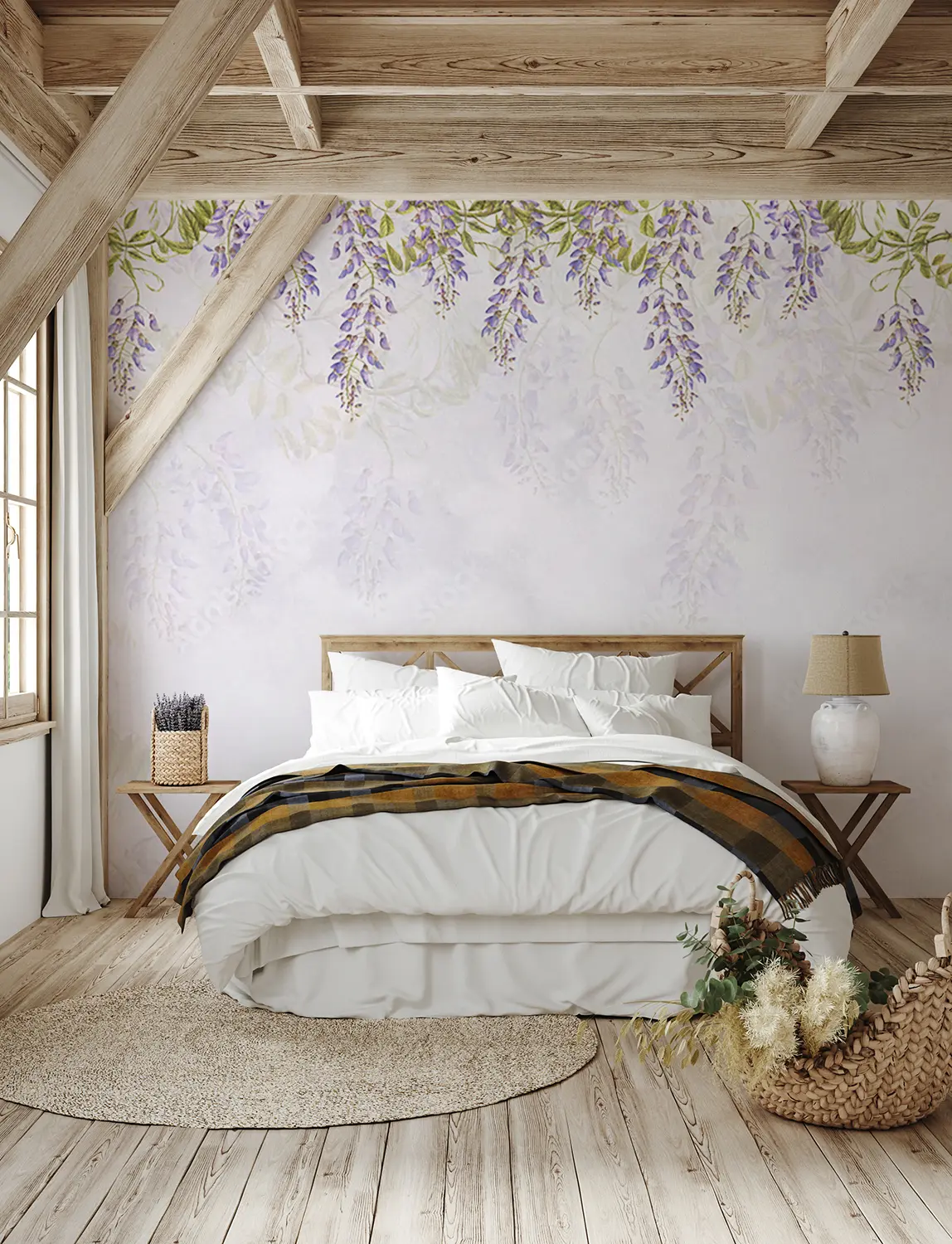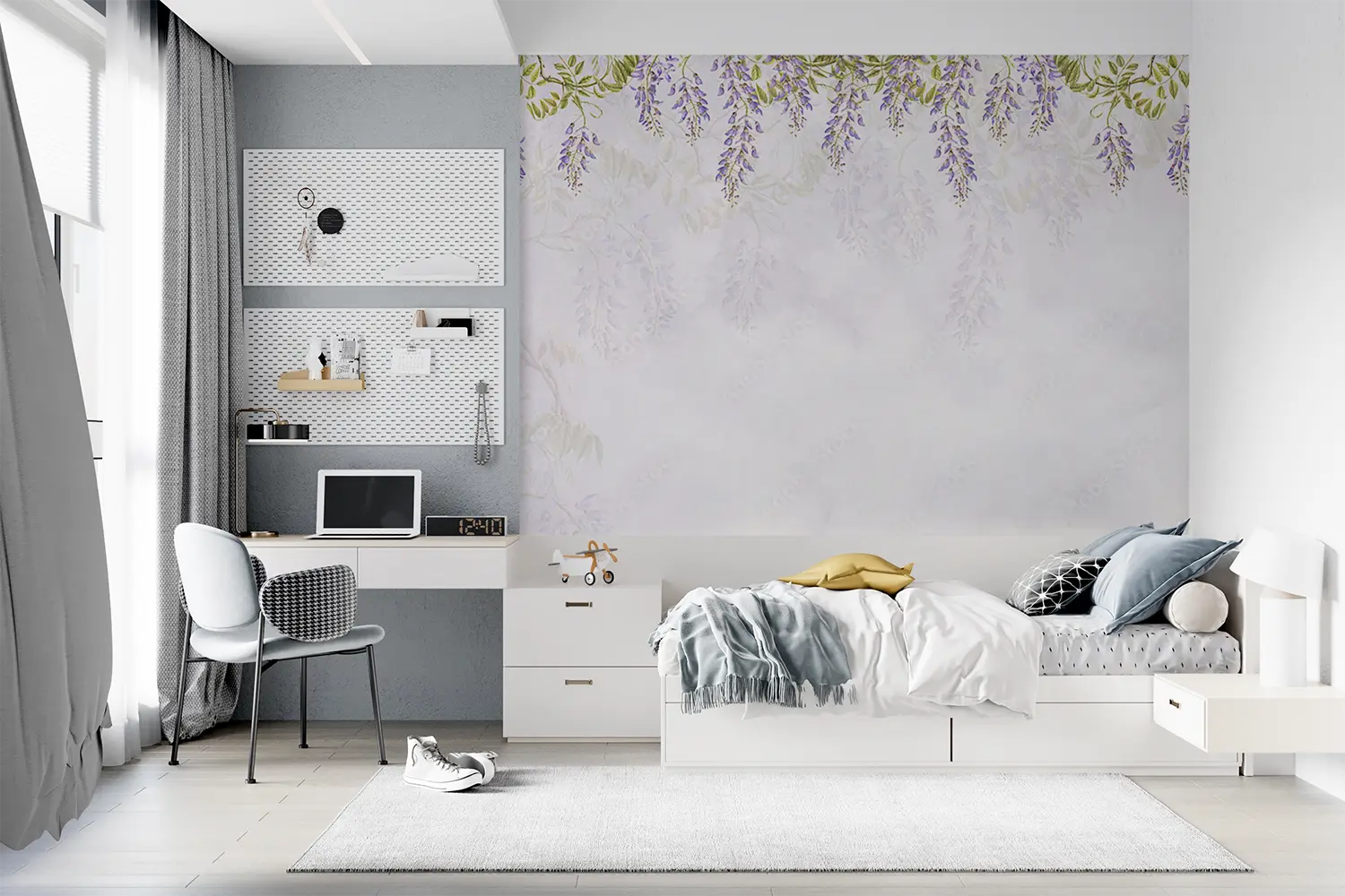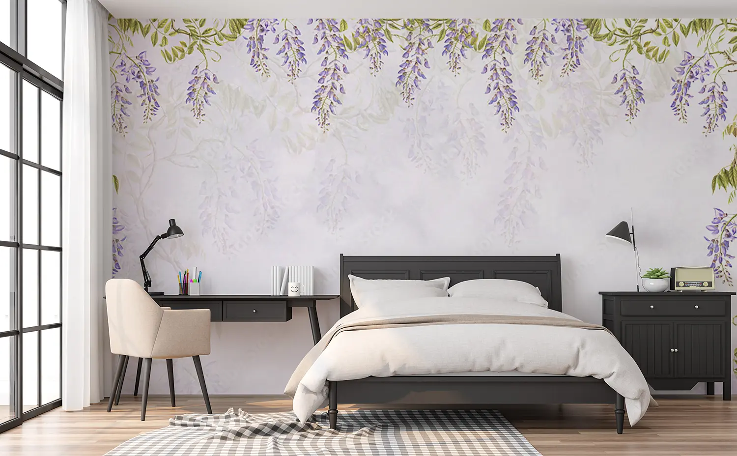 Transform your living space with this stunning white and purple floral background adorned with a border of delicate purple flowers. Elevate your home decor with this captivating piece that exudes elegance and charm. Complementary colors to consider are lavender, blue, and white, creating a harmonious and soothing atmosphere in any room. Add a touch of nature-inspired beauty to your walls.