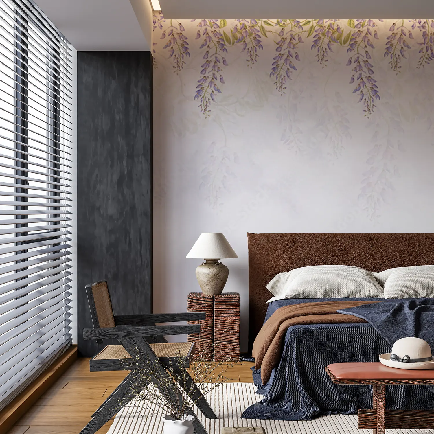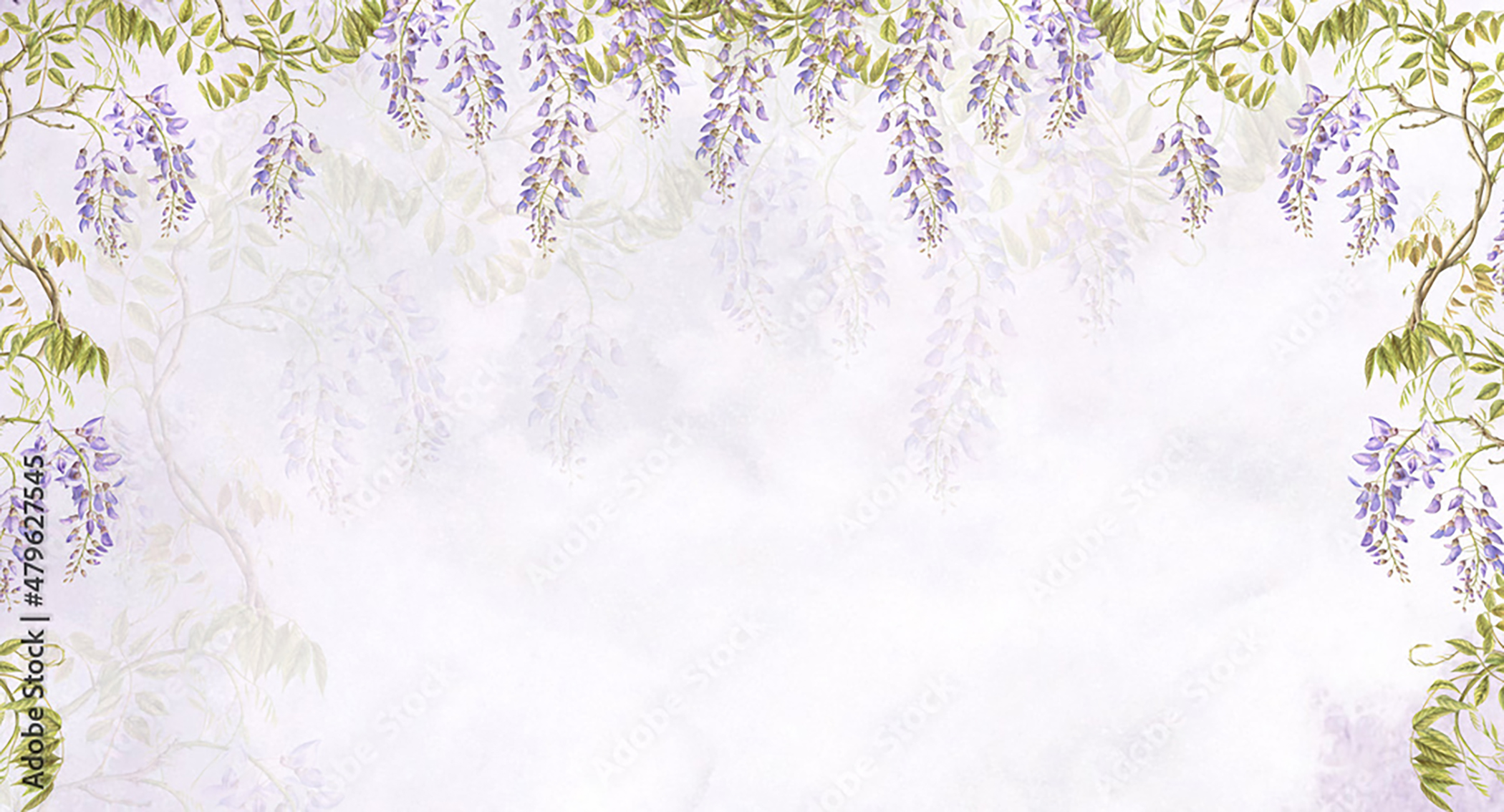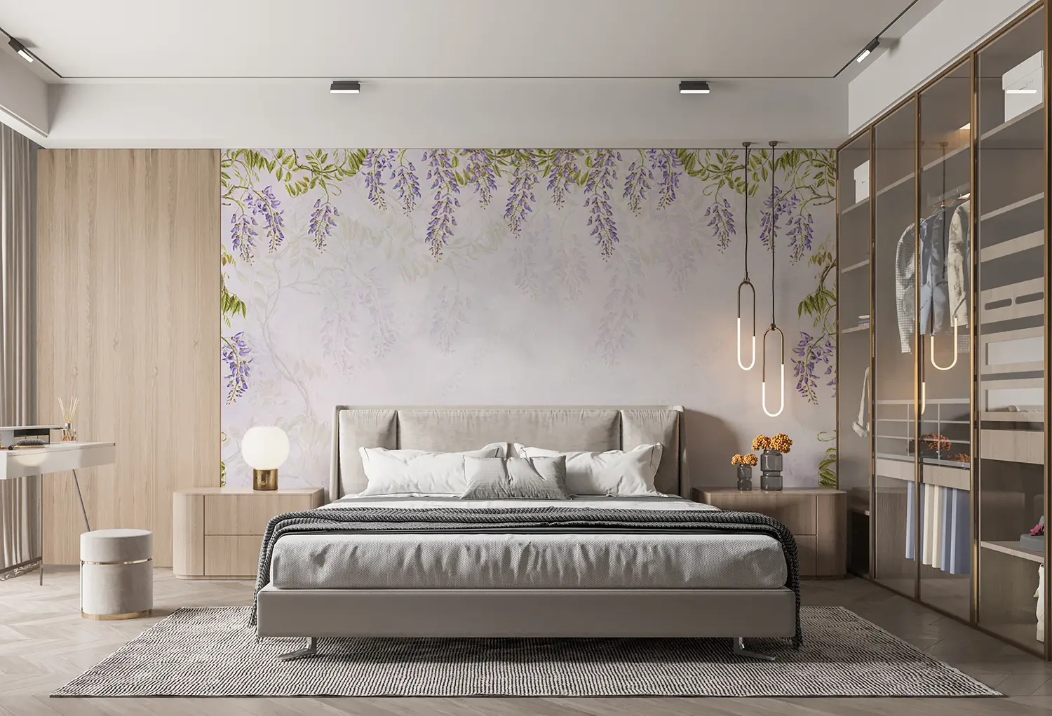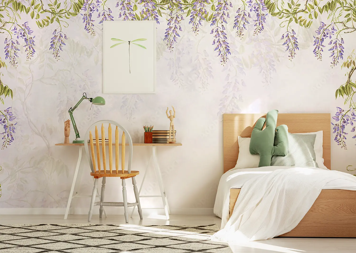 Transform your living space with this stunning white and purple floral background adorned with a border of delicate purple flowers. Elevate your home decor with this captivating piece that exudes elegance and charm. Complementary colors to consider are lavender, blue, and white, creating a harmonious and soothing atmosphere in any room. Add a touch of nature-inspired beauty to your walls.