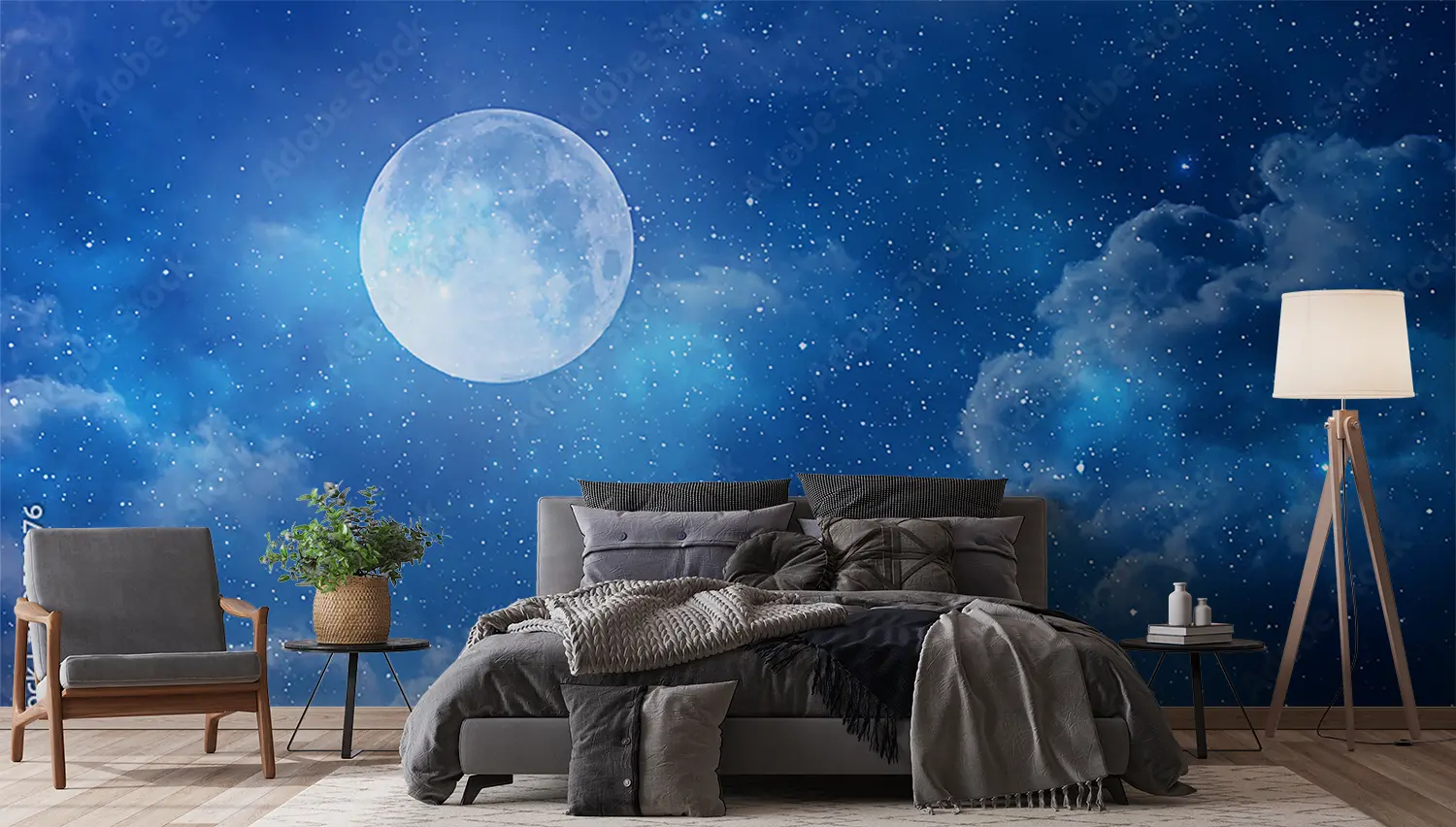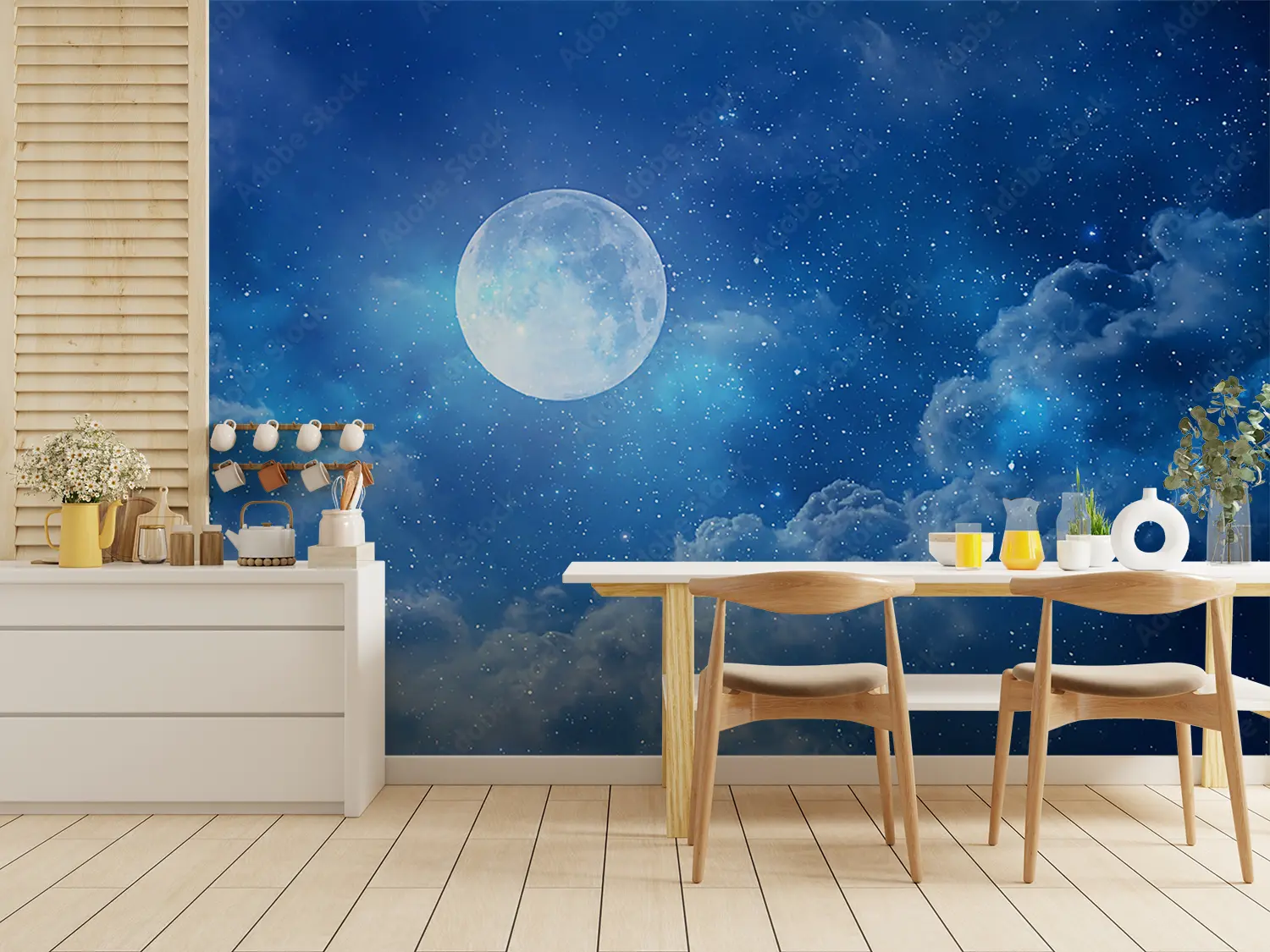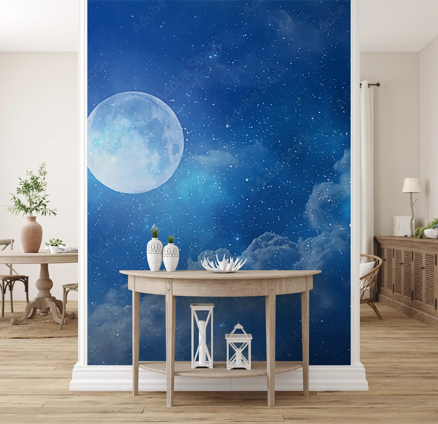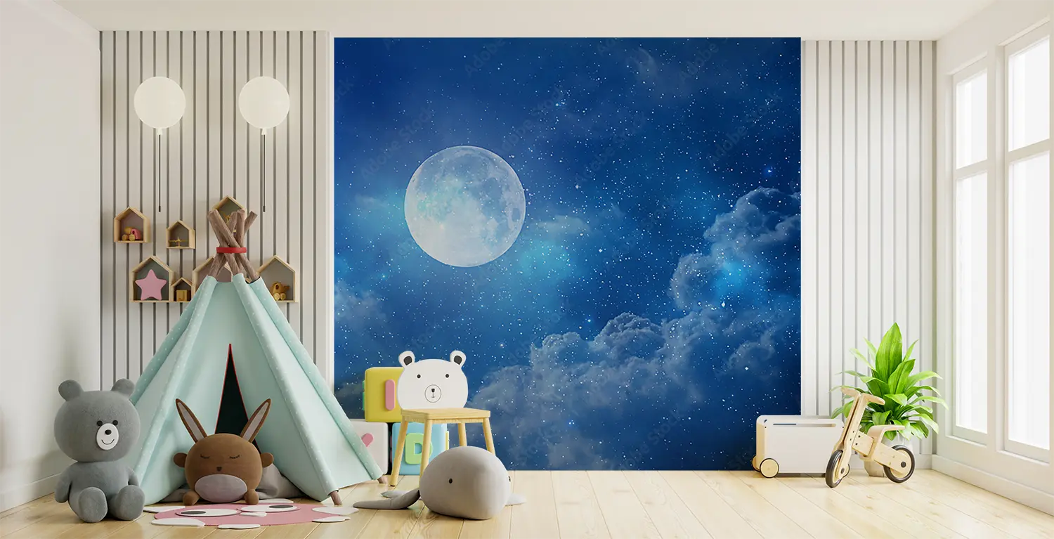 Transform your space with an enchanting full moon shining in a deep blue sky, surrounded by fluffy clouds and twinkling stars. This captivating wall art adds a touch of celestial beauty to any room, creating a serene and dreamy atmosphere. Pair it with accents of soft blues, whites, and silver for a harmonious and tranquil home decor aesthetic.