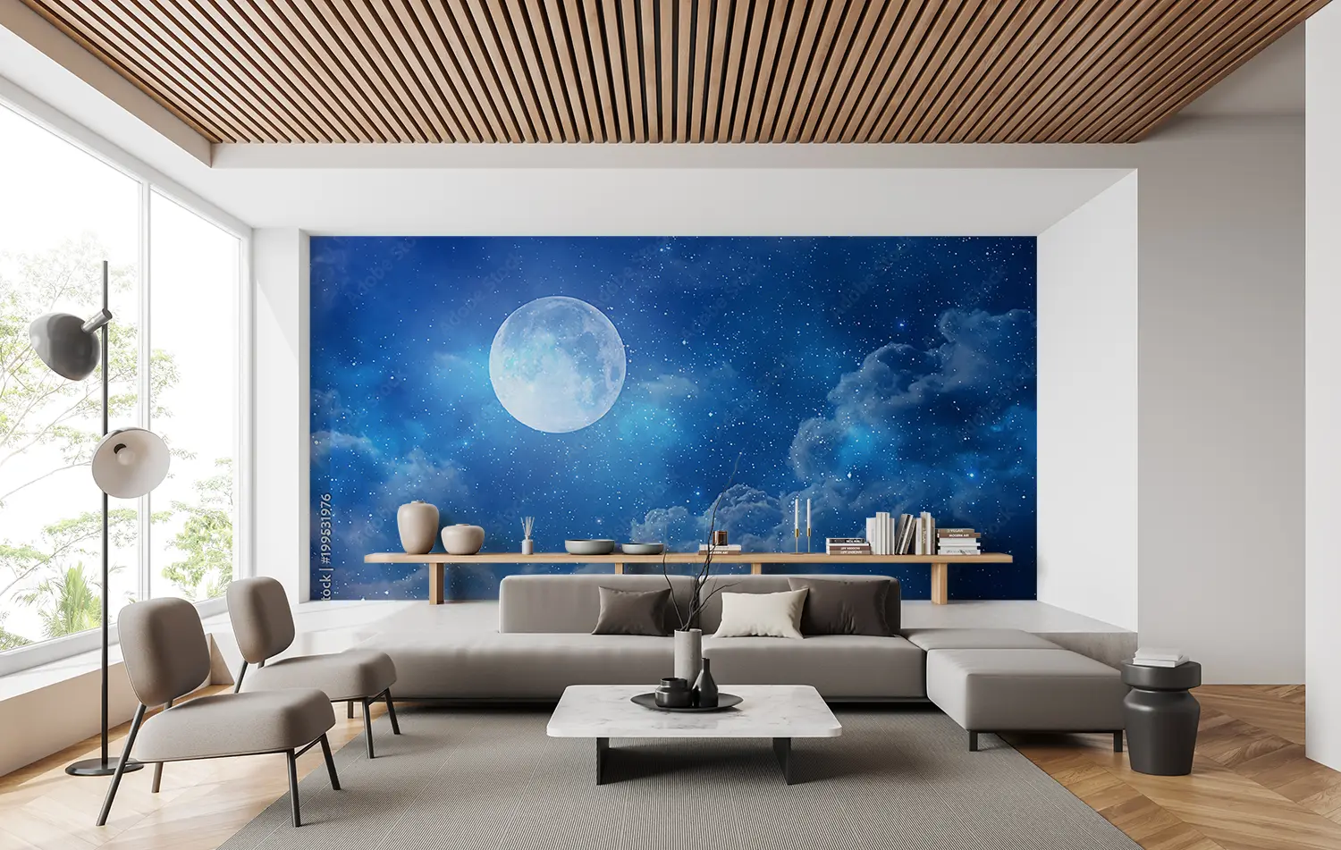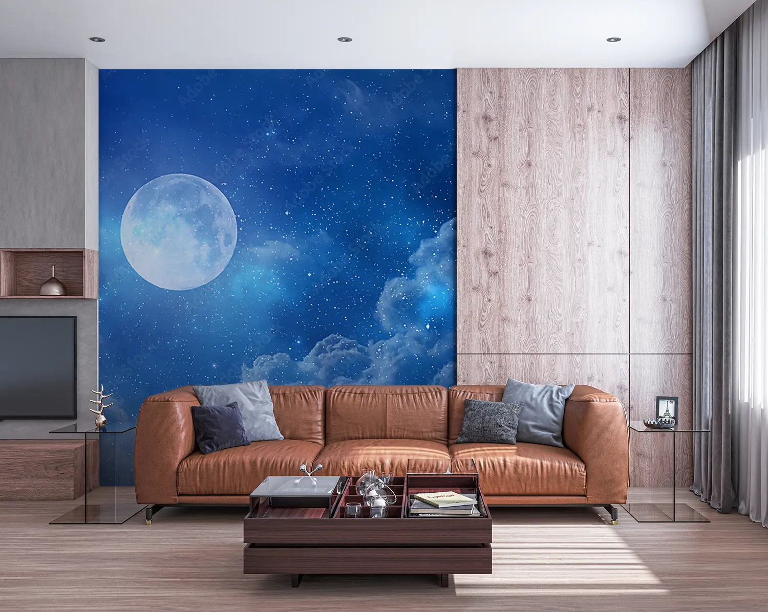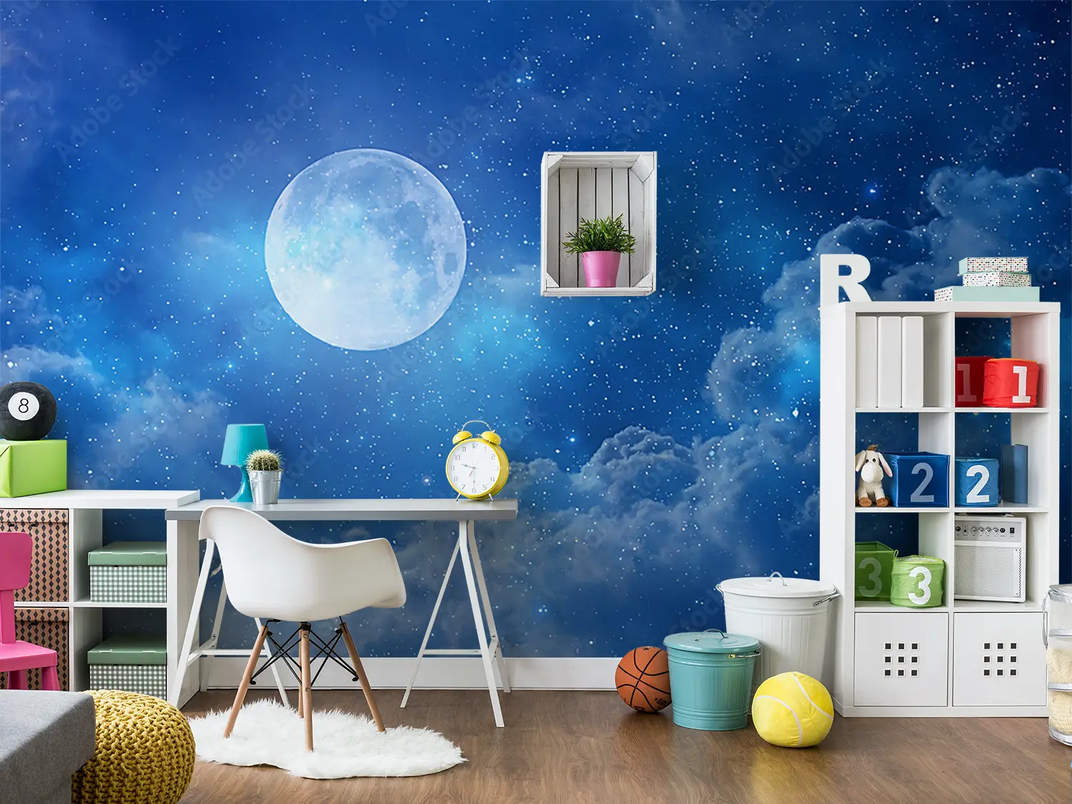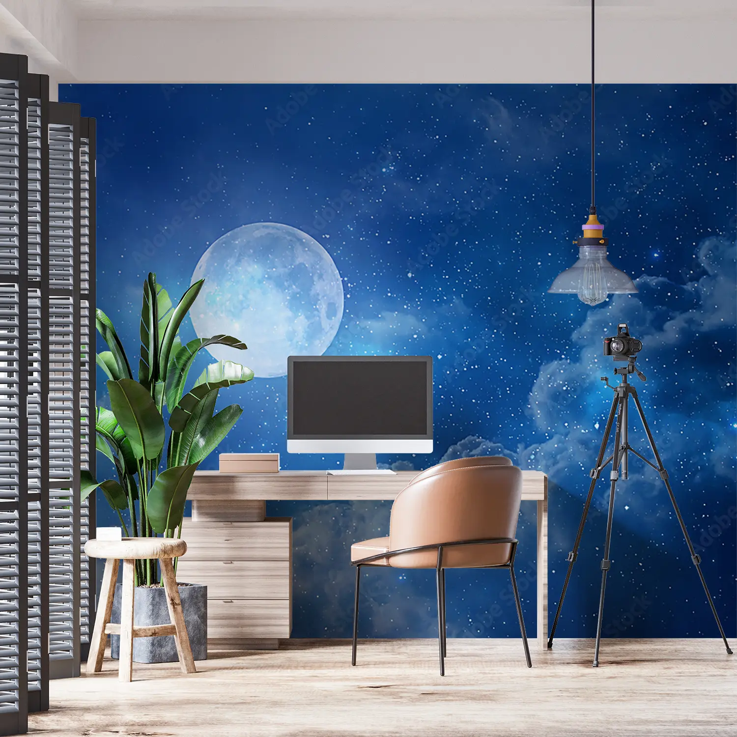 Transform your space with an enchanting full moon shining in a deep blue sky, surrounded by fluffy clouds and twinkling stars. This captivating wall art adds a touch of celestial beauty to any room, creating a serene and dreamy atmosphere. Pair it with accents of soft blues, whites, and silver for a harmonious and tranquil home decor aesthetic.