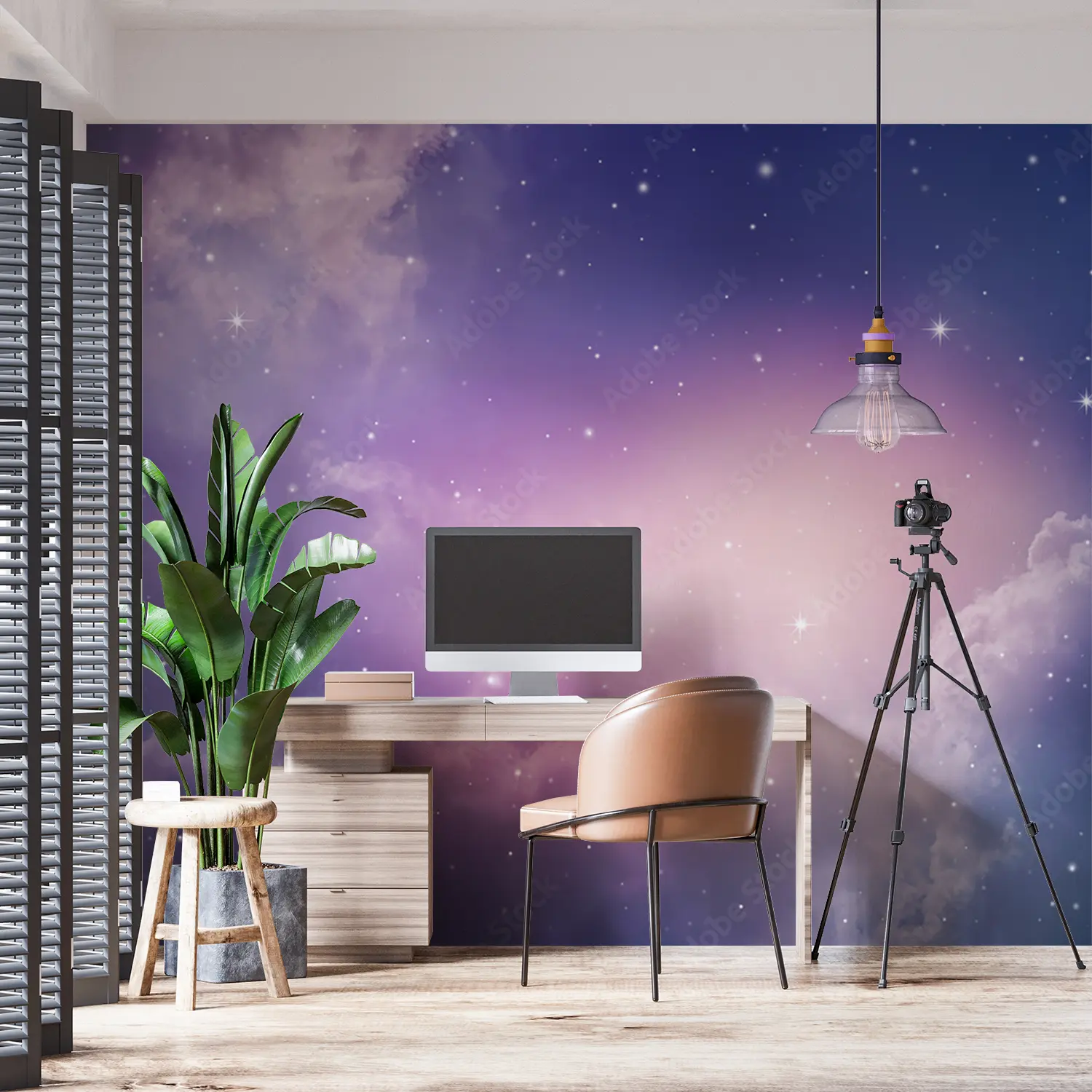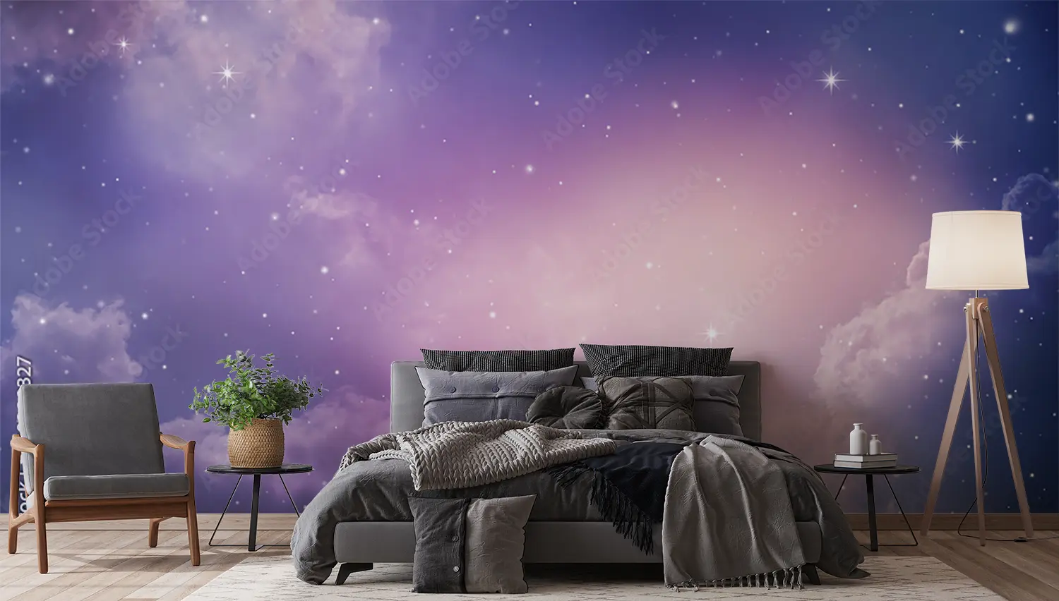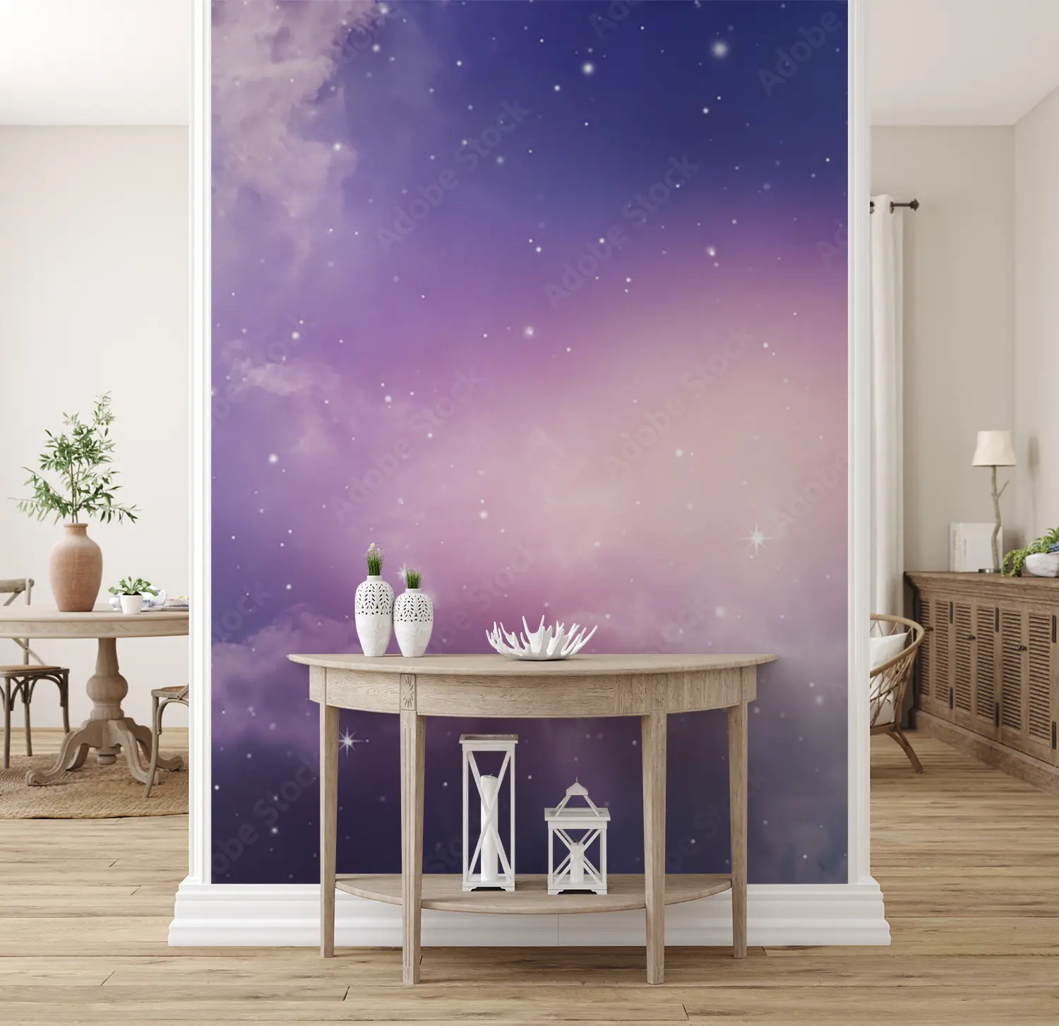 Transform your space with this captivating wall art featuring a dreamy purple and blue sky adorned with stars and clouds. Enhance your home decor with its serene and magical aesthetic appeal, perfect for creating a calming atmosphere in any room. Complementary colors include shades of pink, white, and silver to accentuate the celestial beauty of this piece.