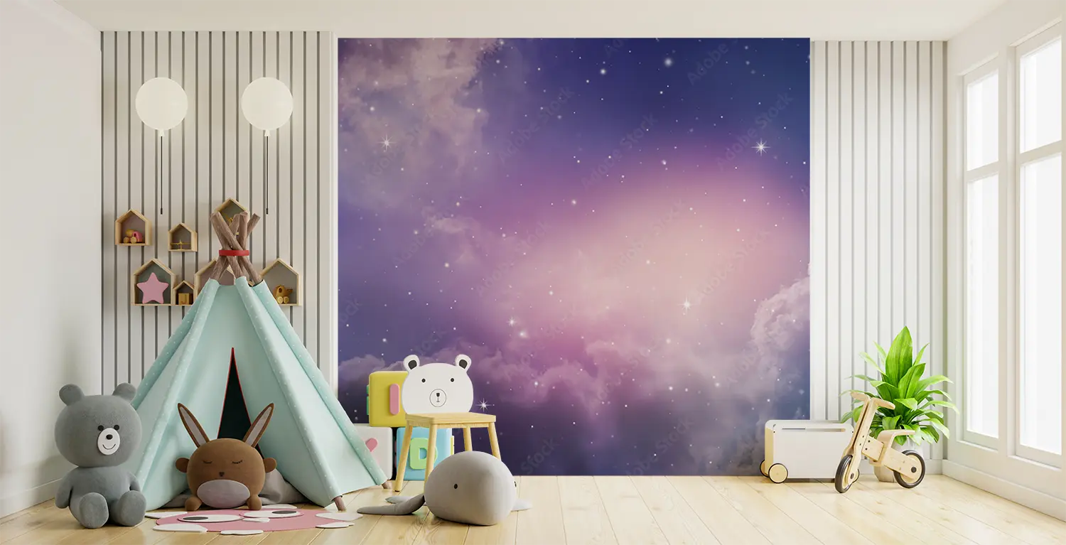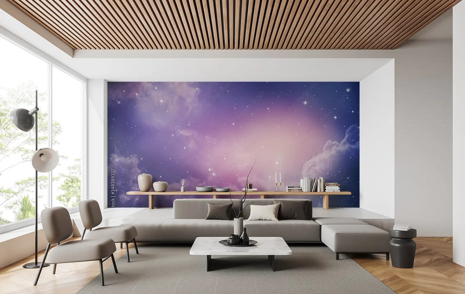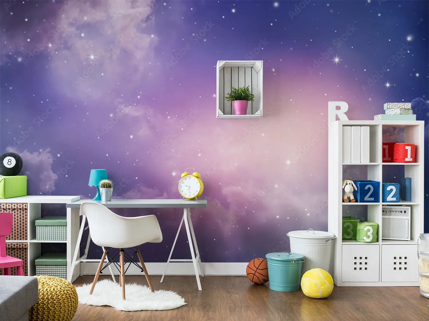 Transform your space with this captivating wall art featuring a dreamy purple and blue sky adorned with stars and clouds. Enhance your home decor with its serene and magical aesthetic appeal, perfect for creating a calming atmosphere in any room. Complementary colors include shades of pink, white, and silver to accentuate the celestial beauty of this piece.