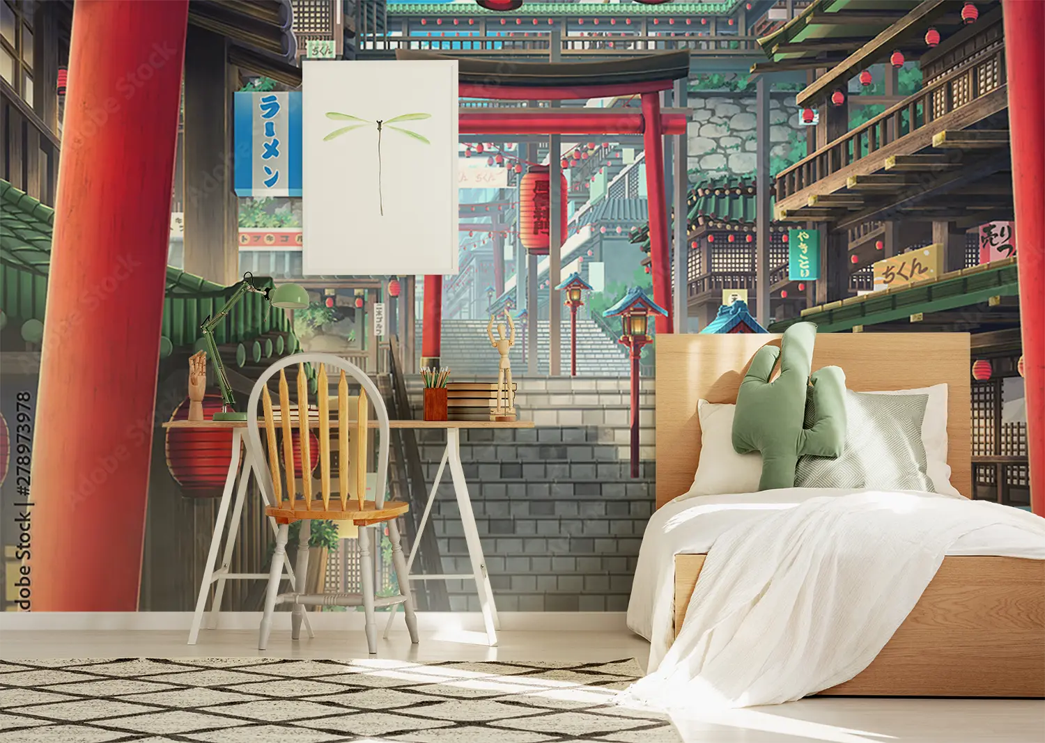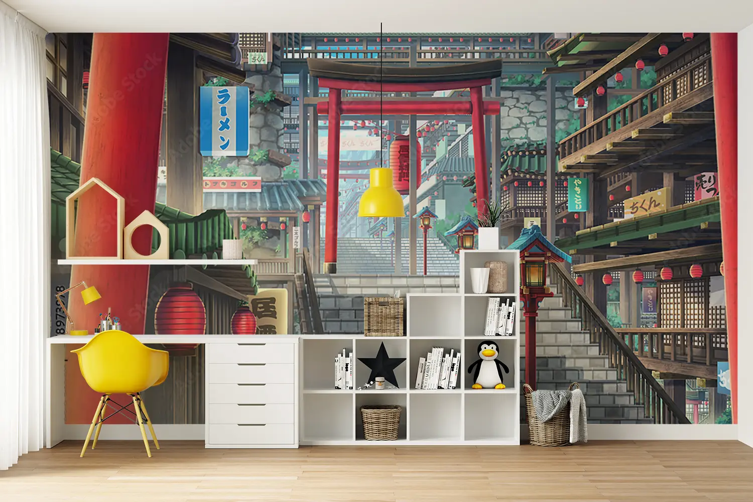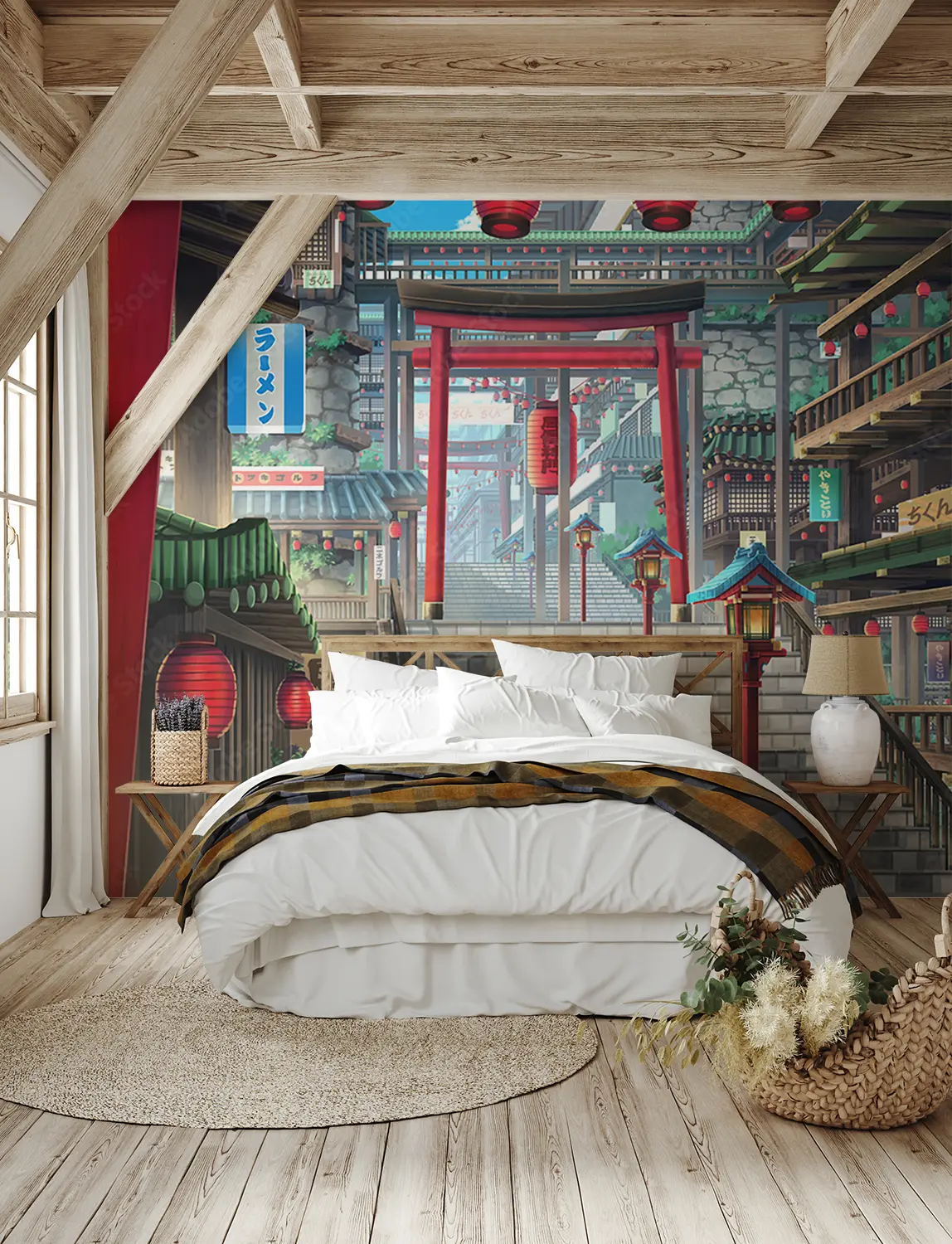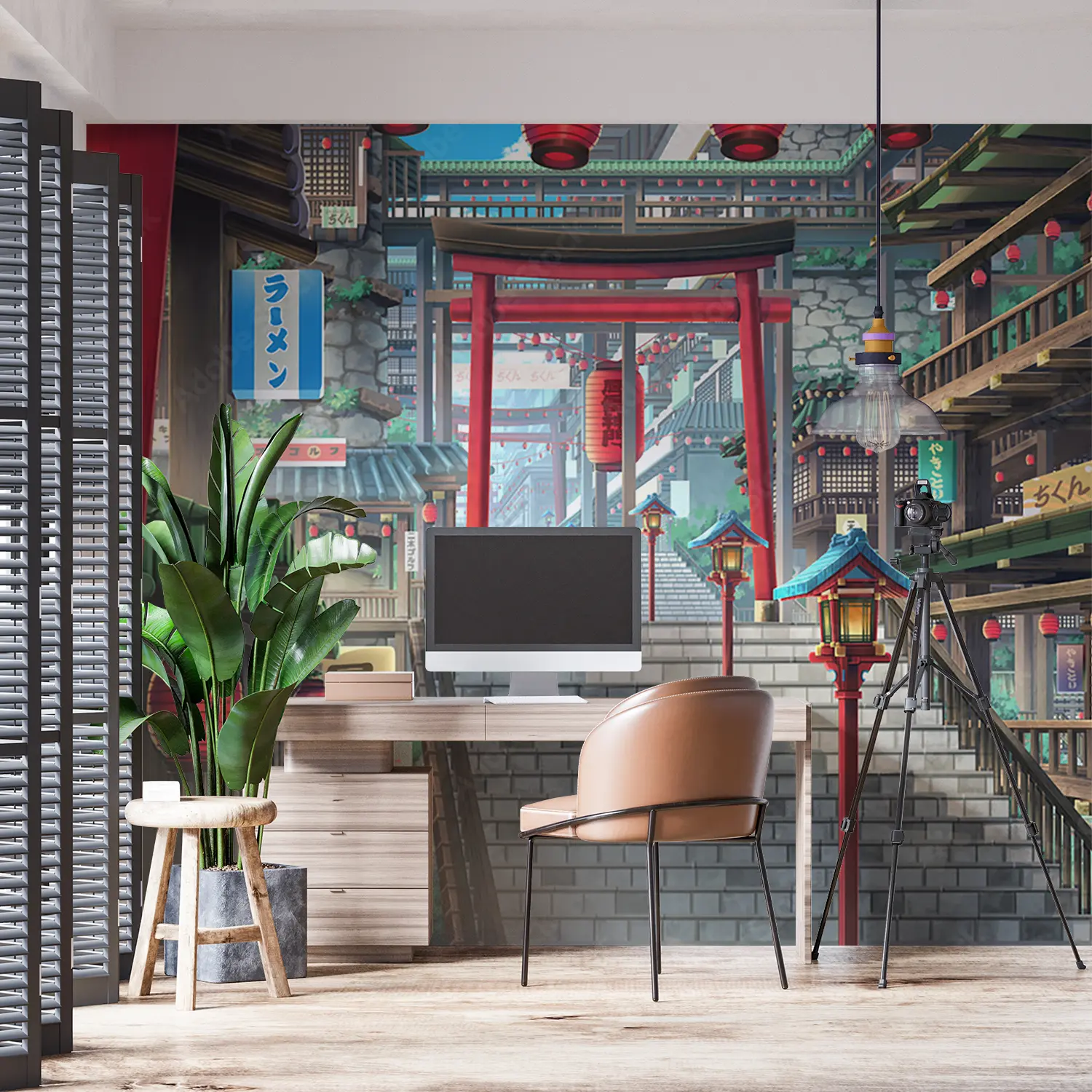 Transform your space with this captivating image of a stairway leading to a building adorned with red lanterns. The vibrant colors and cultural elements make it a unique addition to any home decor. Complementary colors to consider are blue, white, and gold to enhance the aesthetic appeal of your living space. Add a touch of elegance with this stunning wall art.