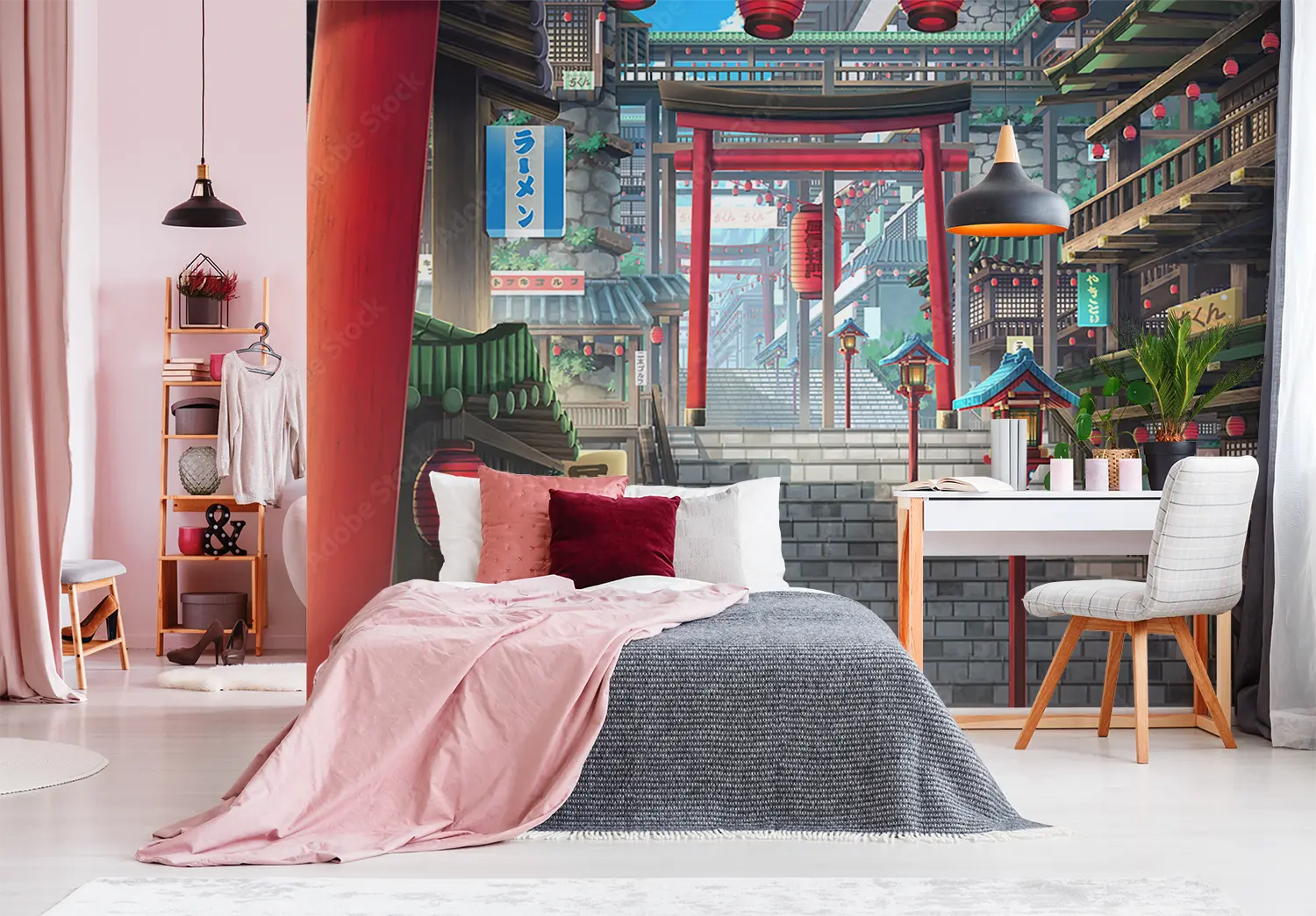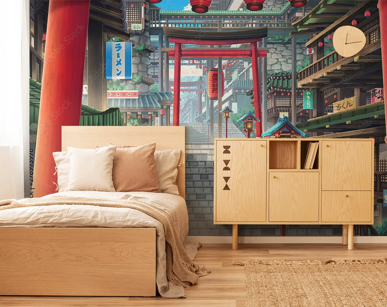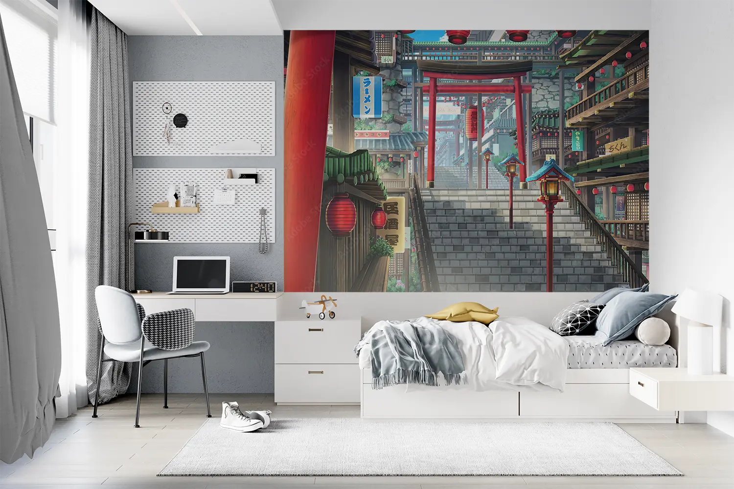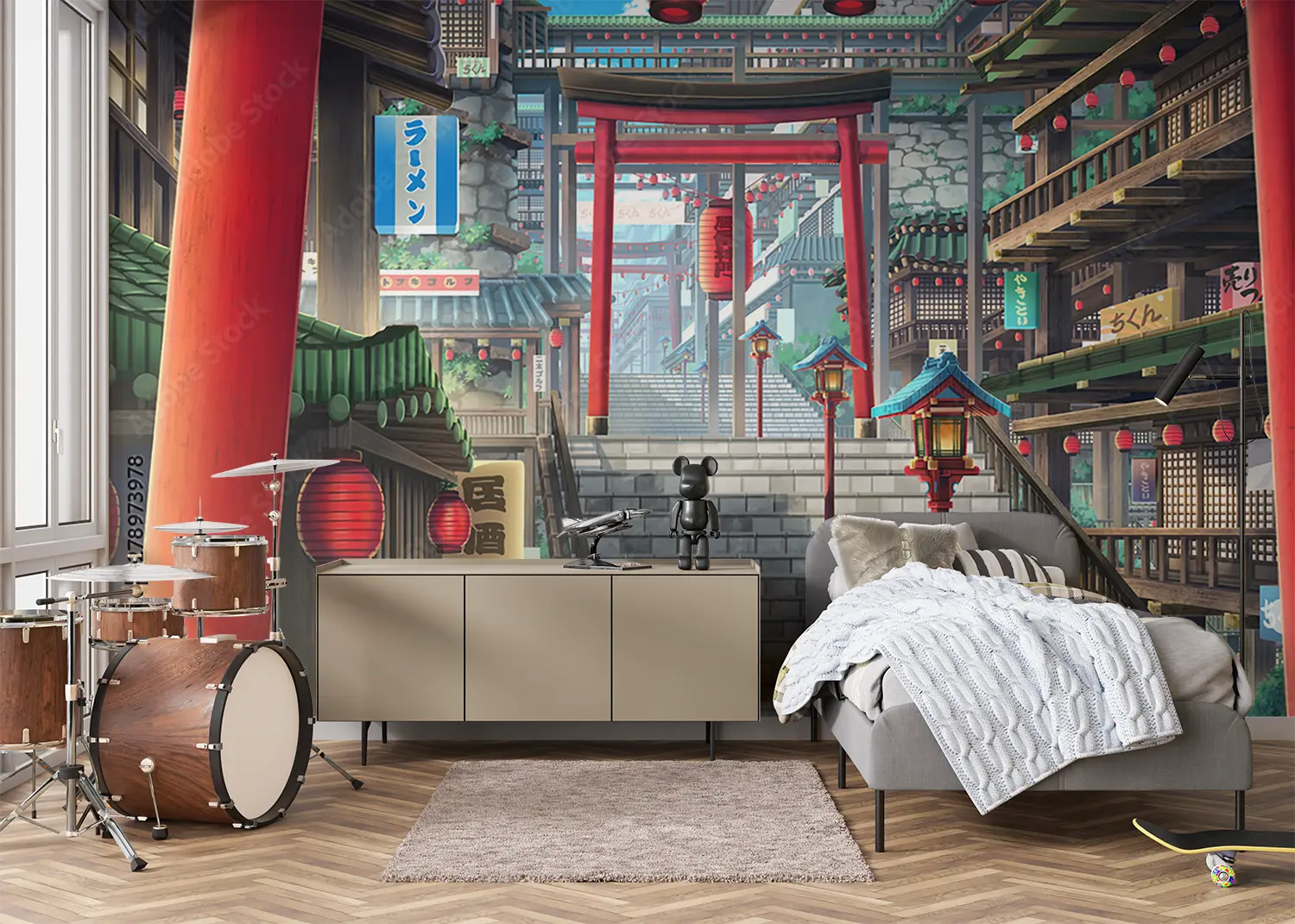 Transform your space with this captivating image of a stairway leading to a building adorned with red lanterns. The vibrant colors and cultural elements make it a unique addition to any home decor. Complementary colors to consider are blue, white, and gold to enhance the aesthetic appeal of your living space. Add a touch of elegance with this stunning wall art.