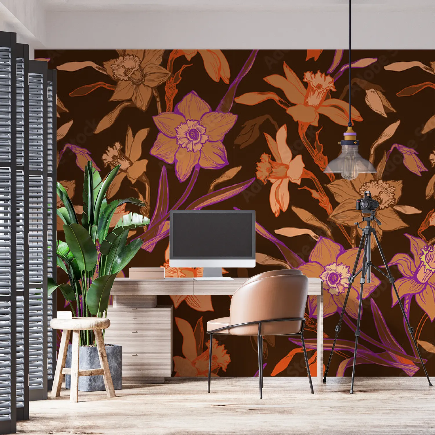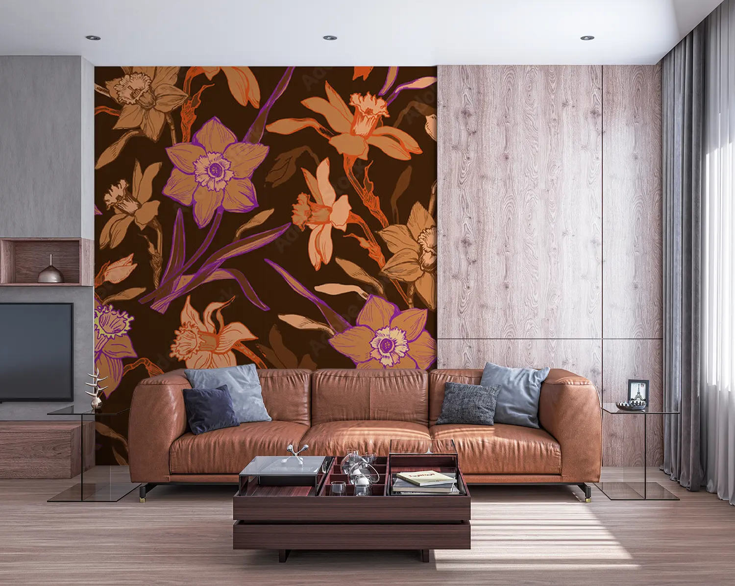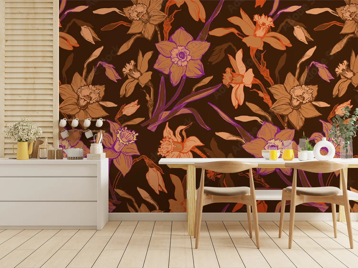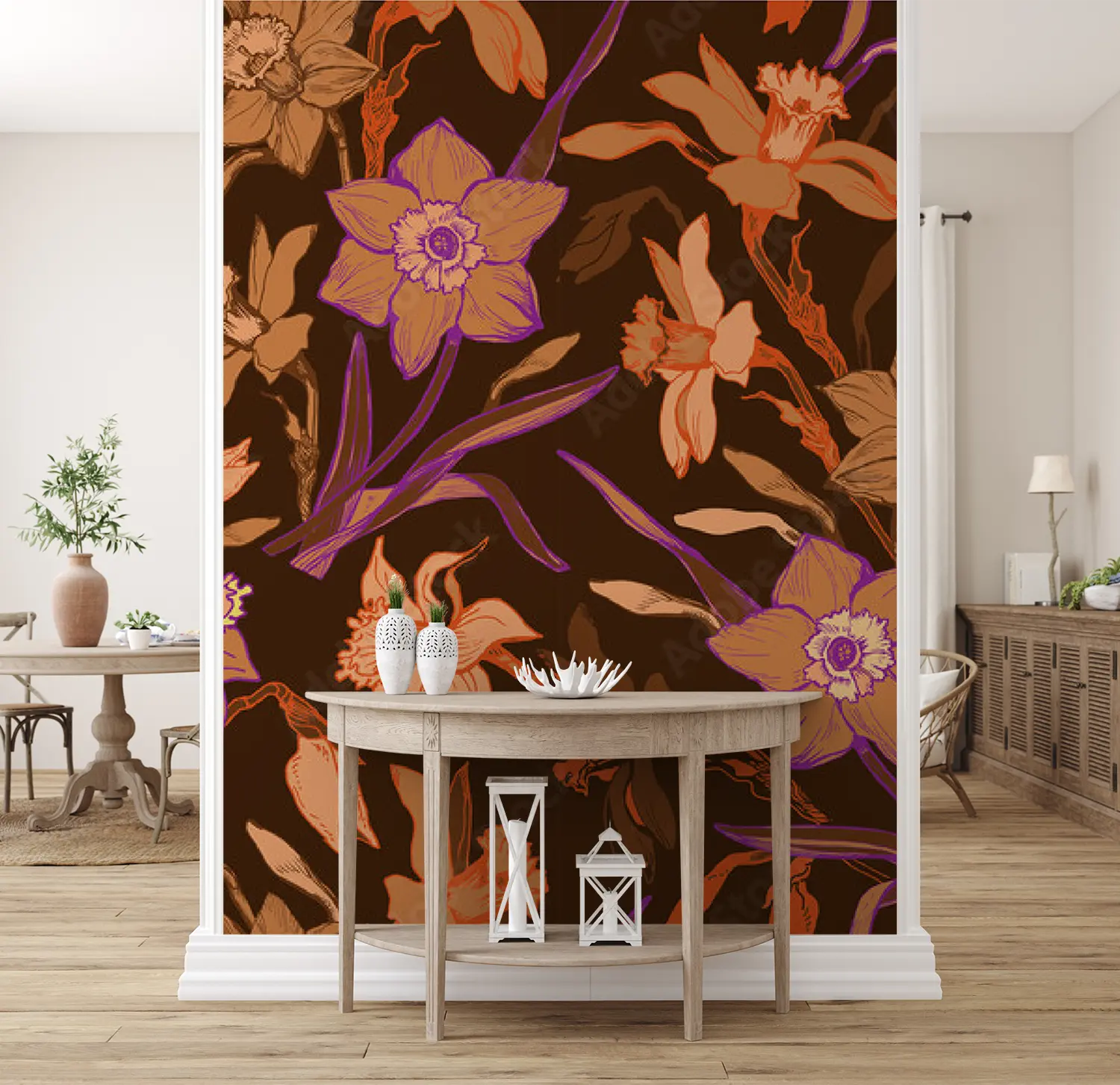 Enhance your home decor with this stunning wall art featuring a beautiful pattern of flowers in brown and orange hues. The intricate design adds a touch of nature's beauty to any room, creating a warm and inviting atmosphere. Complementary colors like yellow, purple, and daffodil can be incorporated to further enrich the visual appeal of your space.