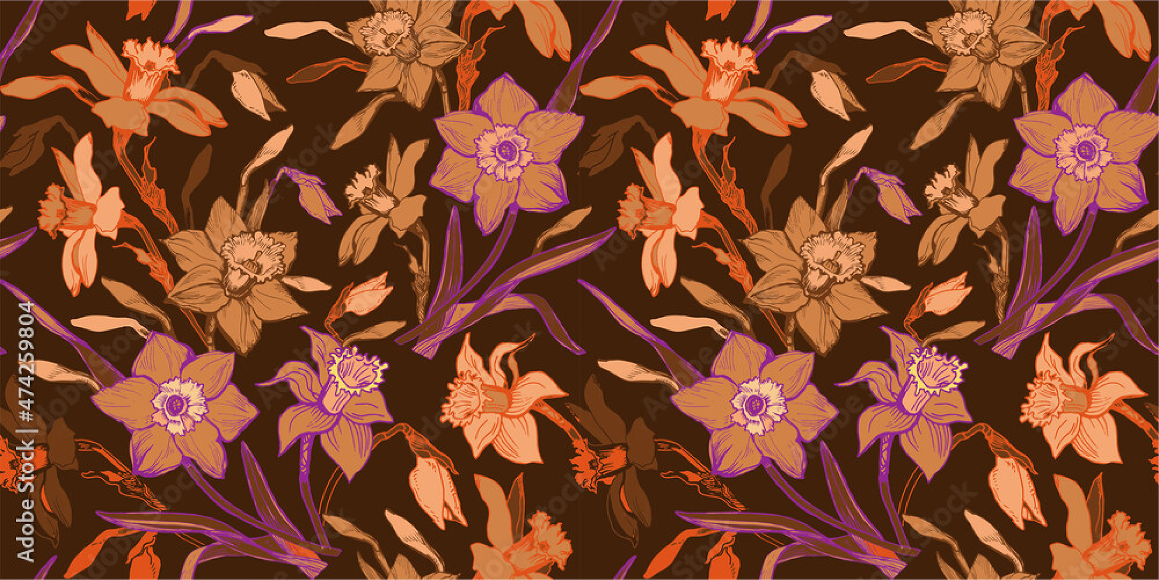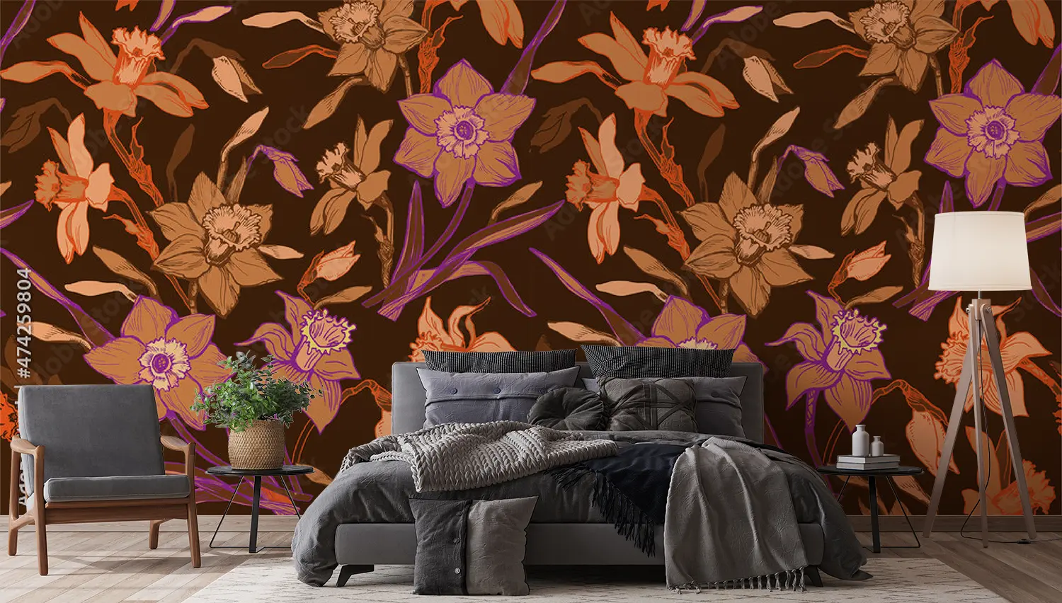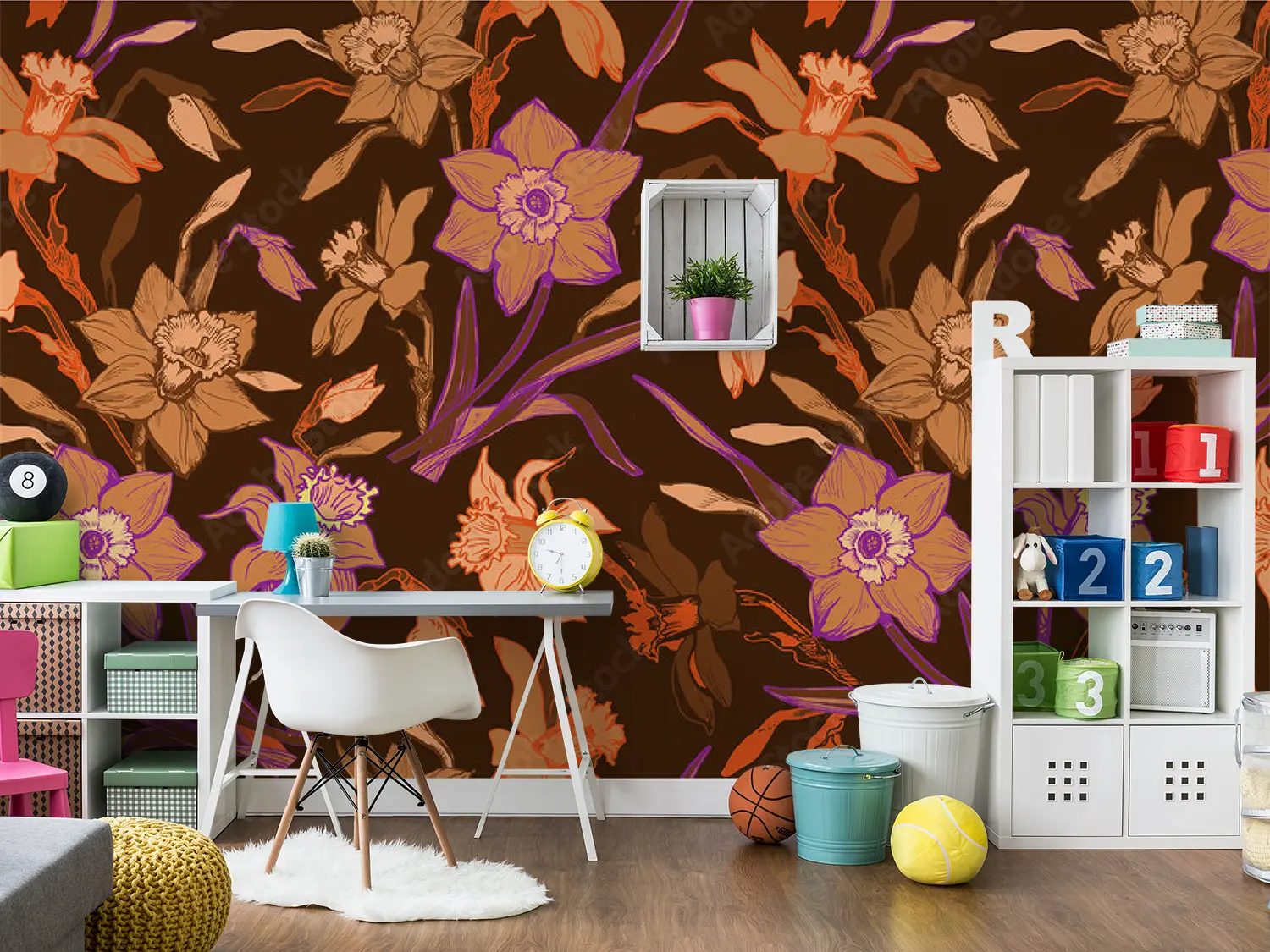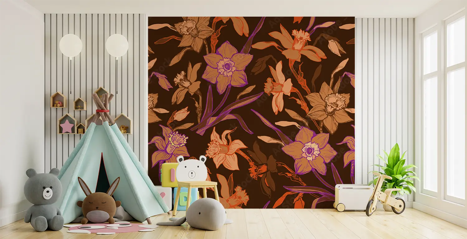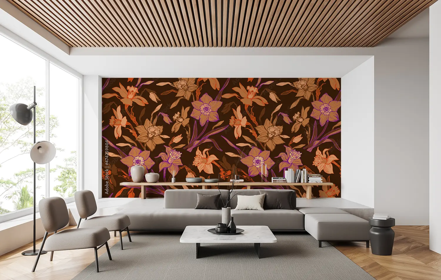 Enhance your home decor with this stunning wall art featuring a beautiful pattern of flowers in brown and orange hues. The intricate design adds a touch of nature's beauty to any room, creating a warm and inviting atmosphere. Complementary colors like yellow, purple, and daffodil can be incorporated to further enrich the visual appeal of your space.