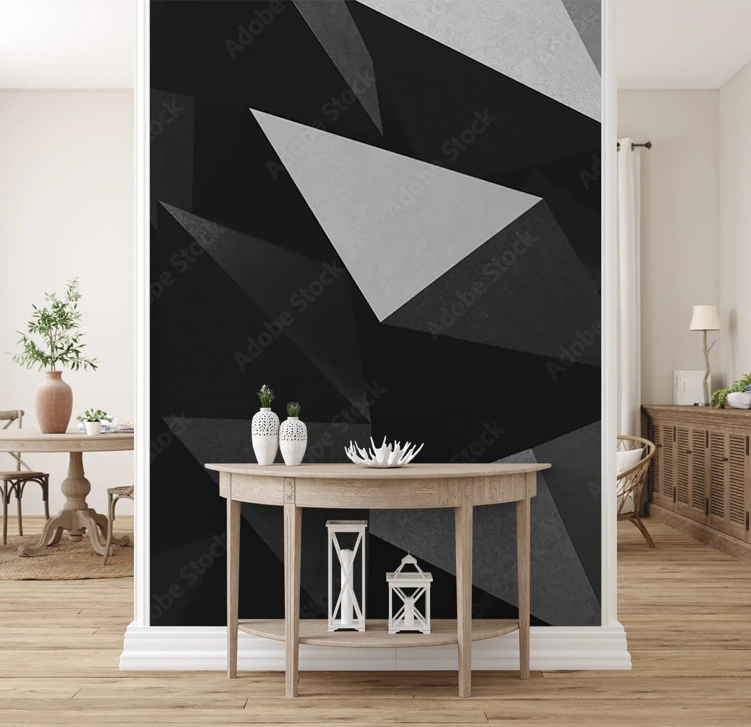 Elevate your living space with this captivating black and white geometric triangle artwork. The intricate design adds a touch of contemporary elegance to any room, creating a visually striking focal point. Complementary colors like shades of grey, white, and charcoal can enhance the aesthetic appeal and seamlessly blend with existing decor schemes.
