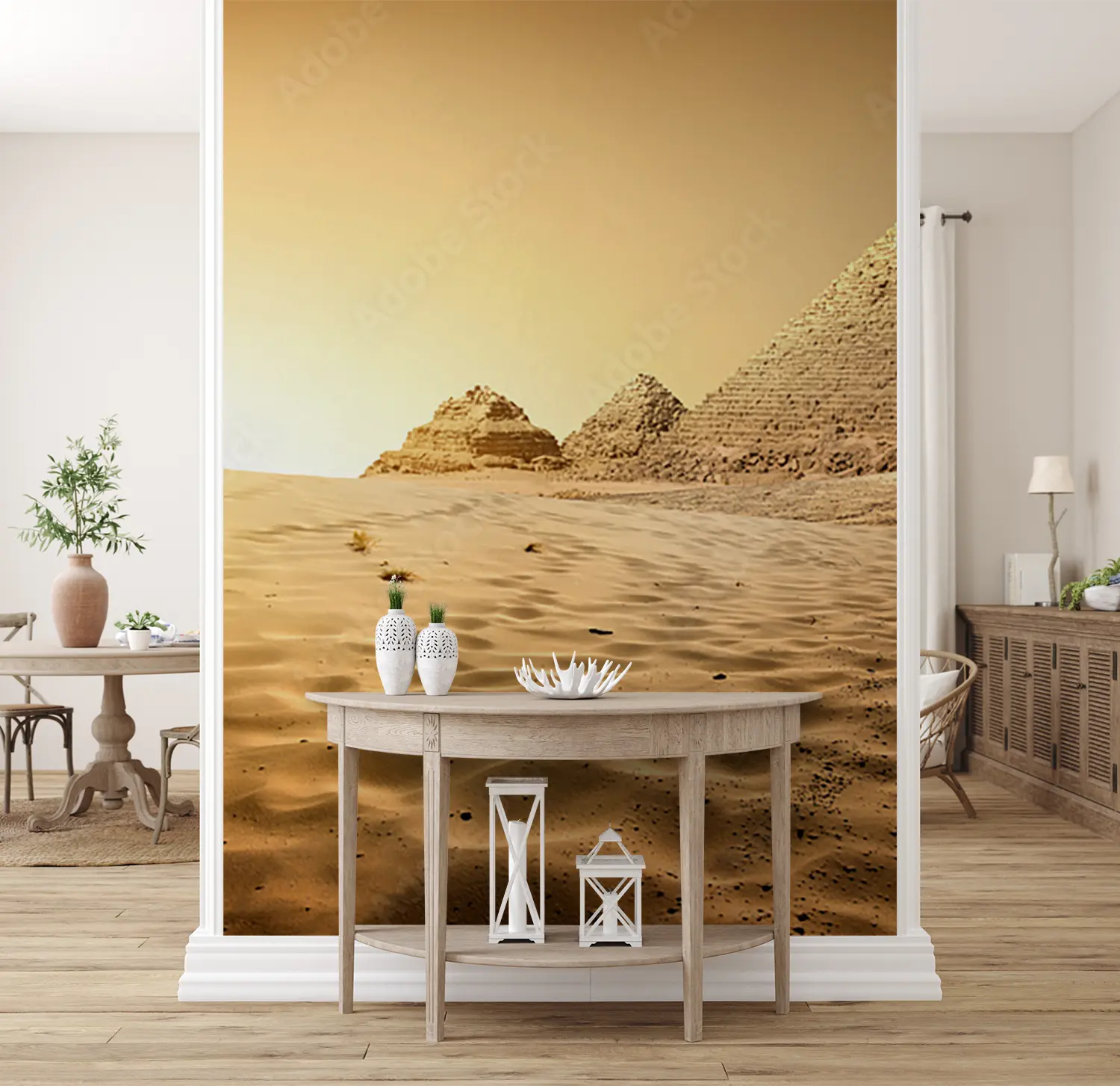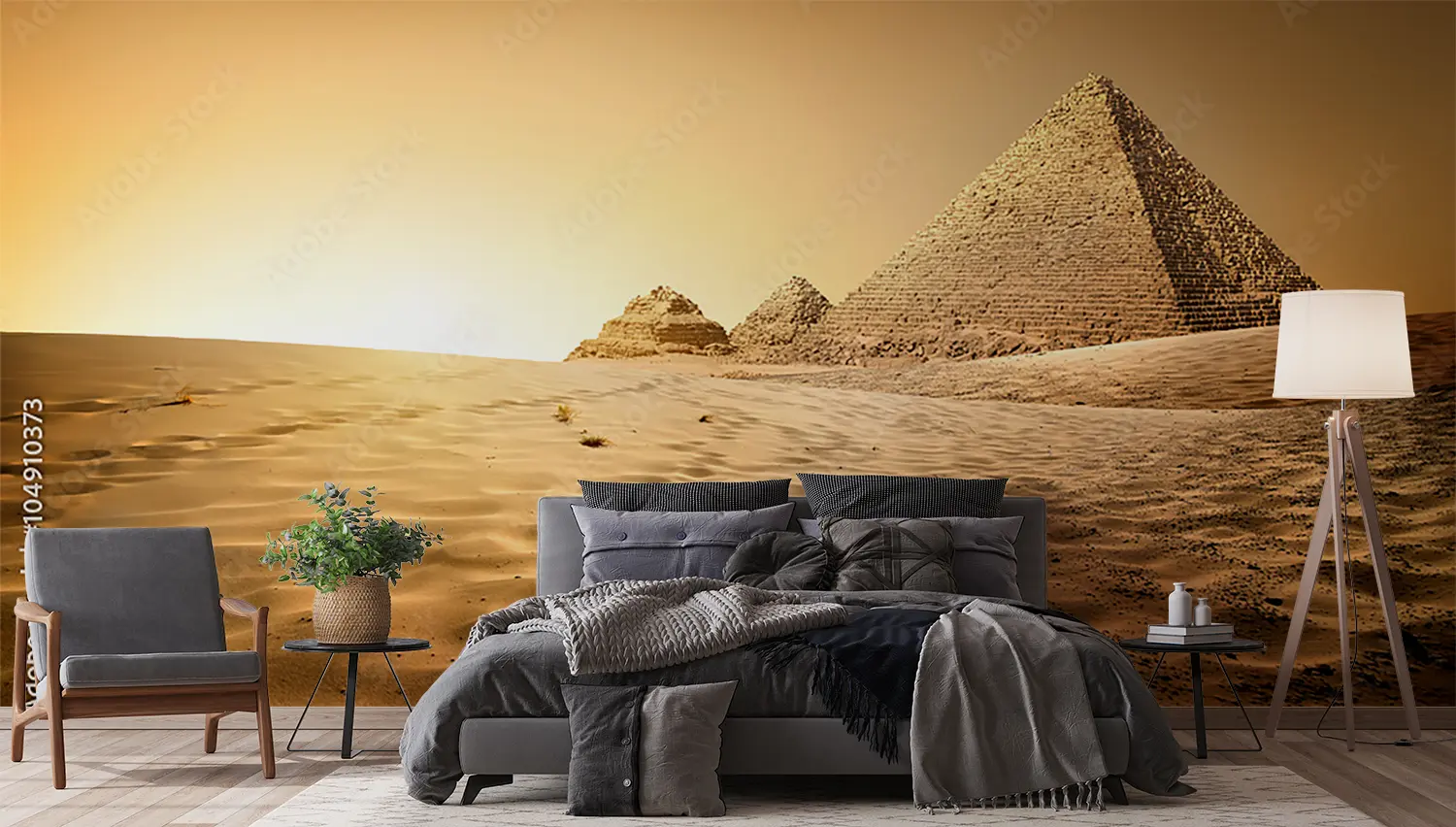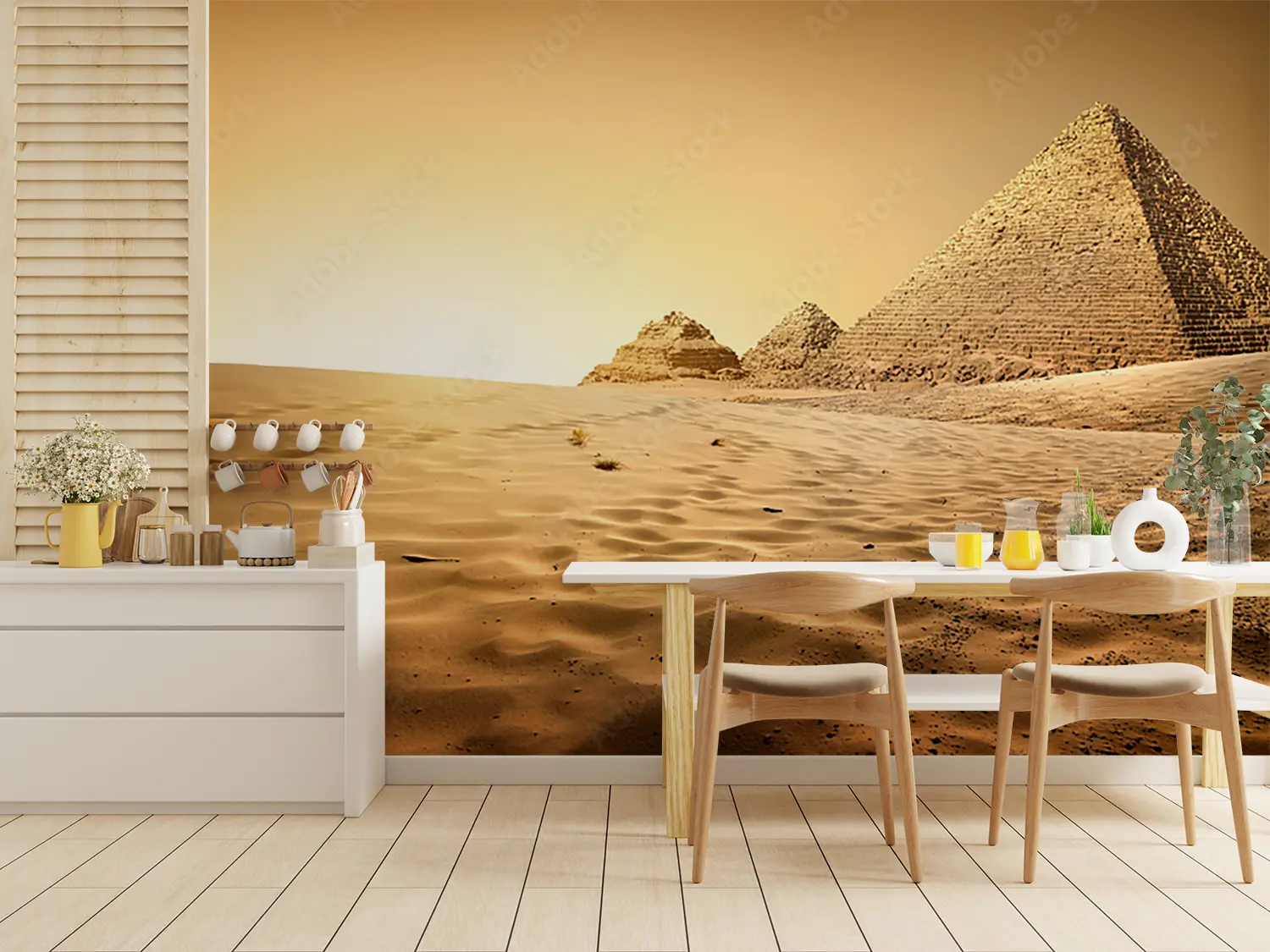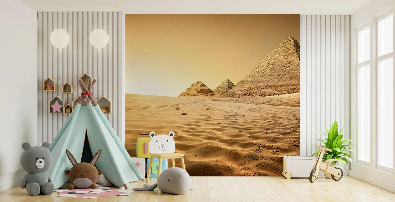 "Desert Sunset: Stunning Home Decor Scene" Transform your space with a captivating desert sunset wall art. This picturesque mural features a group of pyramids in the desert at sunset, creating a warm and inviting atmosphere. Complementary colors like sandy beige, golden yellow, and earthy brown will enhance the aesthetic appeal of your home decor, bringing a touch of natural beauty indoors.