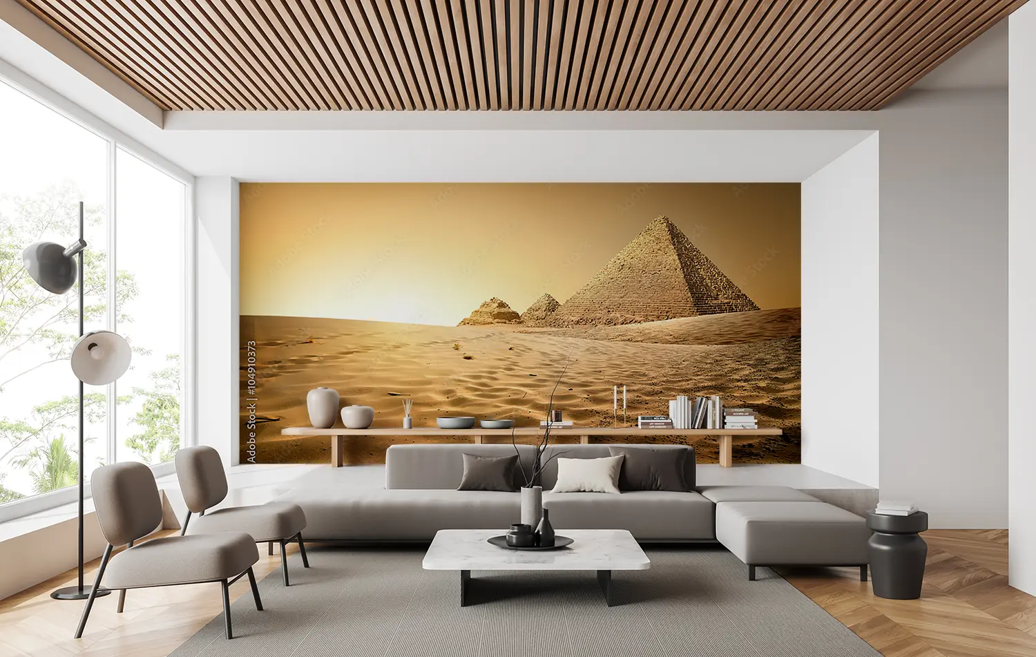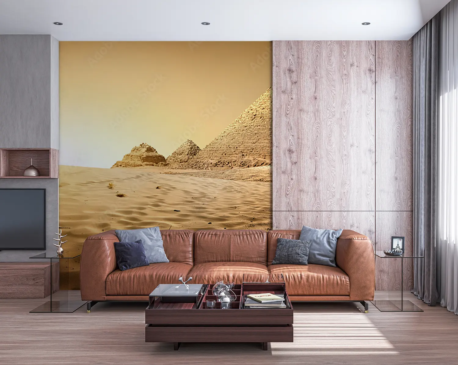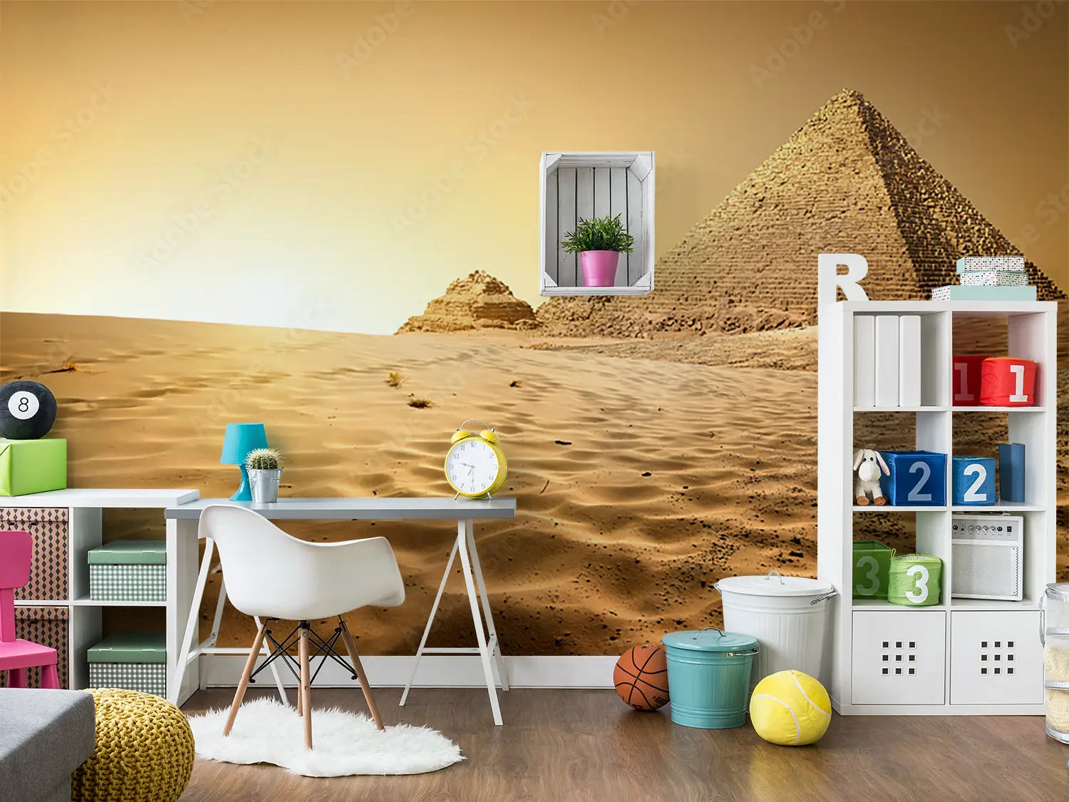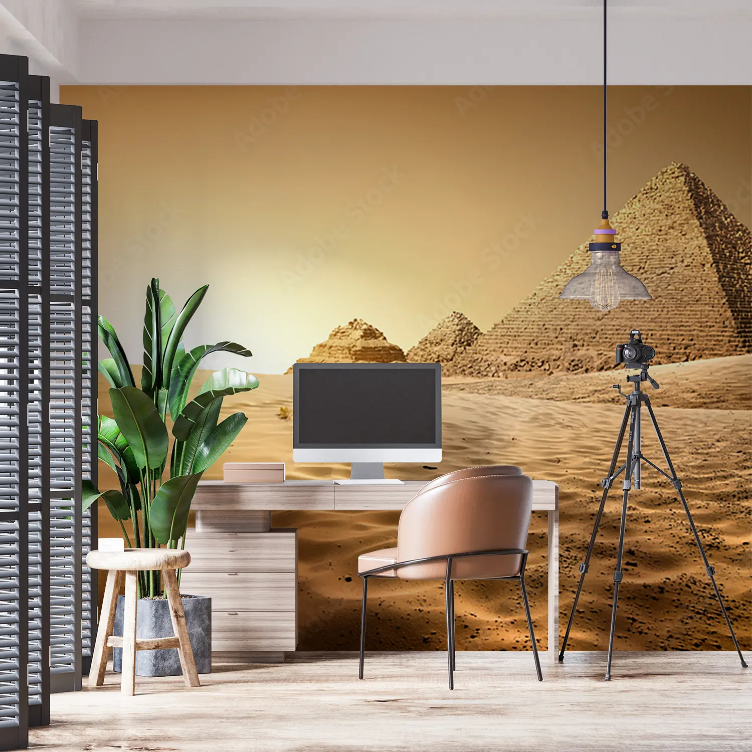 "Desert Sunset: Stunning Home Decor Scene" Transform your space with a captivating desert sunset wall art. This picturesque mural features a group of pyramids in the desert at sunset, creating a warm and inviting atmosphere. Complementary colors like sandy beige, golden yellow, and earthy brown will enhance the aesthetic appeal of your home decor, bringing a touch of natural beauty indoors.