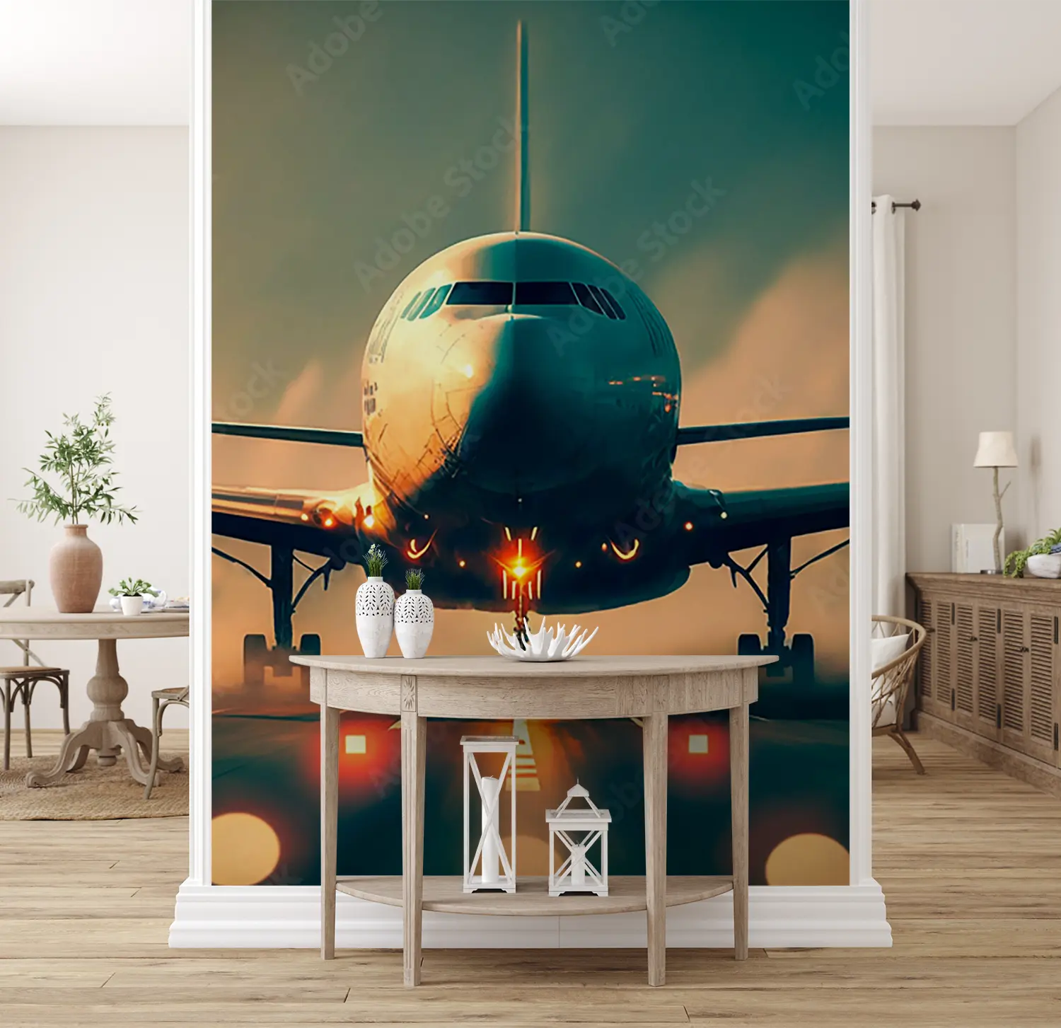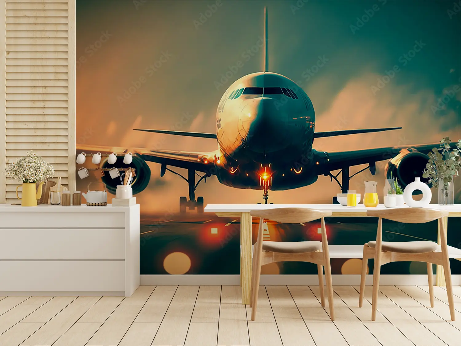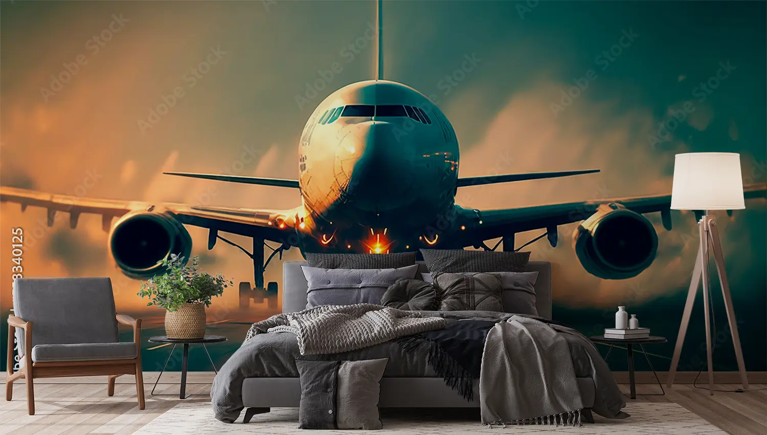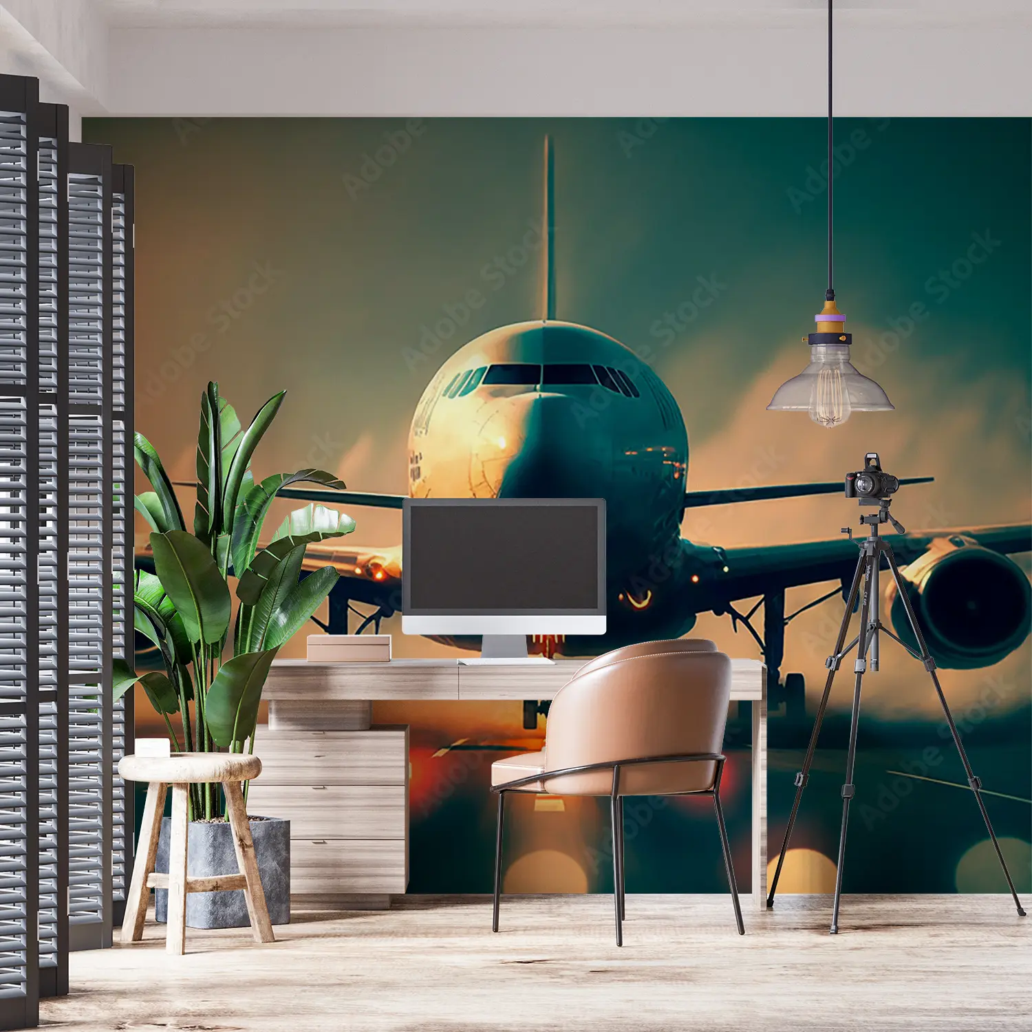 Adorn your space with the captivating image of a large jetliner elegantly taking off from an airport runway. This stunning wall art piece adds a modern and dynamic touch to any room, perfect for aviation enthusiasts or those who appreciate the beauty of travel. Complementary colors to consider are shades of blue, grey, and white for a sleek and sophisticated look.