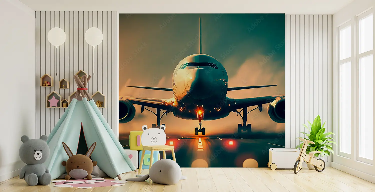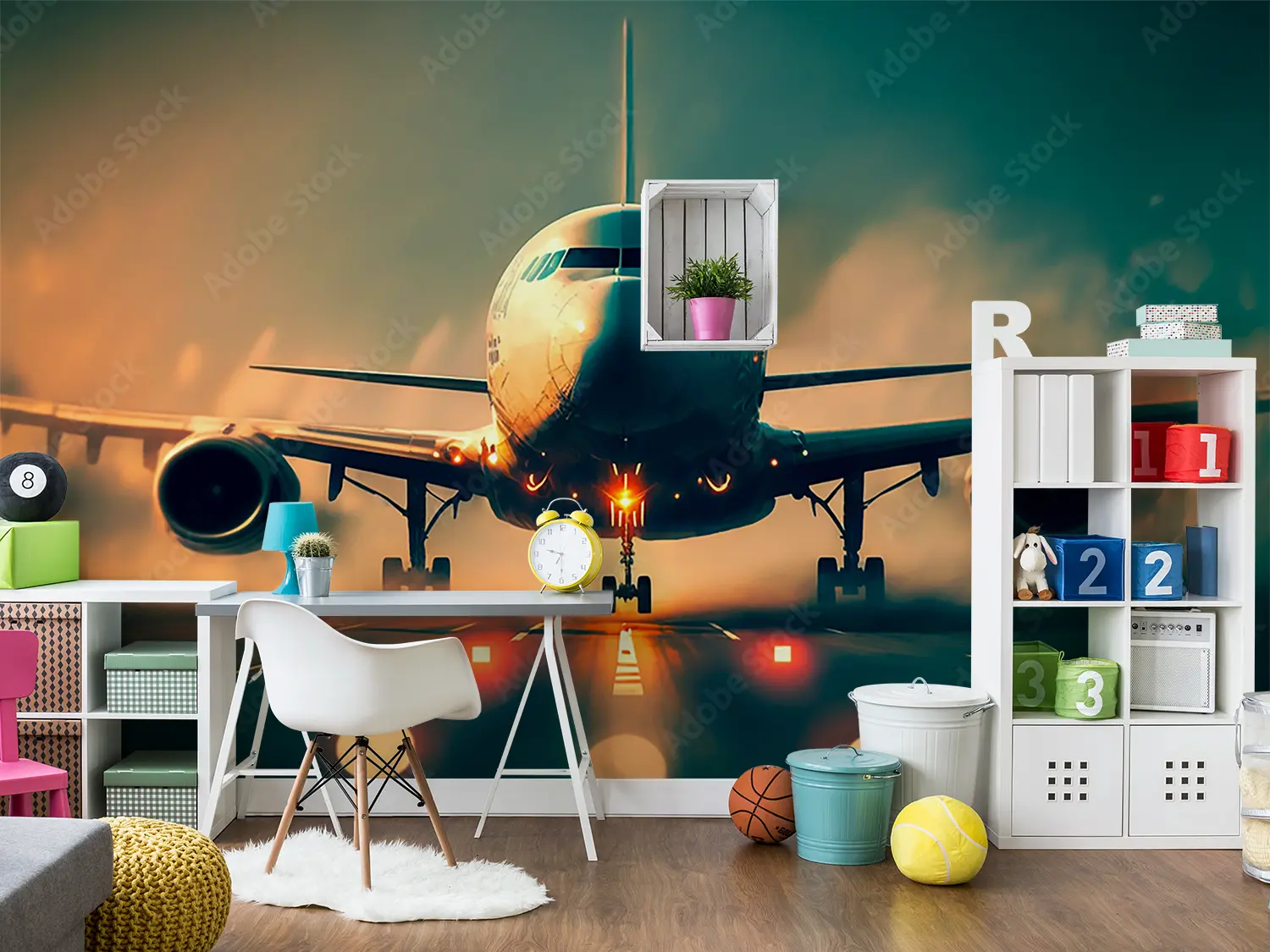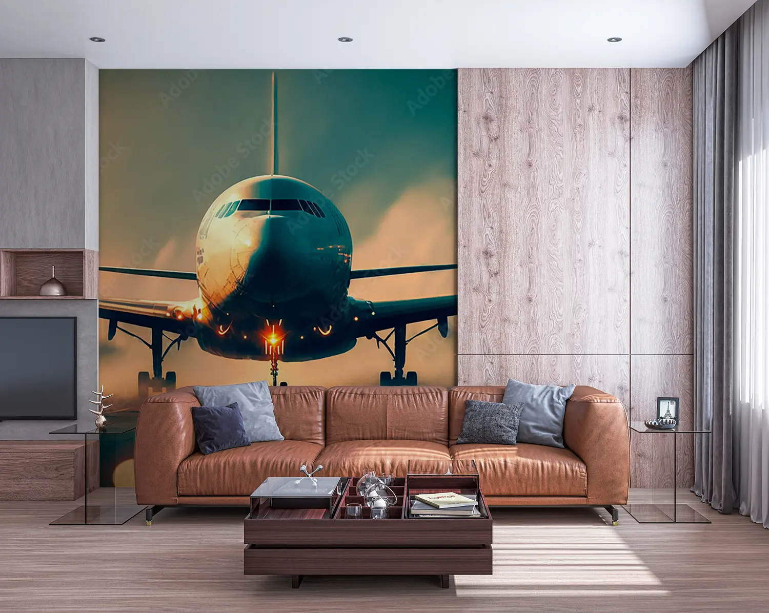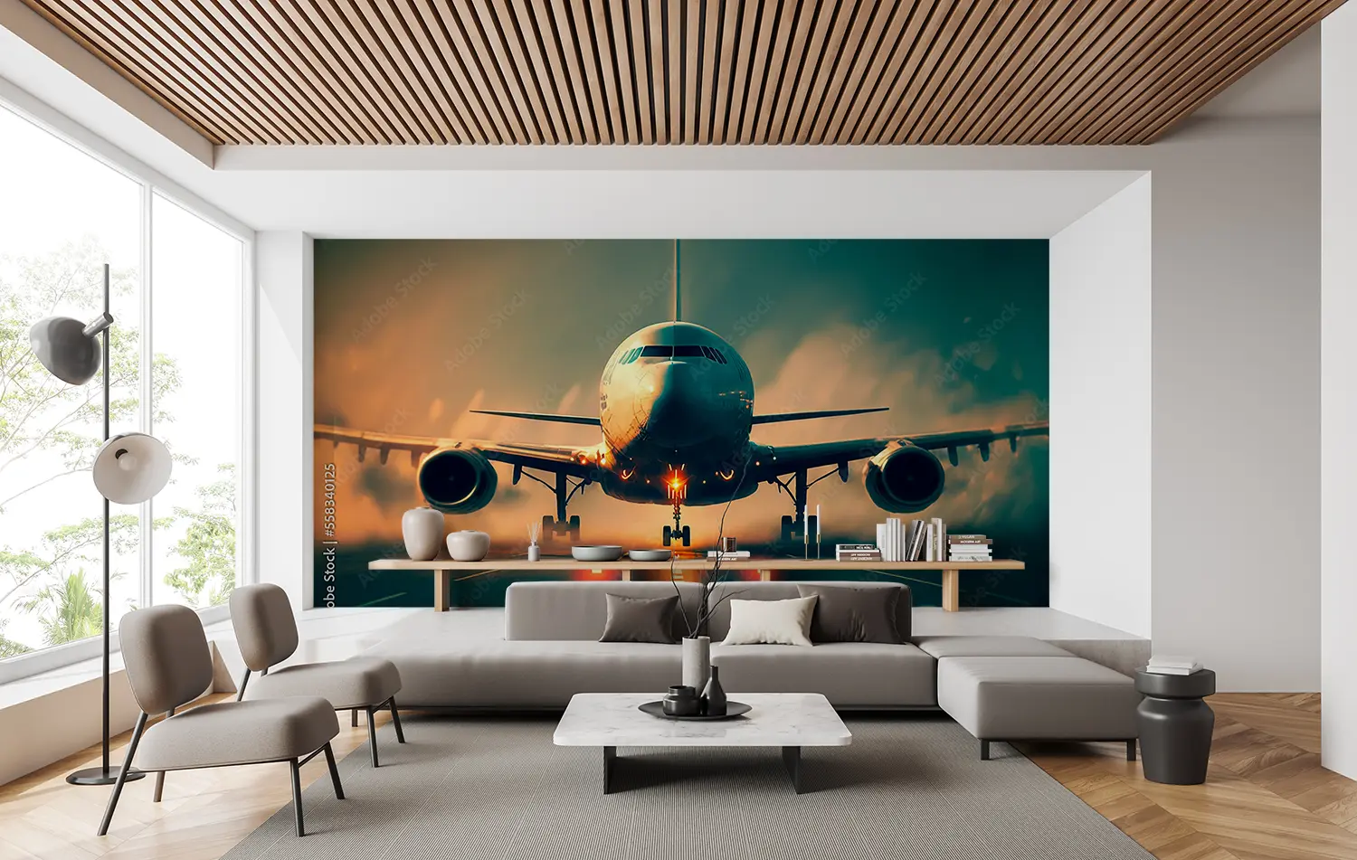 Adorn your space with the captivating image of a large jetliner elegantly taking off from an airport runway. This stunning wall art piece adds a modern and dynamic touch to any room, perfect for aviation enthusiasts or those who appreciate the beauty of travel. Complementary colors to consider are shades of blue, grey, and white for a sleek and sophisticated look.